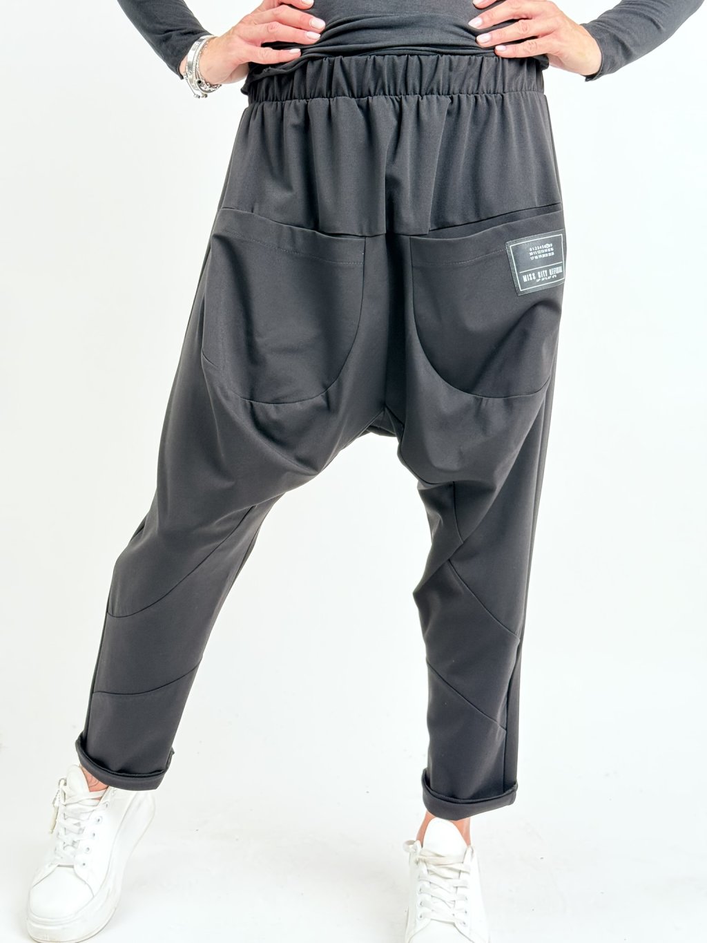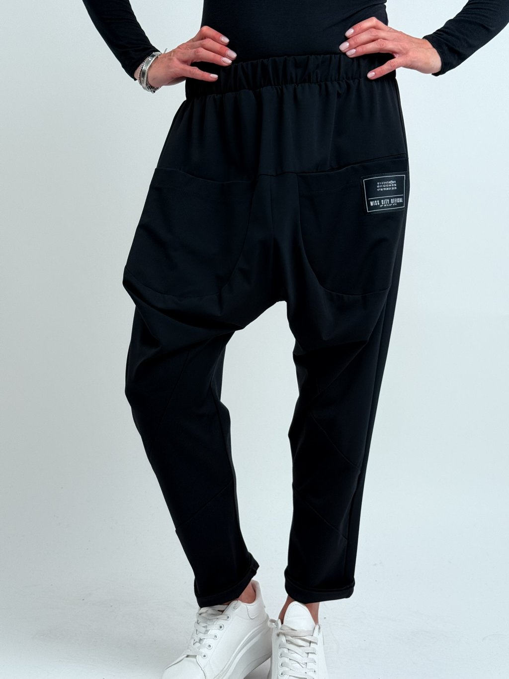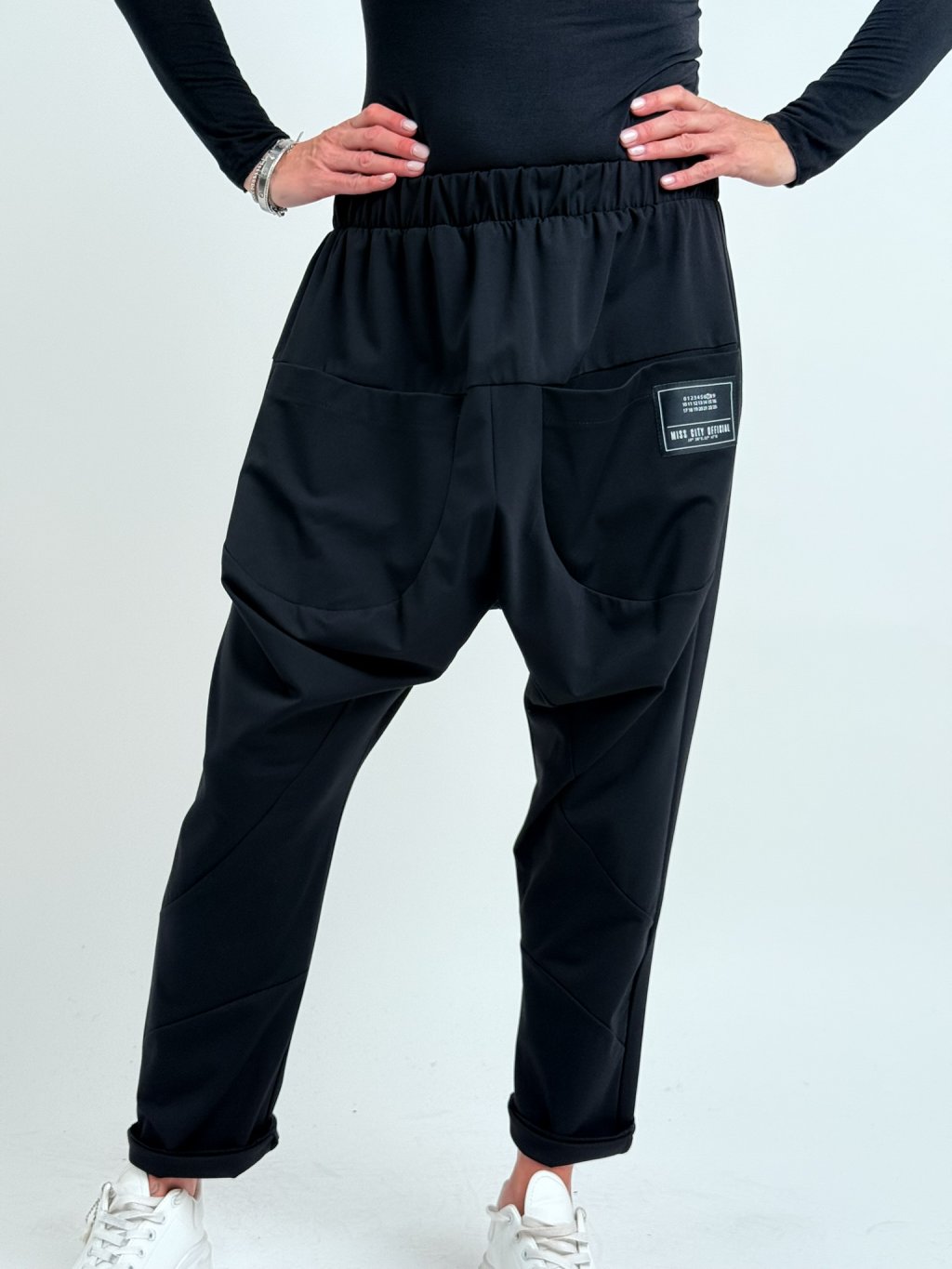 Vrecovité nohavice s elastickým pásom, vpredu s hlbokými veľkými vreckami a logom, mierne elastické.