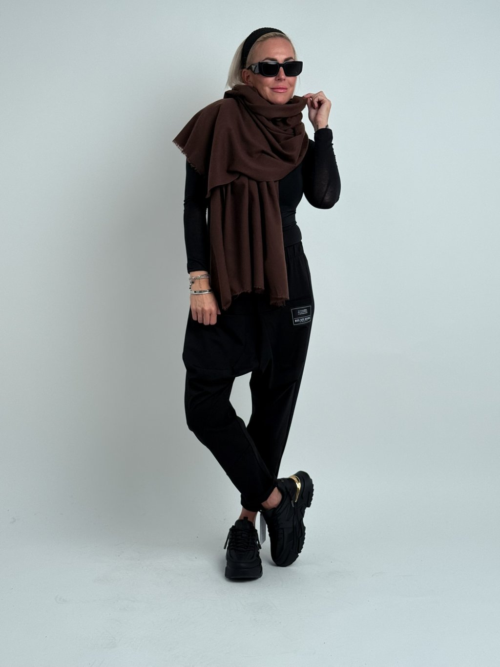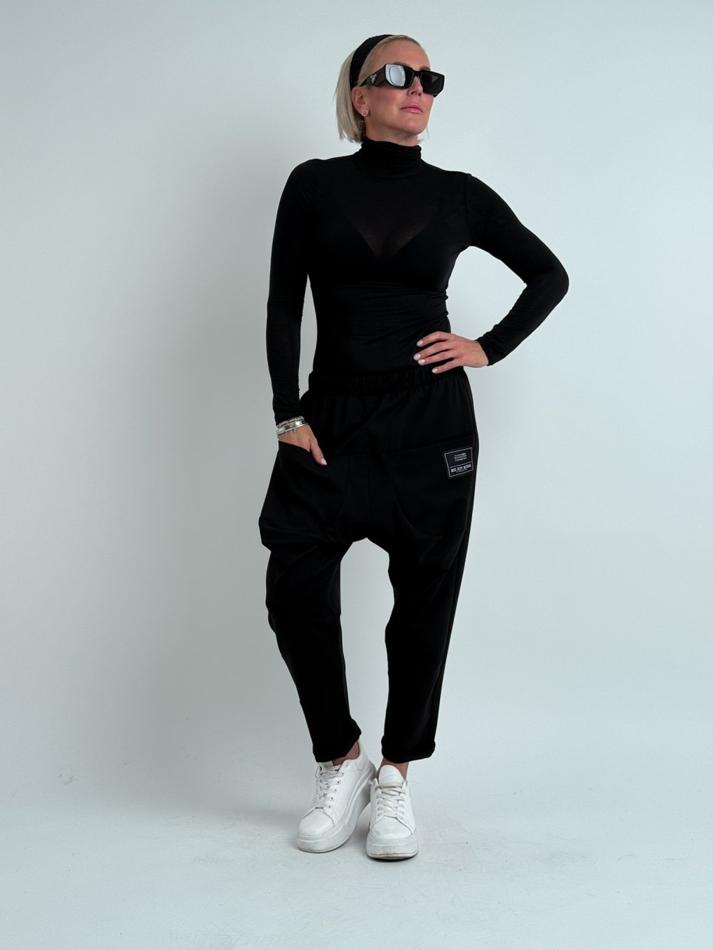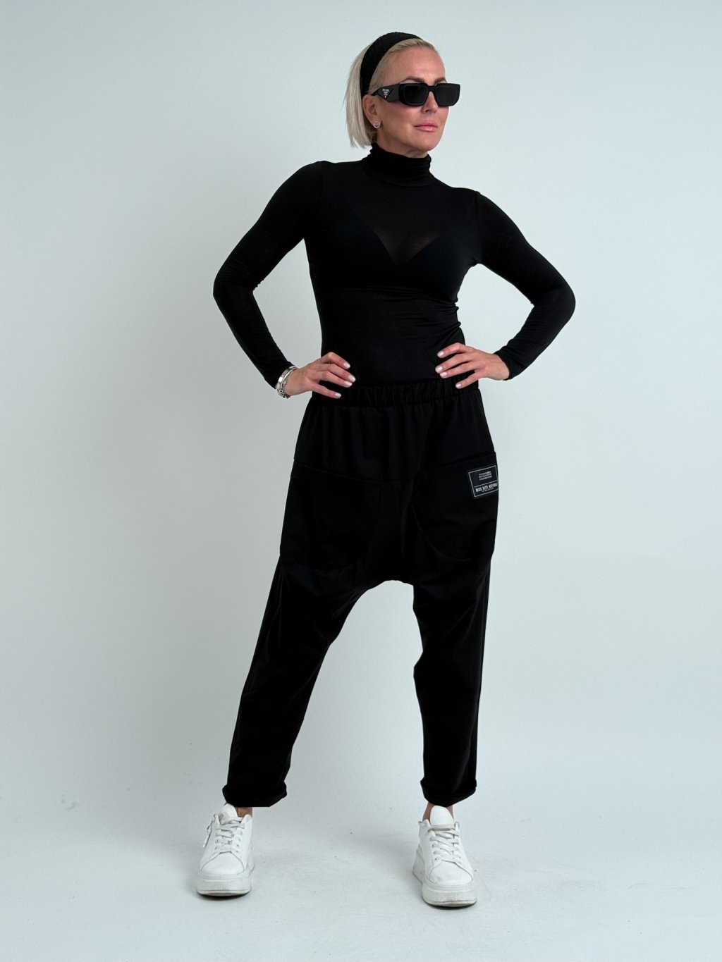 Vrecovité nohavice s elastickým pásom, vpredu s hlbokými veľkými vreckami a logom, mierne elastické.