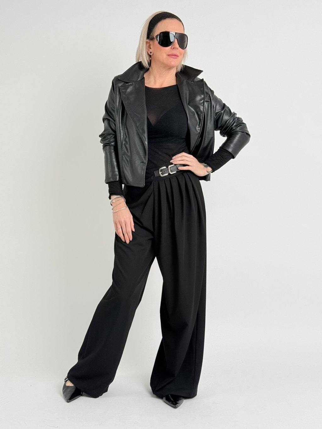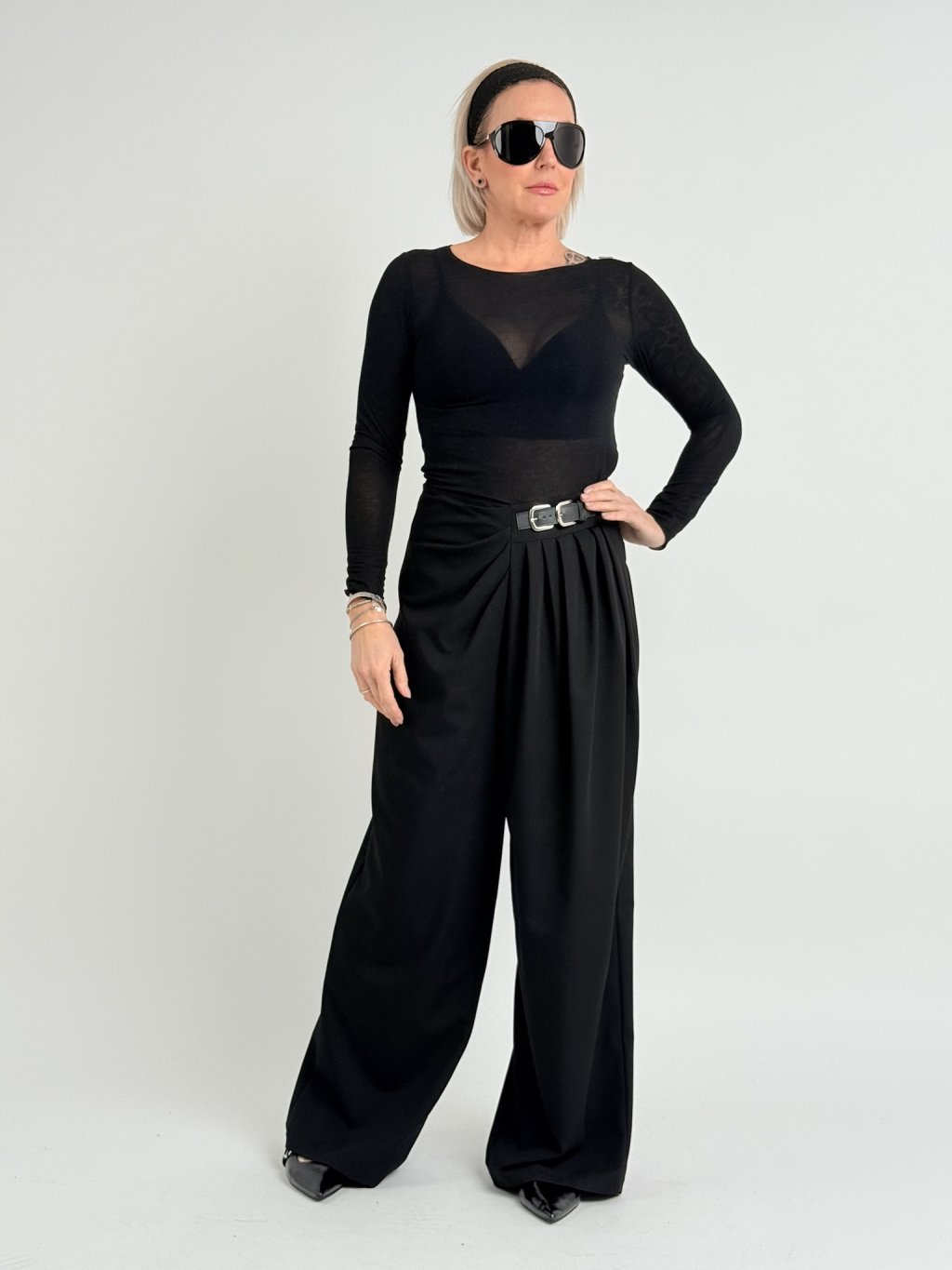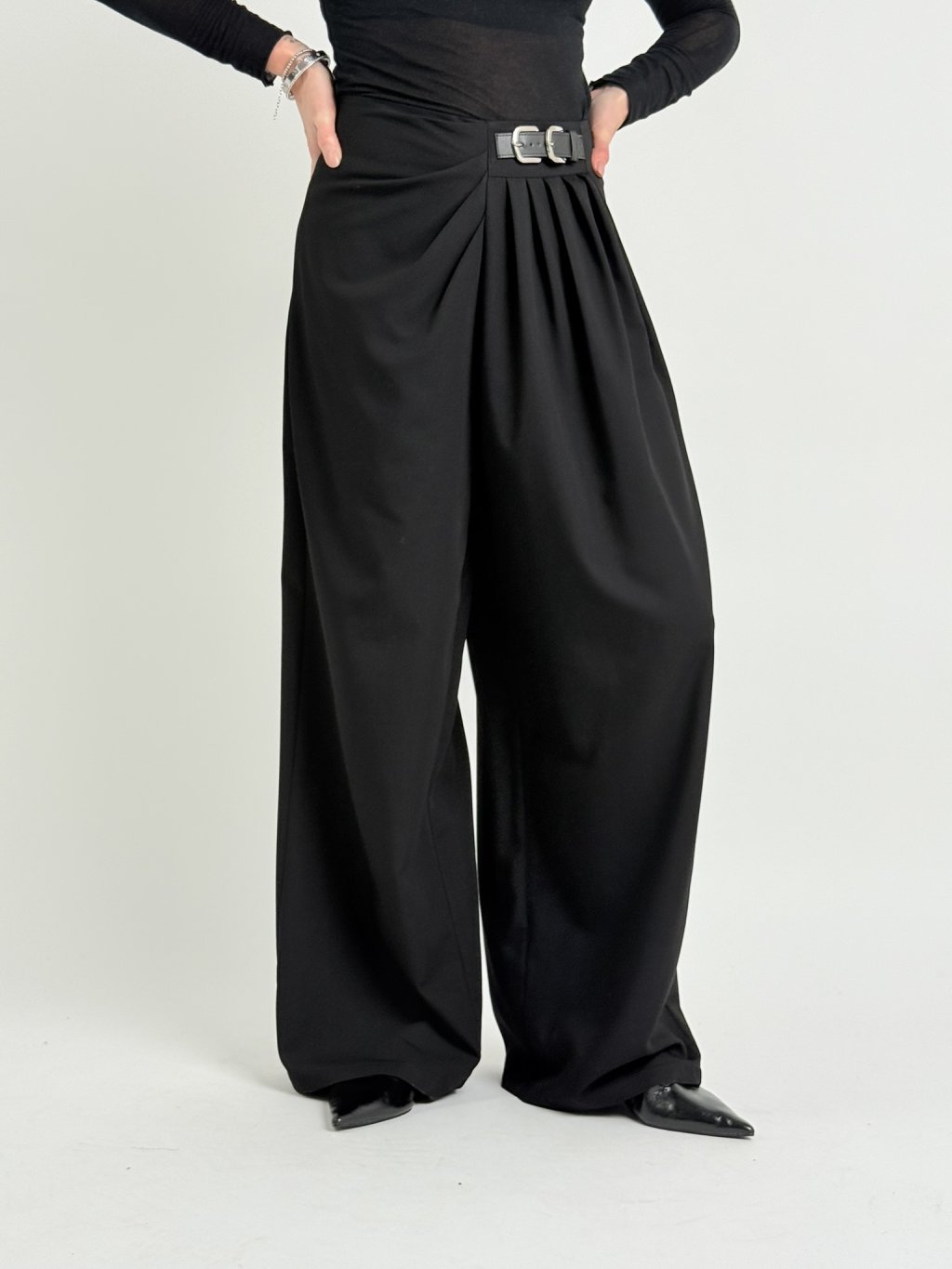 Široké nohavice s predným pásom a koženým opaskom, ktorým možno upraviť šírku pása. Na boku je zips a vzadu vrecká.