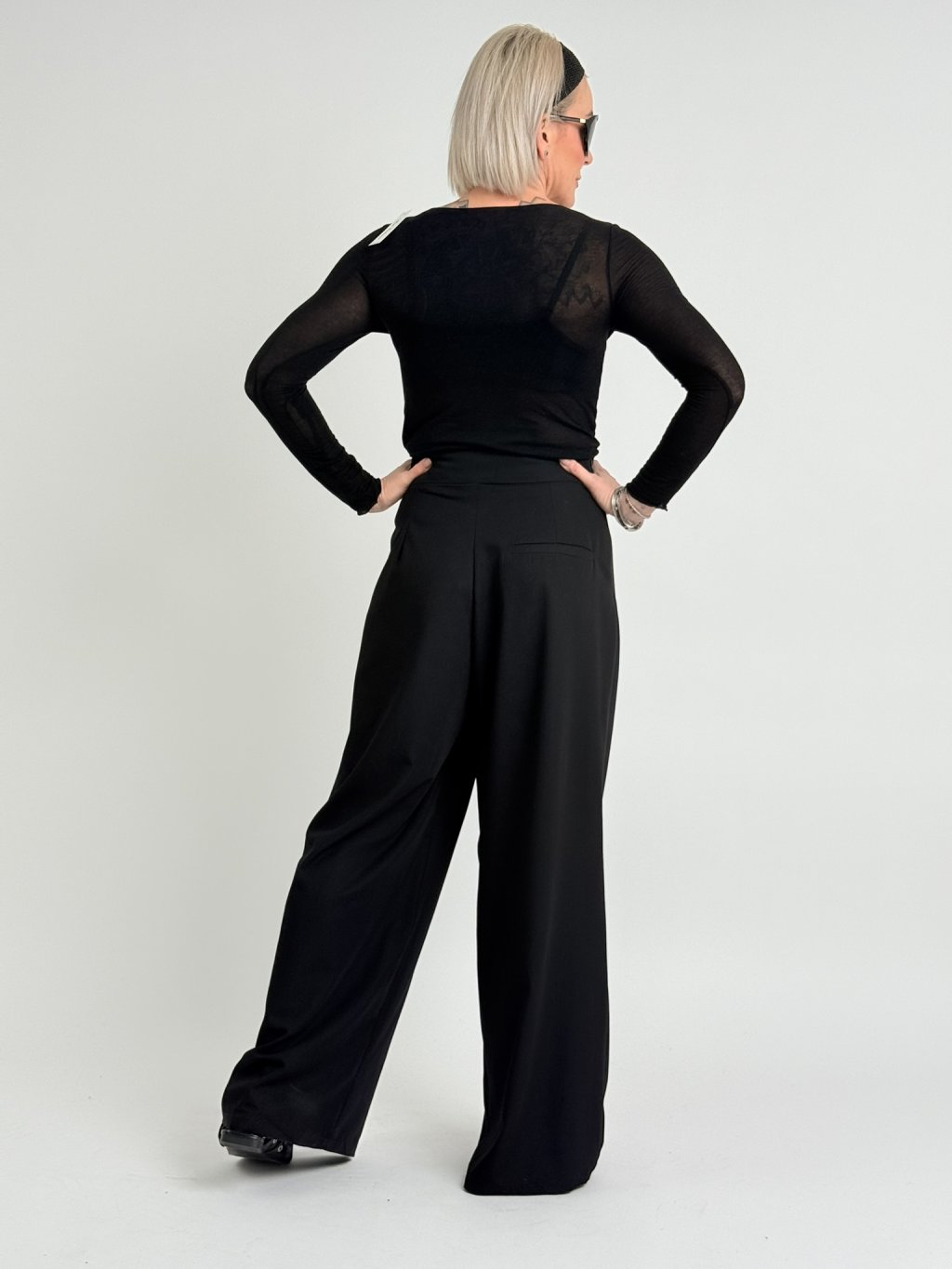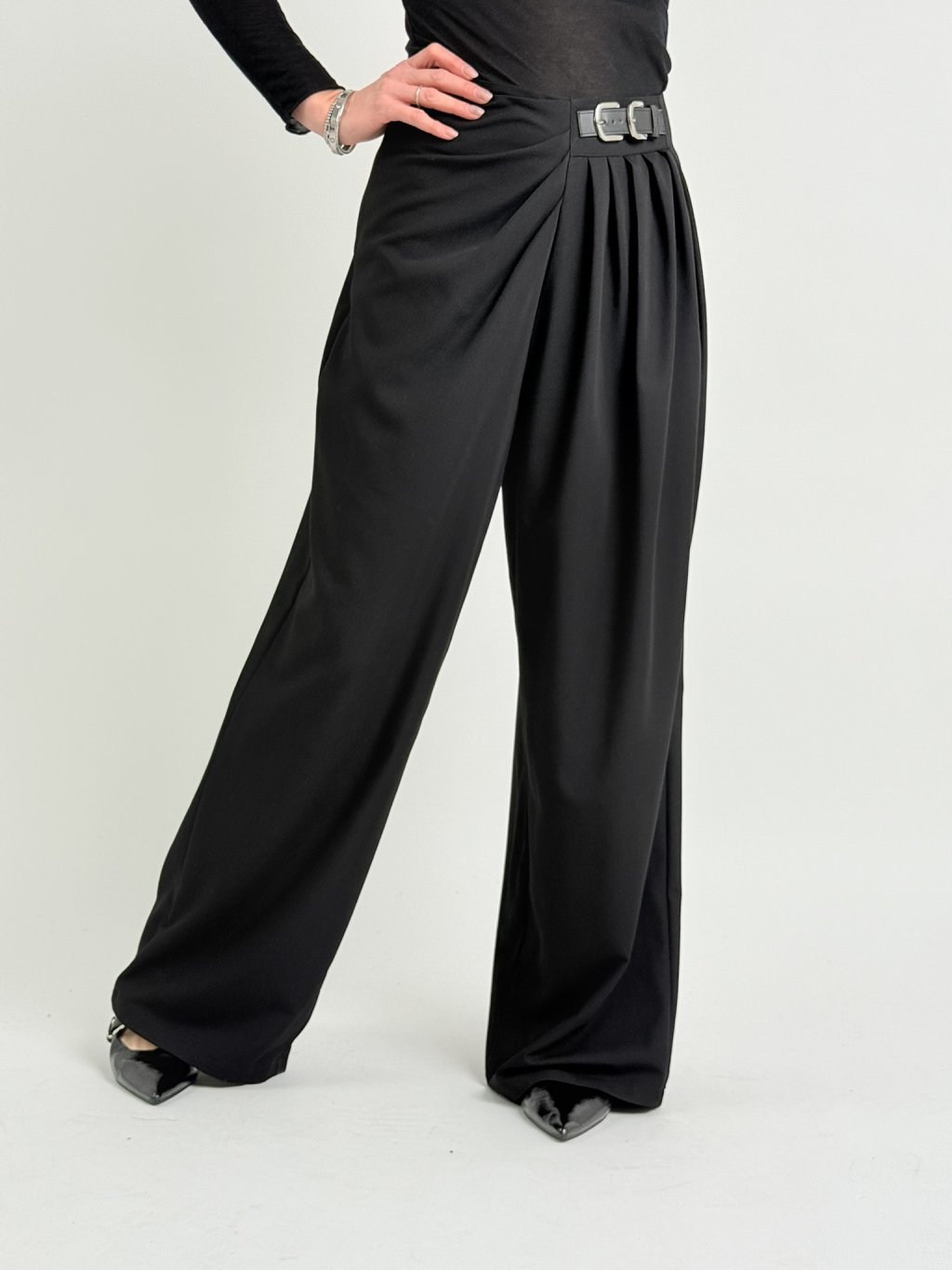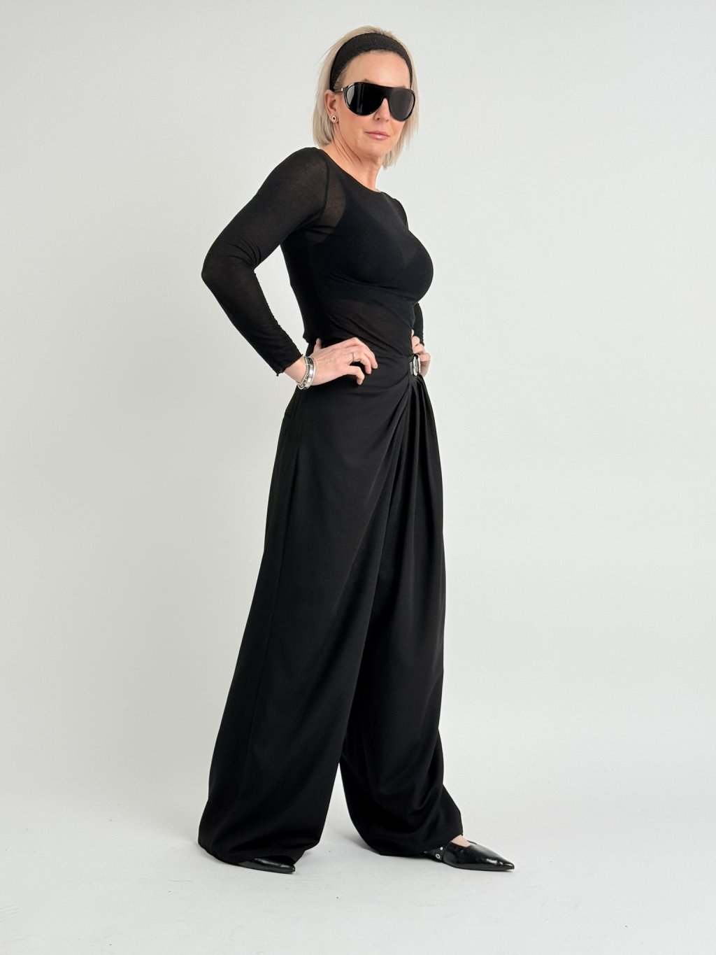 Široké nohavice s predným pásom a koženým opaskom, ktorým možno upraviť šírku pása. Na boku je zips a vzadu vrecká.