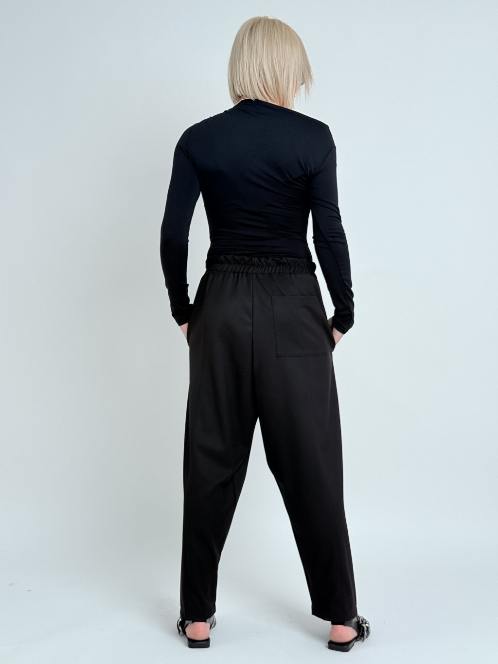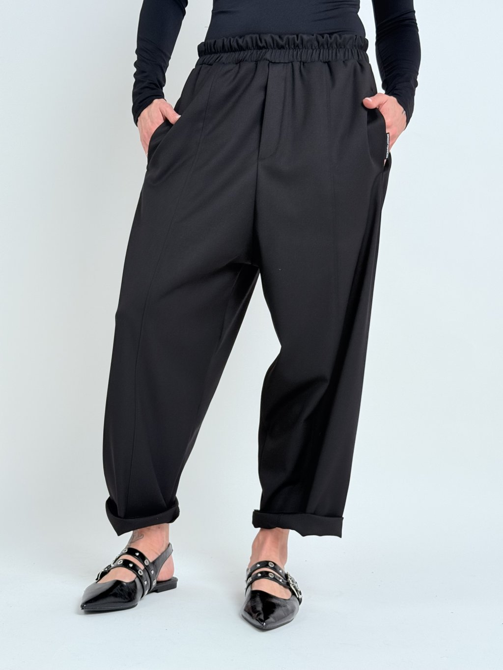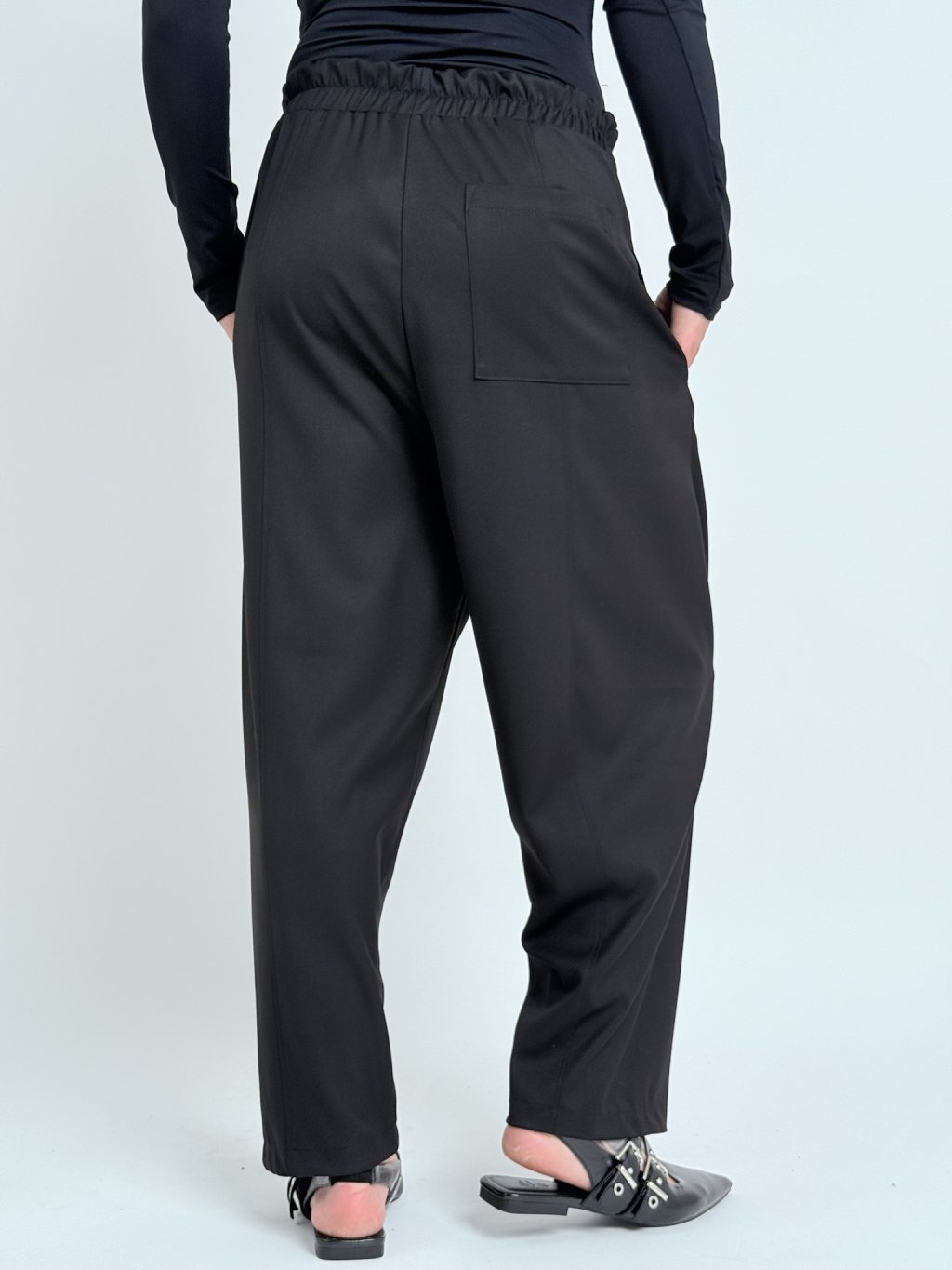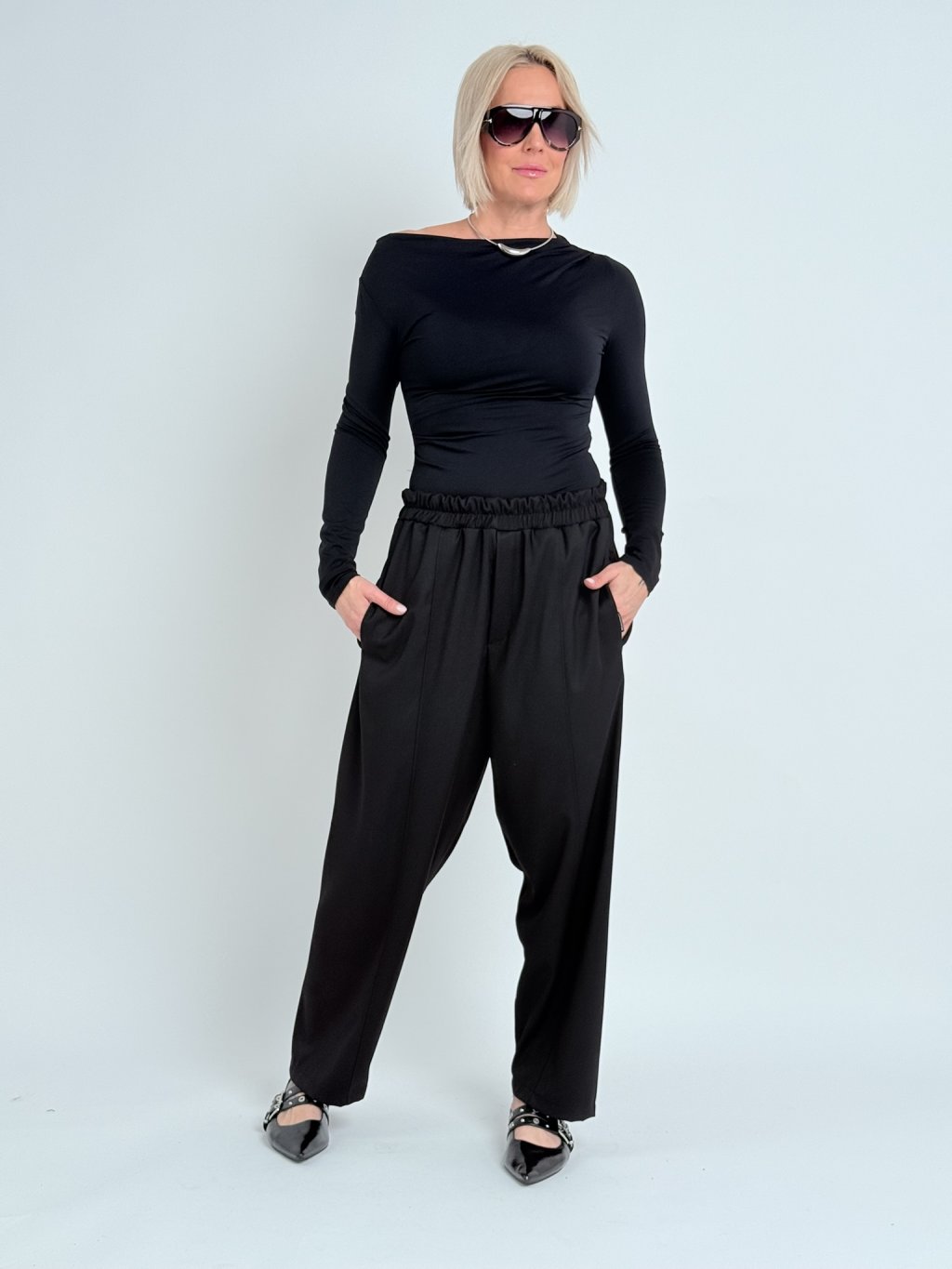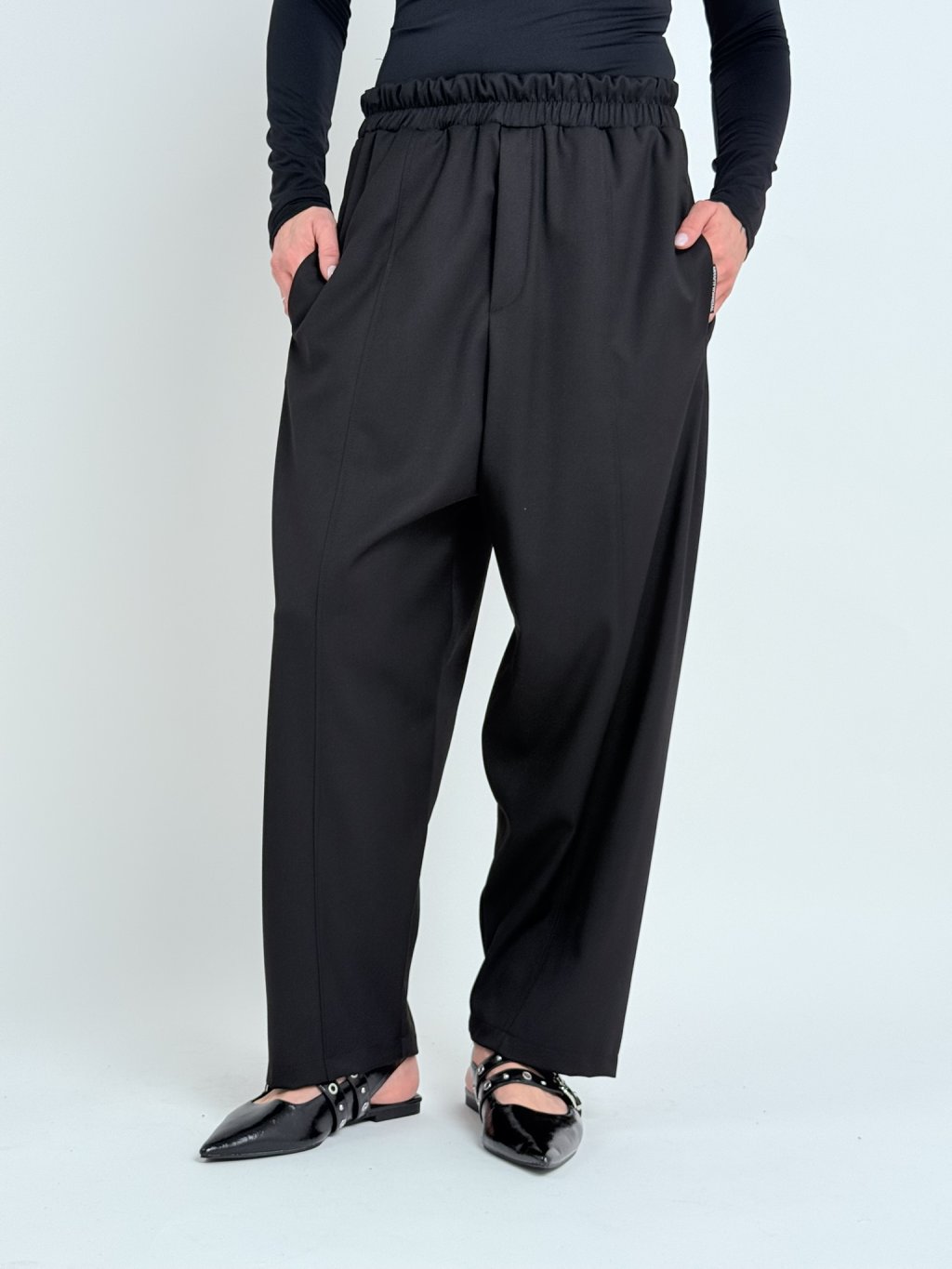 Skvelé, jednoduché, širšie nohavice so zníženým sedom, elastickým pásom, s vreckami a bočnými vreckami.