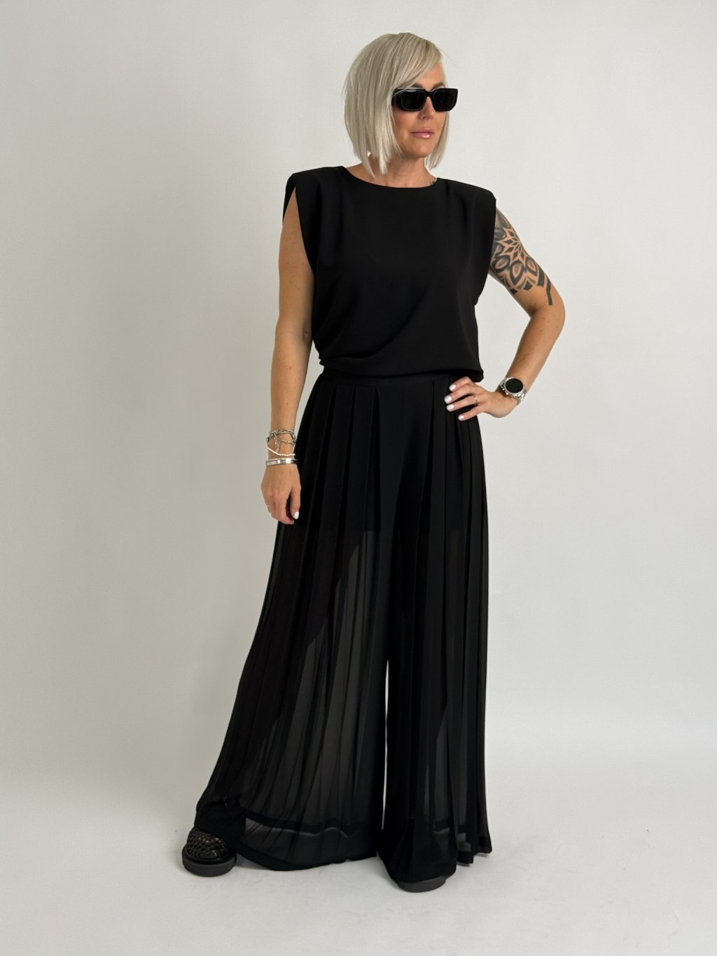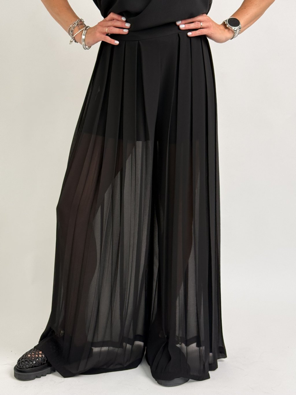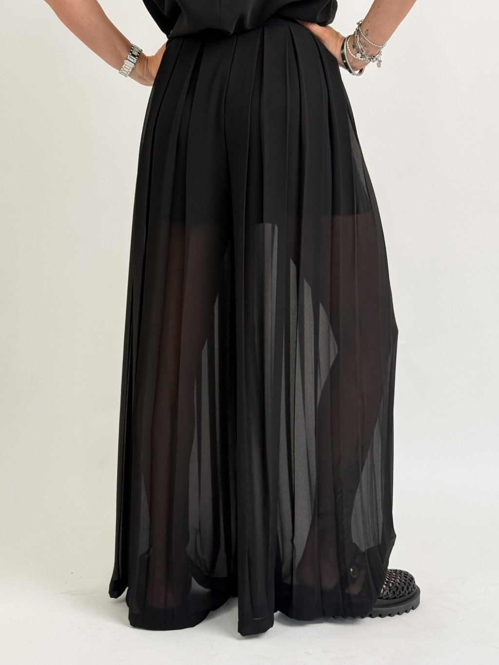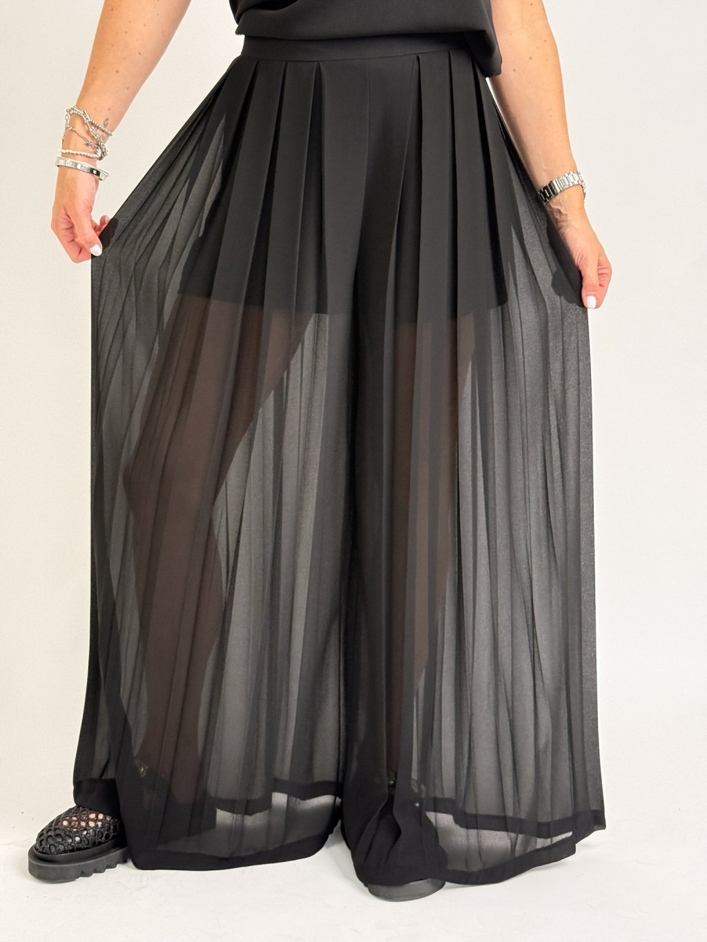 Luxusné široké plisované šifónové nohavice so všitou krátkou podšívkou, opaskom v páse a zapínaním na zips.