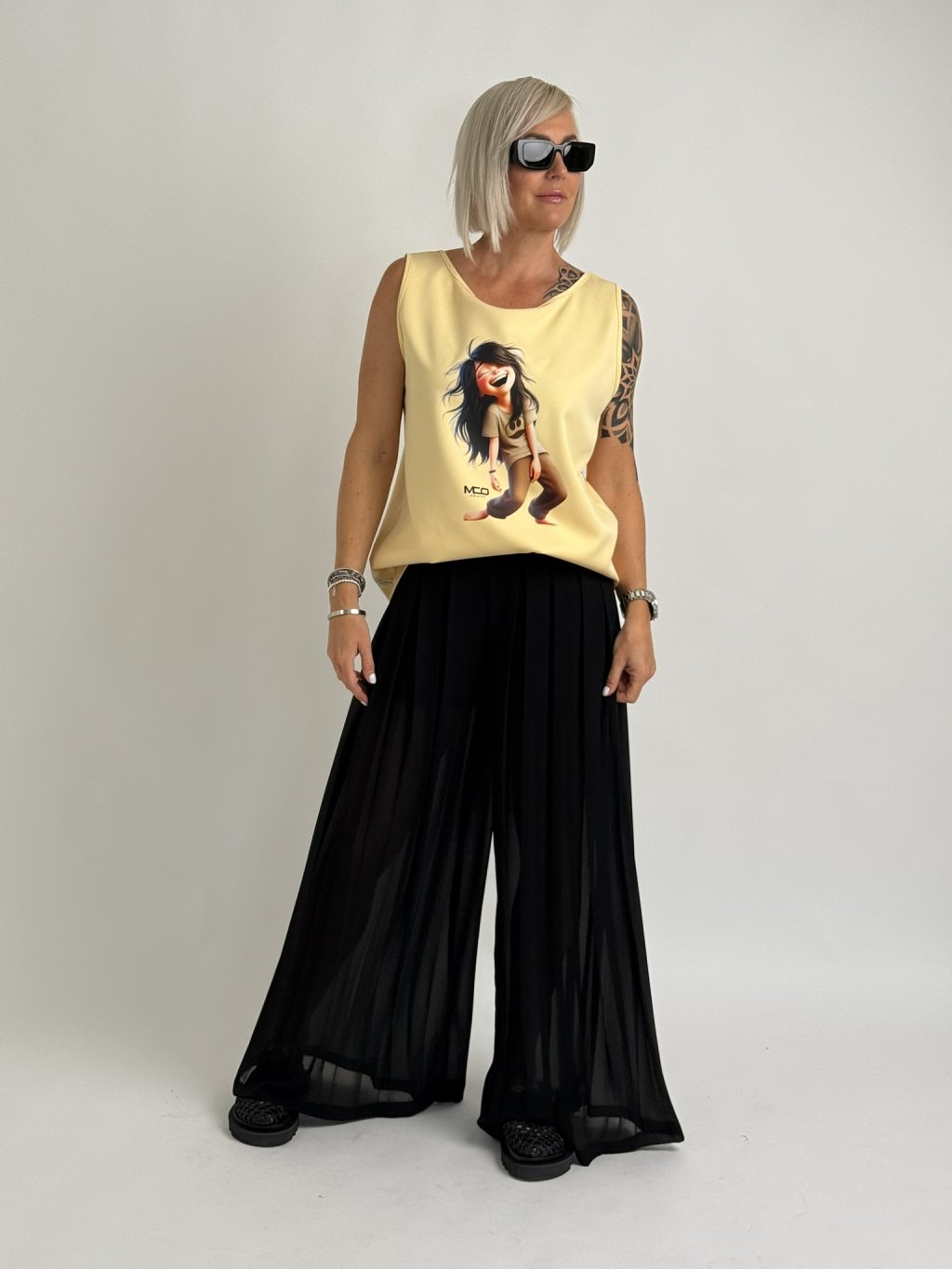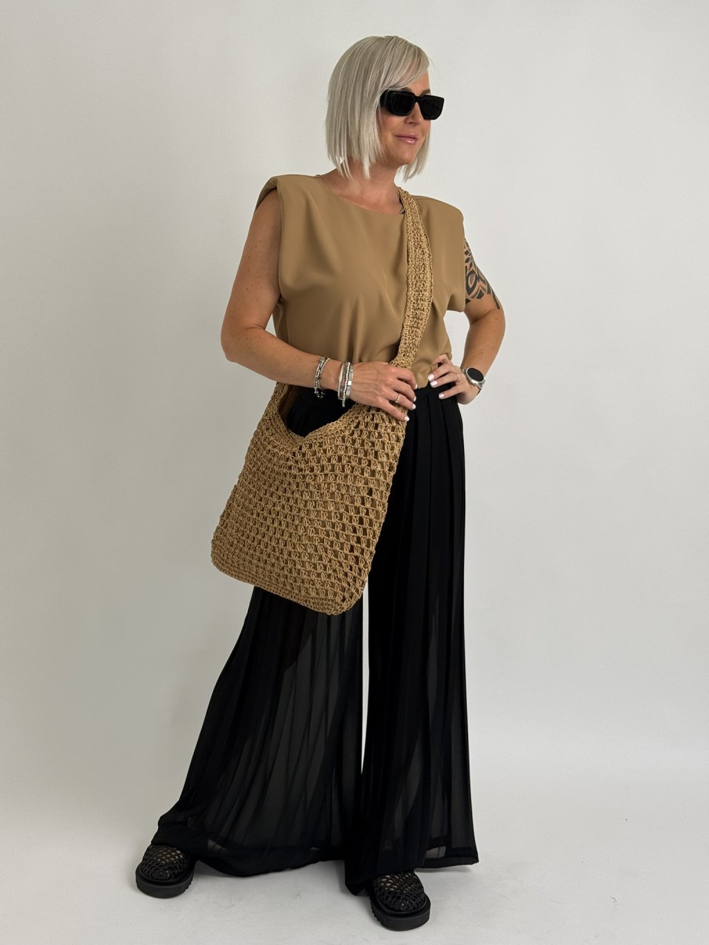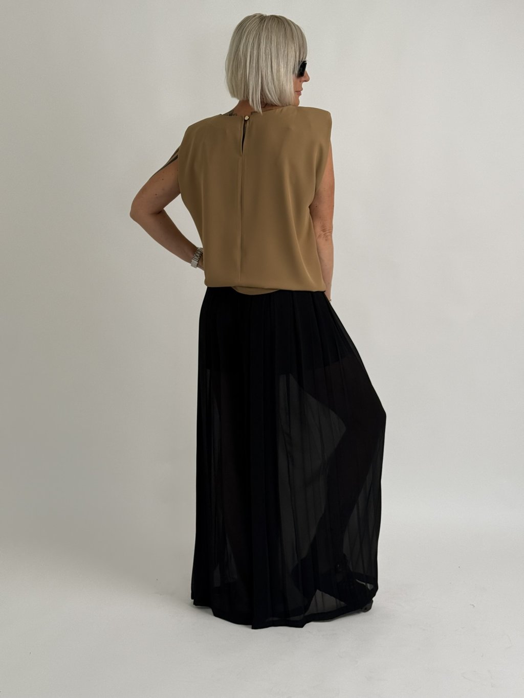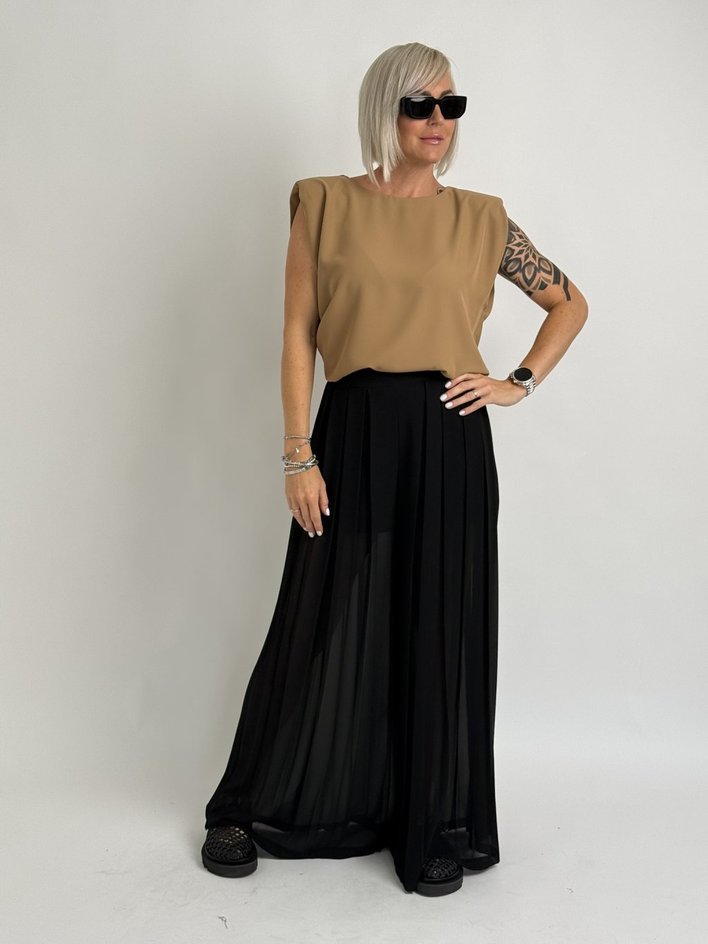 Luxusné široké plisované šifónové nohavice so všitou krátkou podšívkou, opaskom v páse a zapínaním na zips.