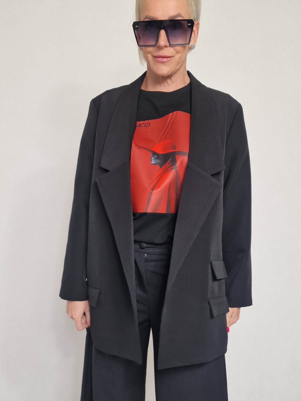 Elegantná bunda nadrozmernej veľkosti s podšívkou, bez zapínania a s farebným obrázkom na chrbte.