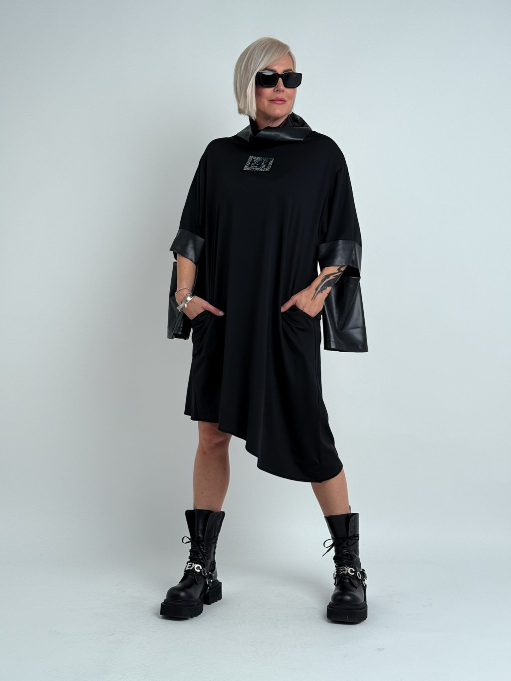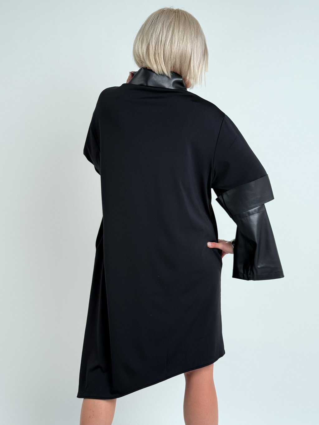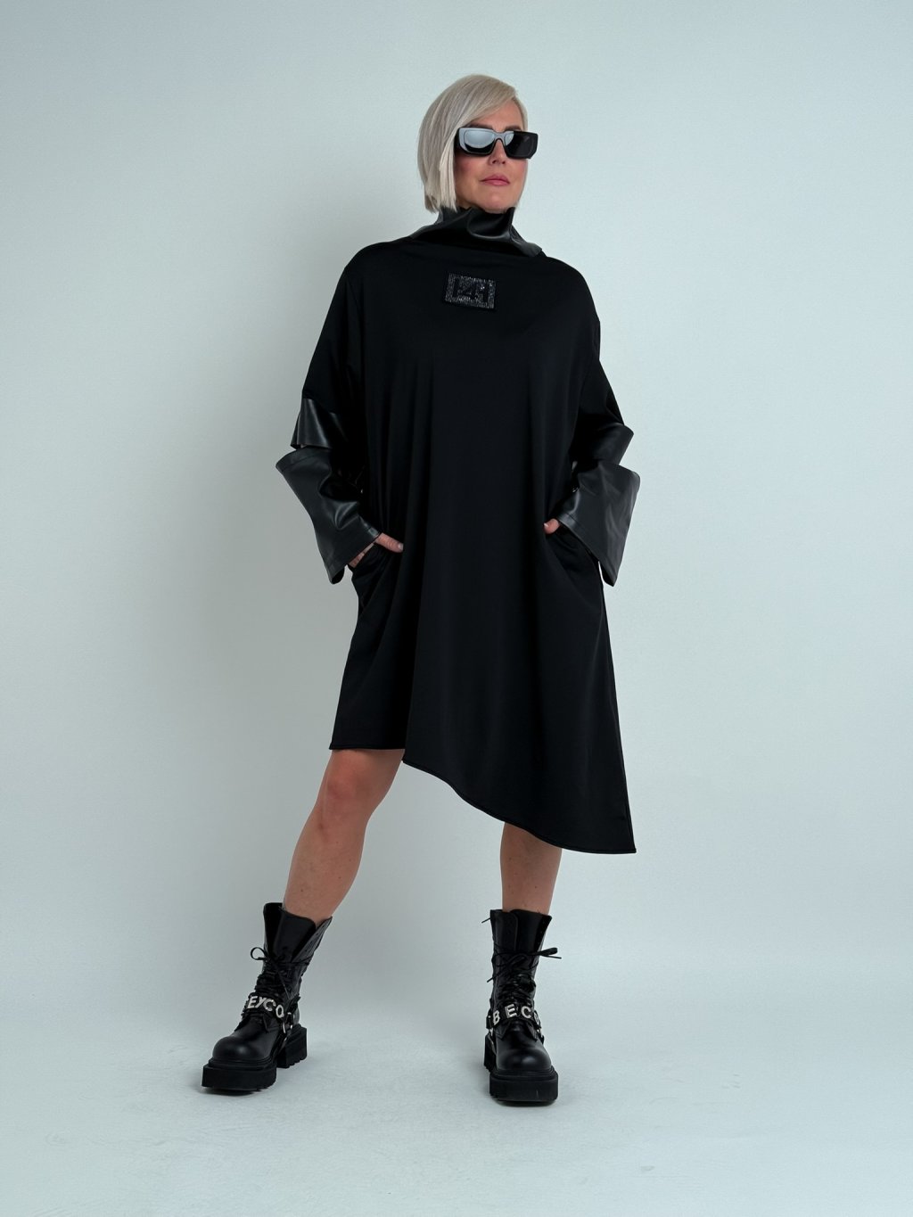 Perfektné, asymetricky riešené šaty v kombinácii s koženkou na rukávoch a pri krku.MIERKA, ŠATY VYHOVUJÚ VEĽKÝM VEĽKOSŤAM!!!!