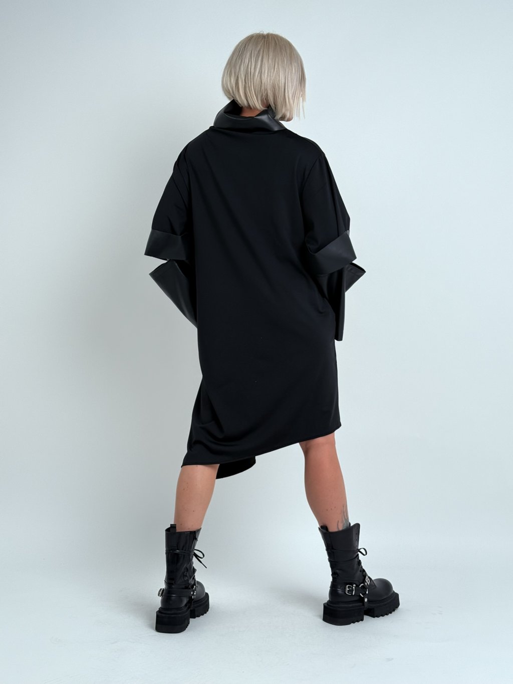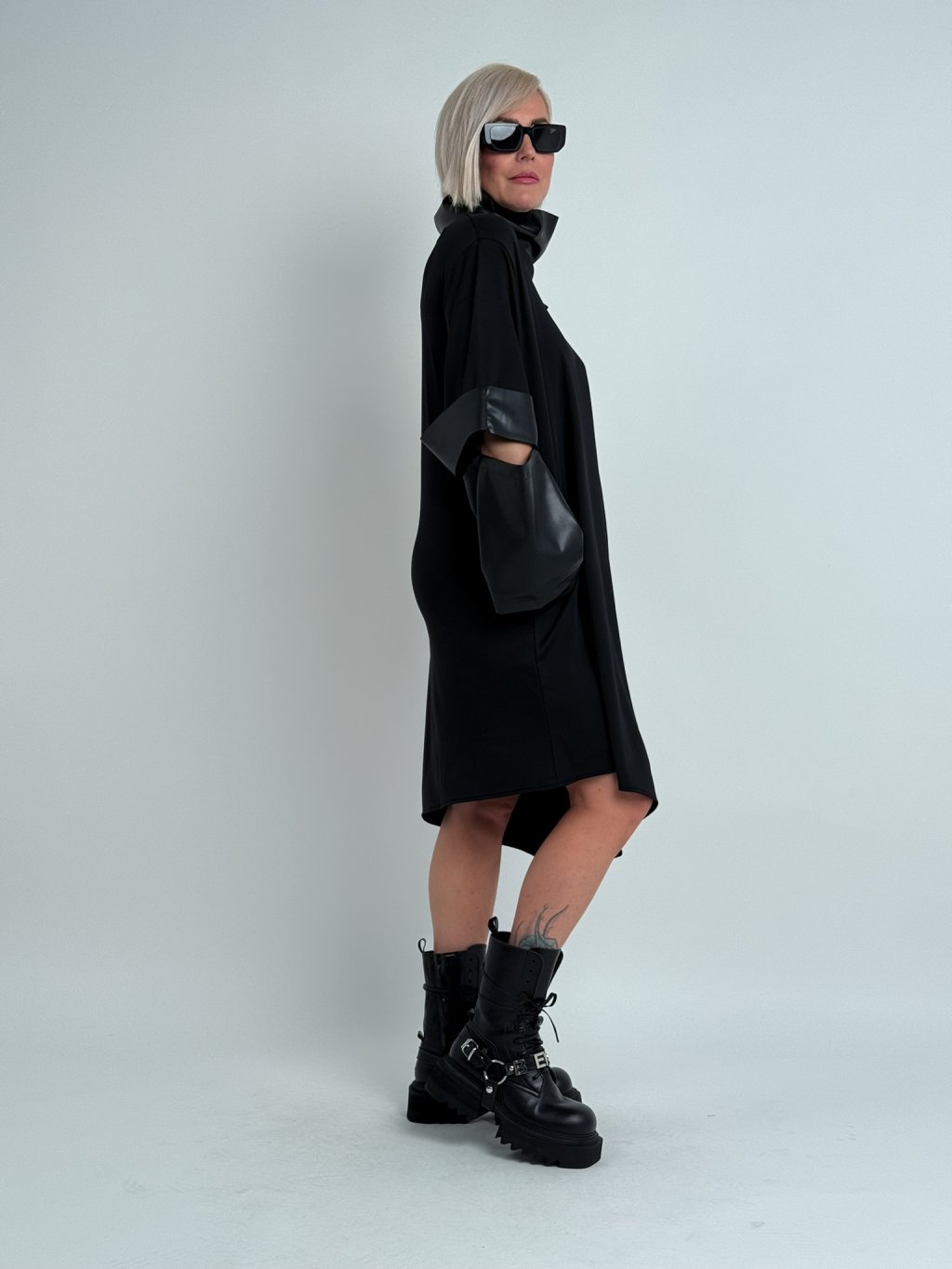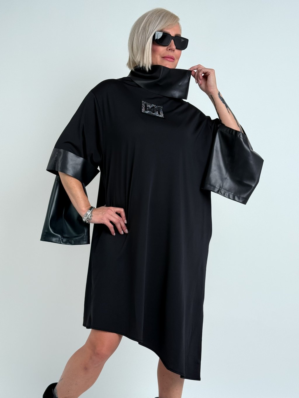 Perfektné, asymetricky riešené šaty v kombinácii s koženkou na rukávoch a pri krku.MIERKA, ŠATY VYHOVUJÚ VEĽKÝM VEĽKOSŤAM!!!!