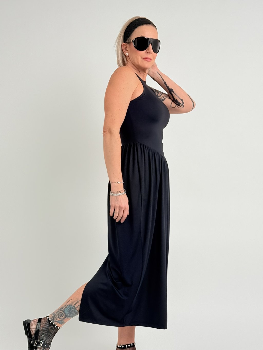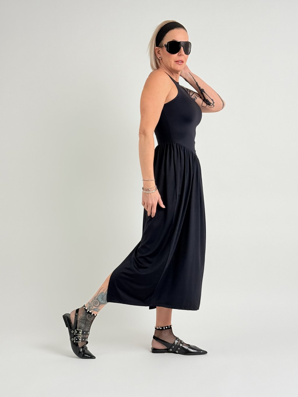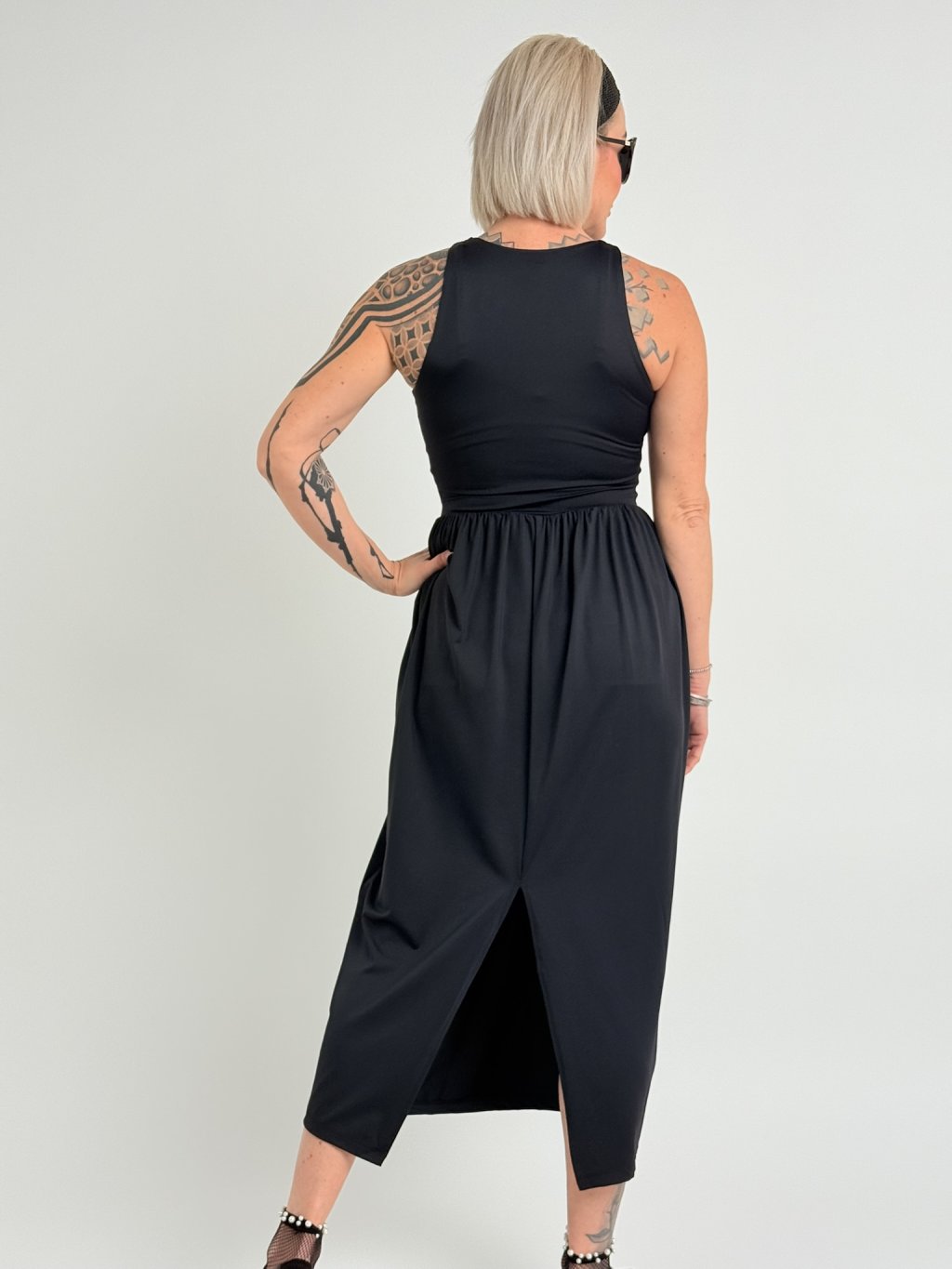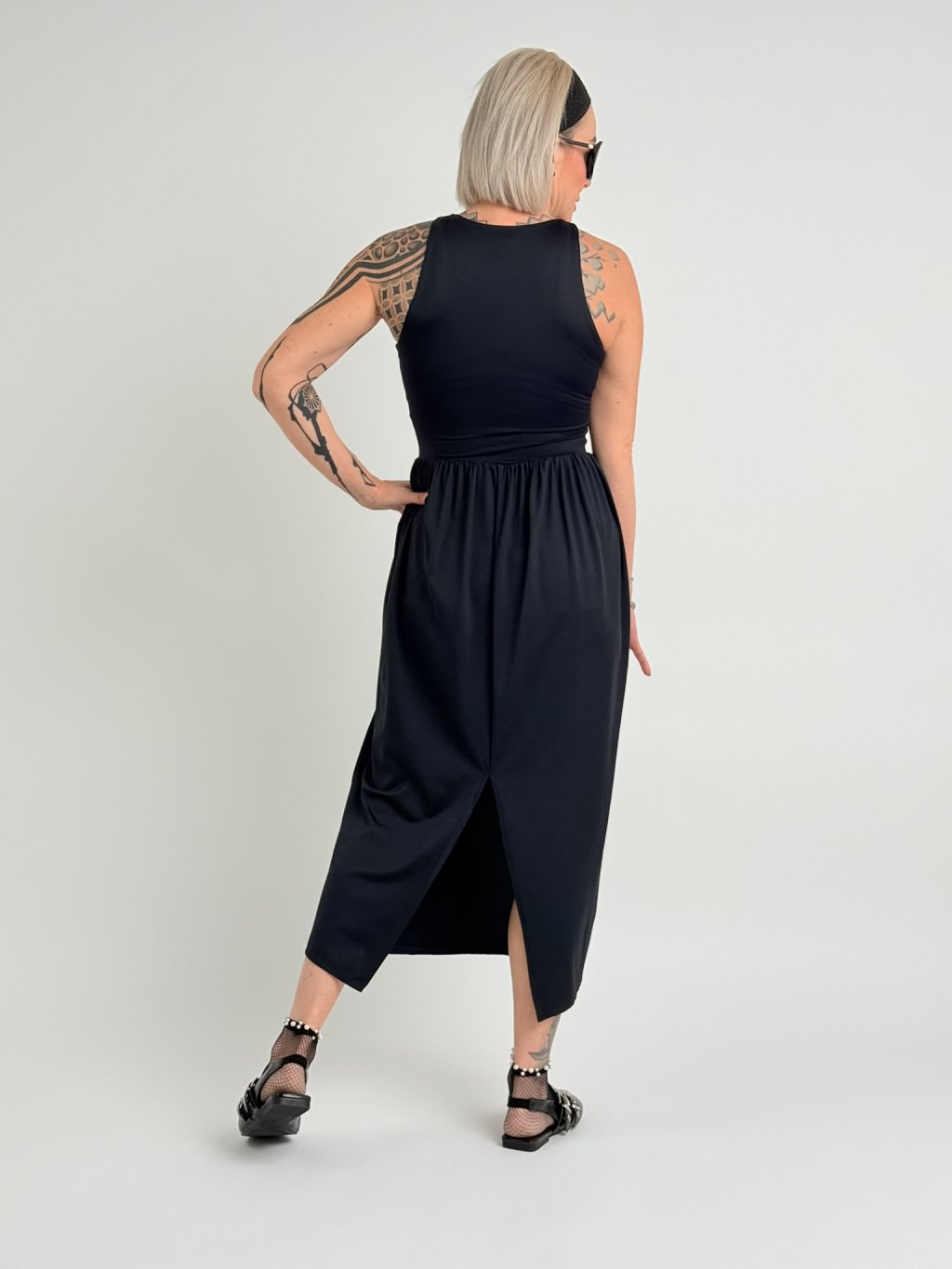 Elastické šaty v 7/8 dĺžke, bez rukávov, s rozšírenou sukňou, rozparkom na chrbte a kratšou všitou spodničkou.