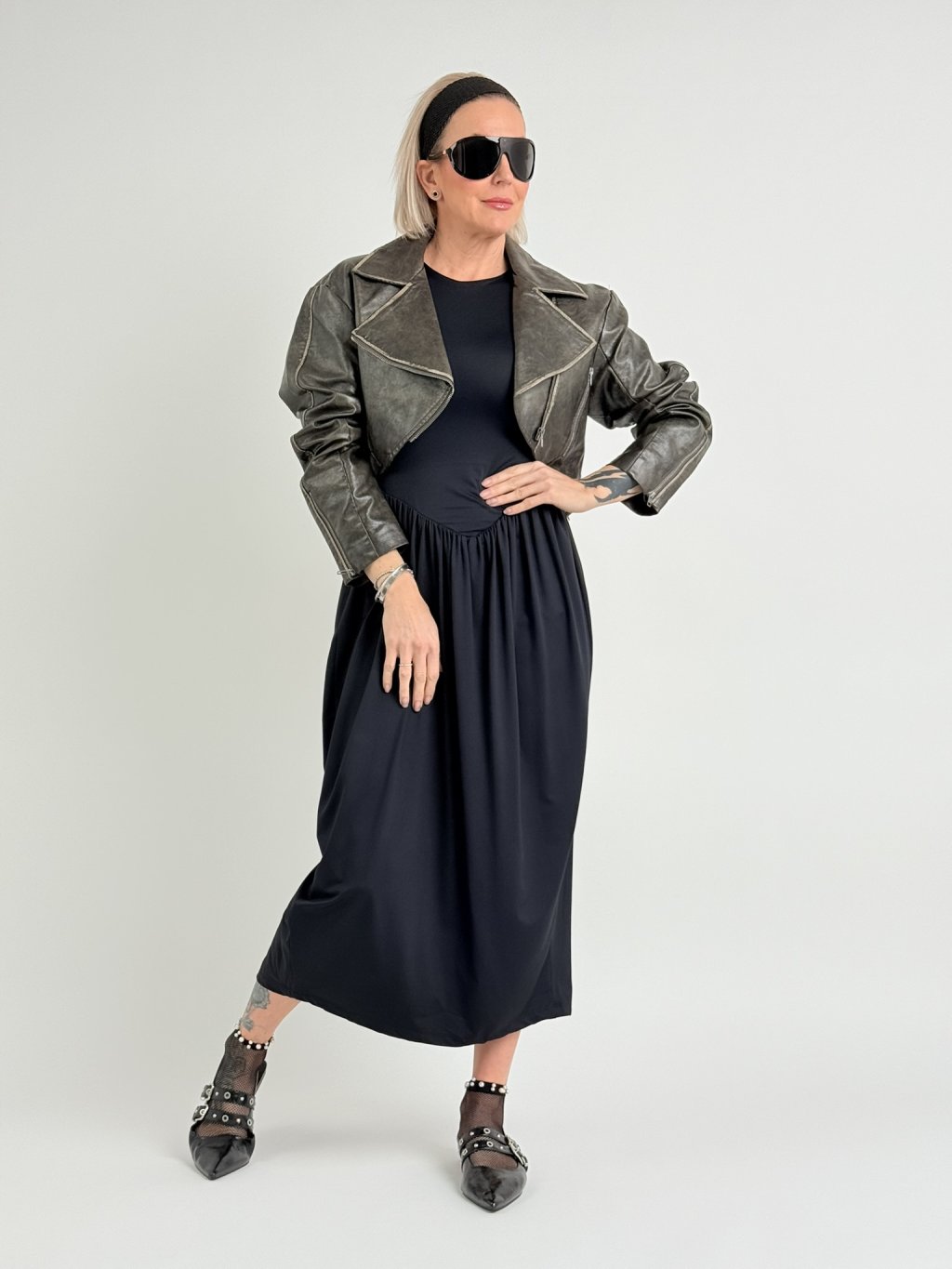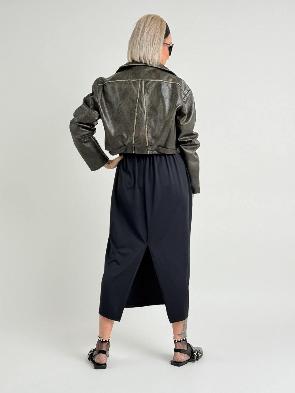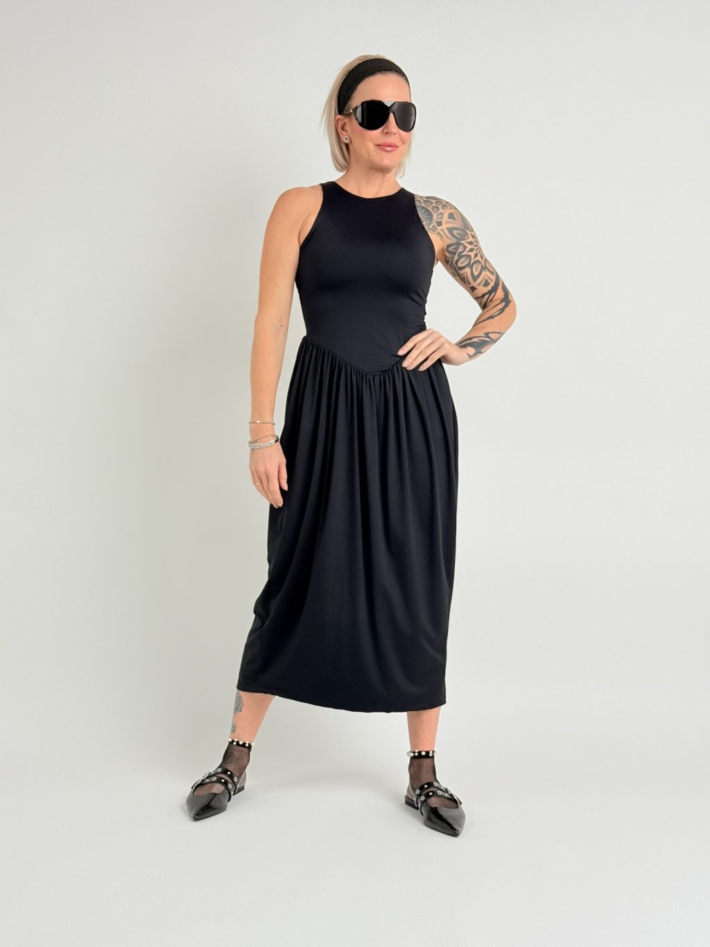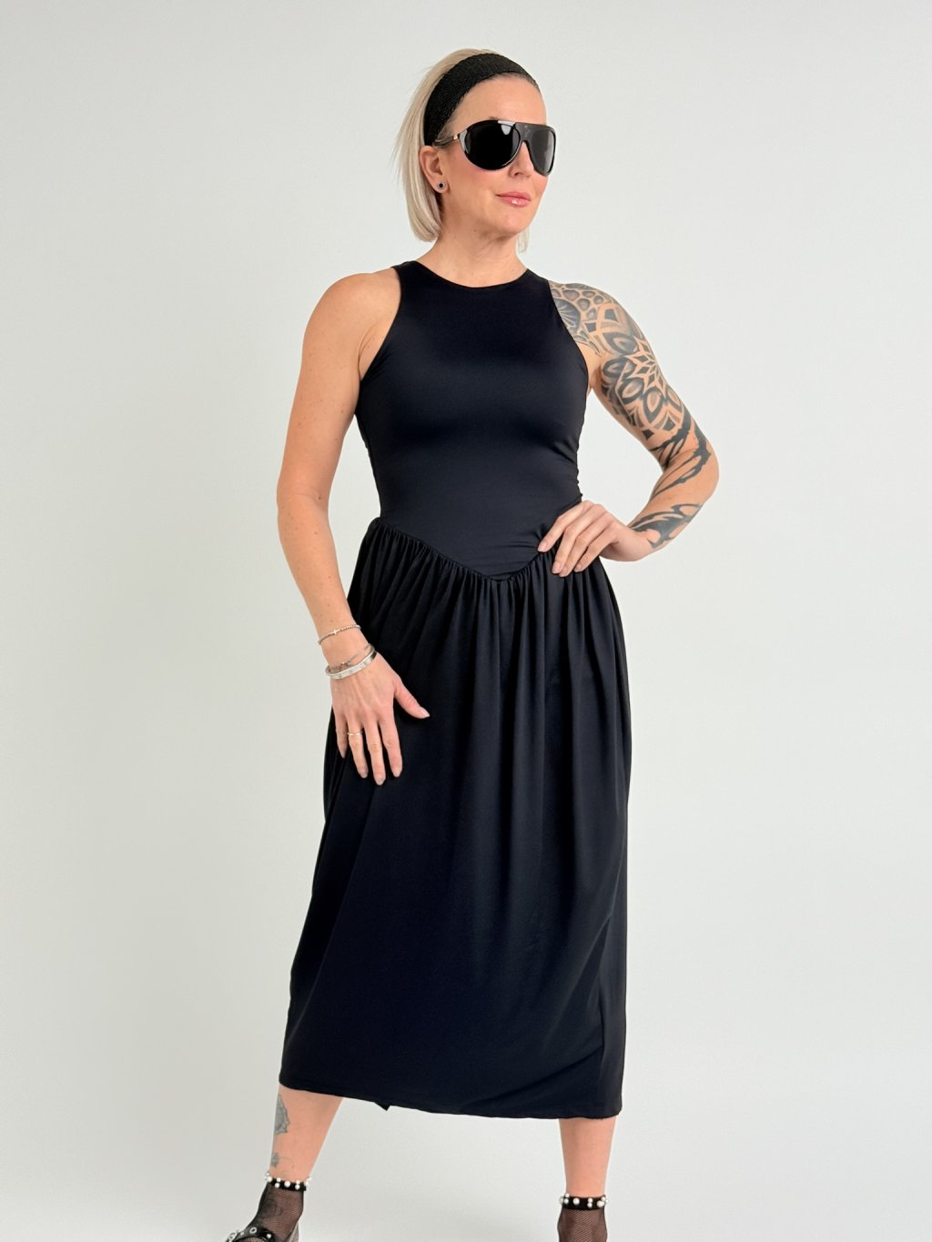 Elastické šaty v 7/8 dĺžke, bez rukávov, s rozšírenou sukňou, rozparkom na chrbte a kratšou všitou spodničkou.