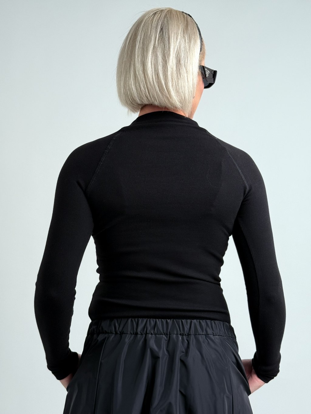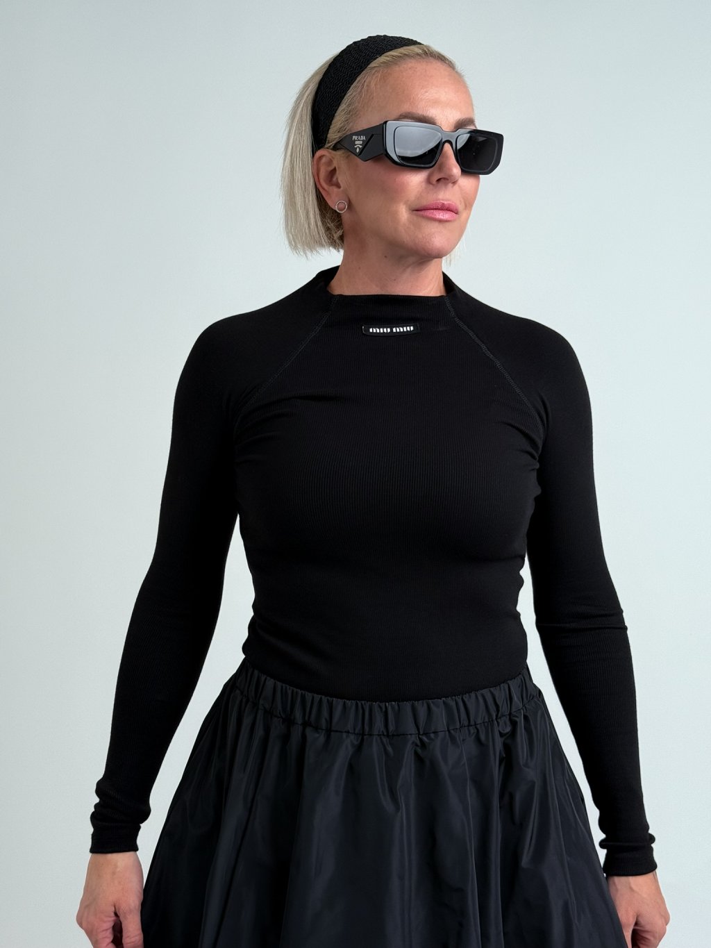 Jednoduchá košeľa s dlhými rukávmi so stojatým golierom a výšivkou na prednej strane. Veľmi elastická.