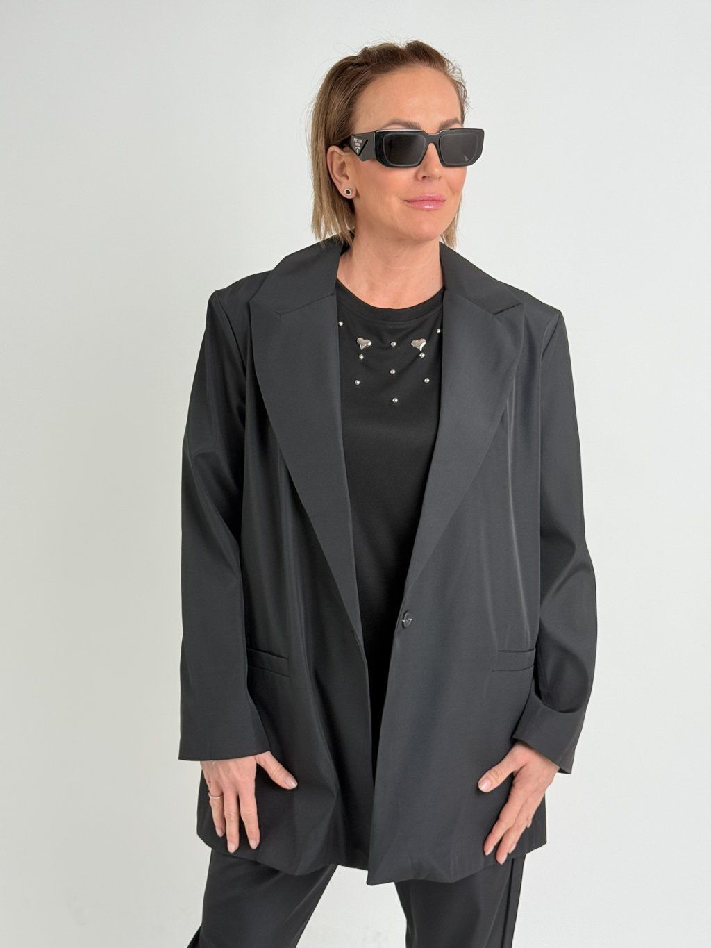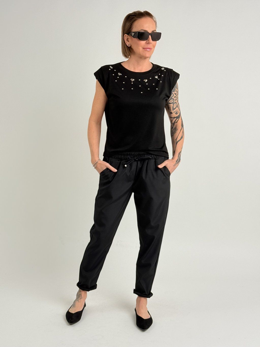Veľmi elastické tričko s padavým rukávom, manžetou, vypchávkami a kovovými srdiečkami na prednej strane.