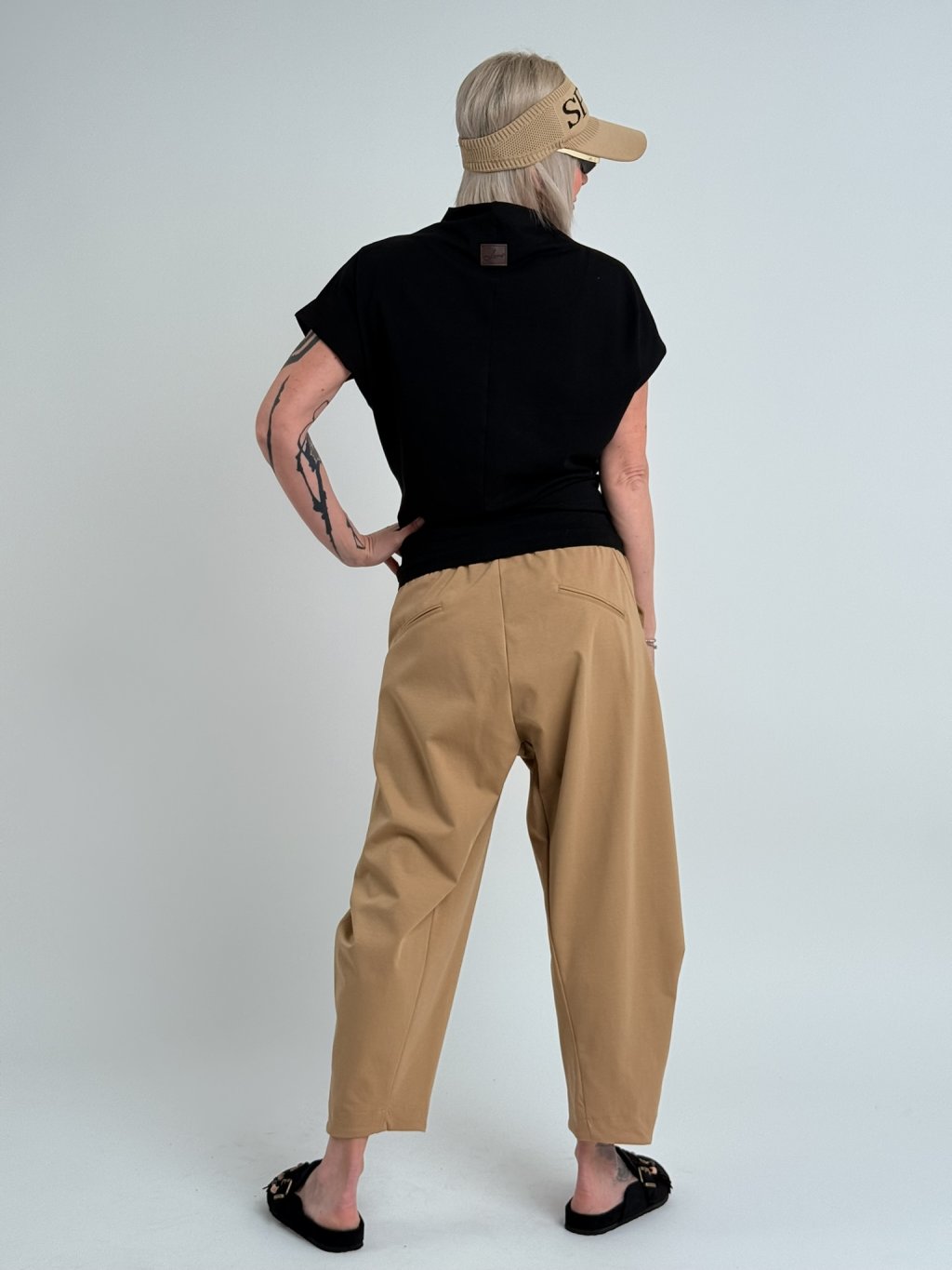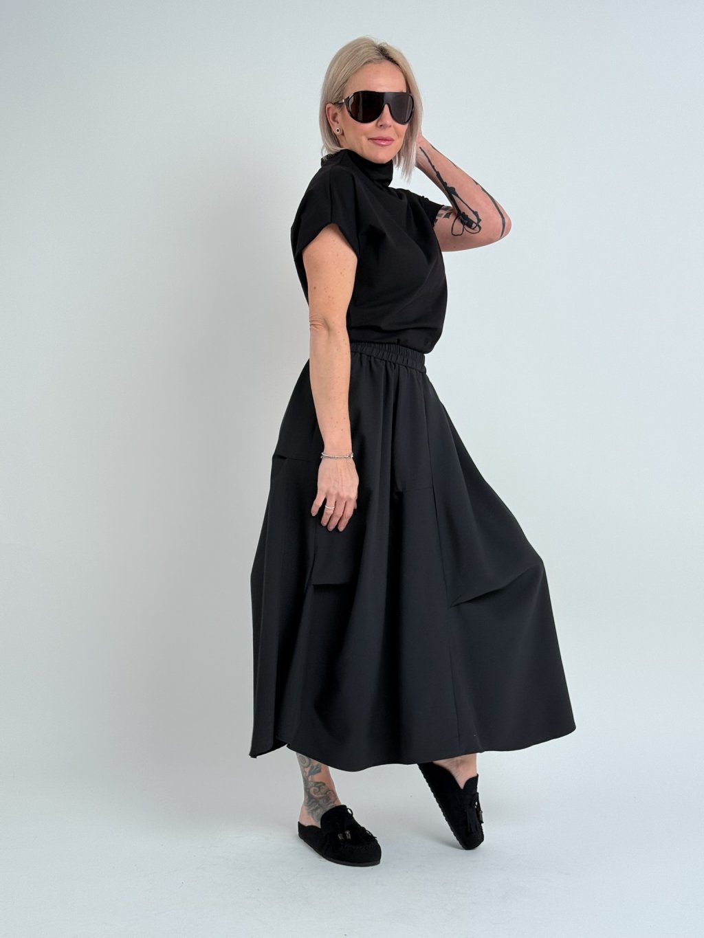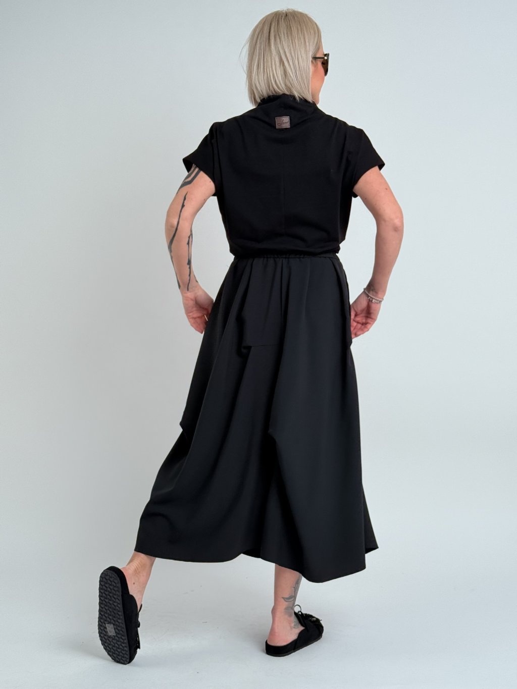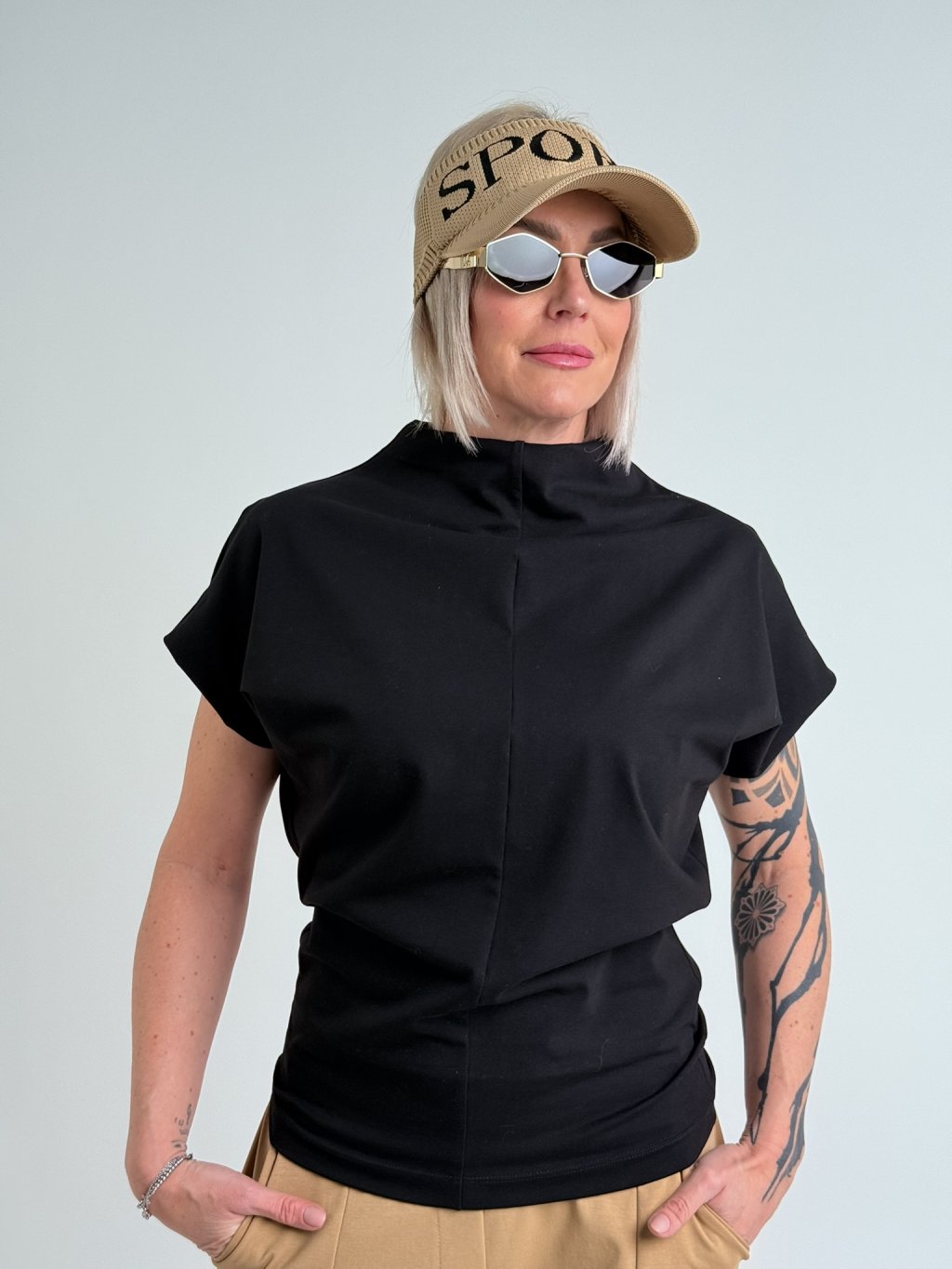 Jednoduché, pohodlné, mierne elastické tričko so spadnutými rukávmi a stojatým golierom.