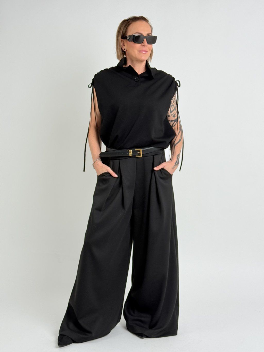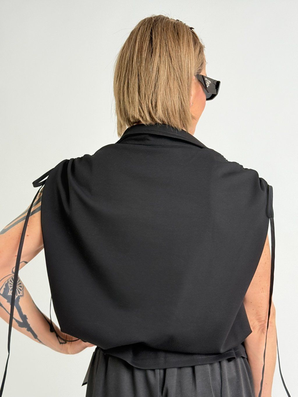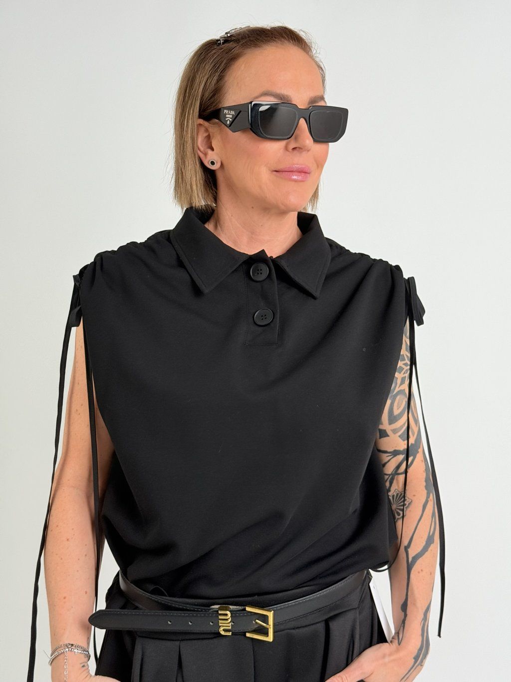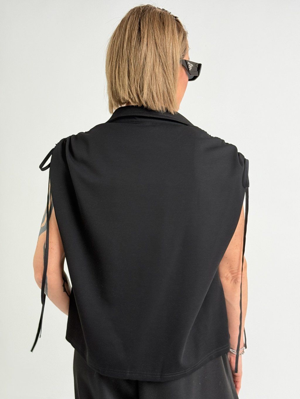 Polokošeľa s golierom, zapínaním na 2 gombíky, so spadnutými rukávmi, ktoré sa dajú stiahnuť na ramene.