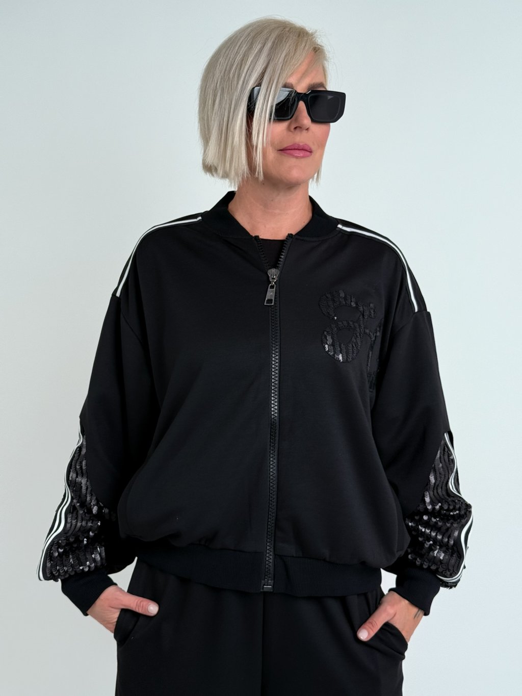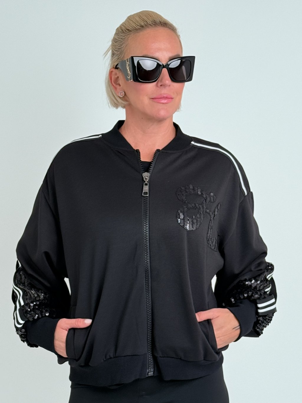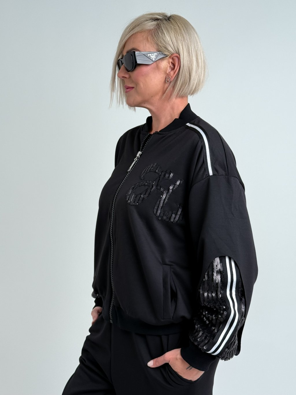 Krásny nadrozmerný bomber z dvojitej tkaniny v kombinácii s flitrami, s dlhými rukávmi a nášivkami na krku, rukávoch a spodnom okraji.MIERKA, BOMBERY SÚ VEĽKÉ!!!!