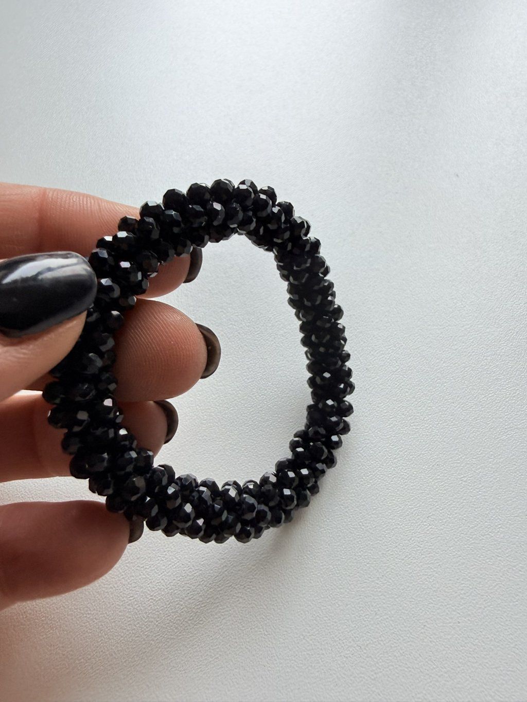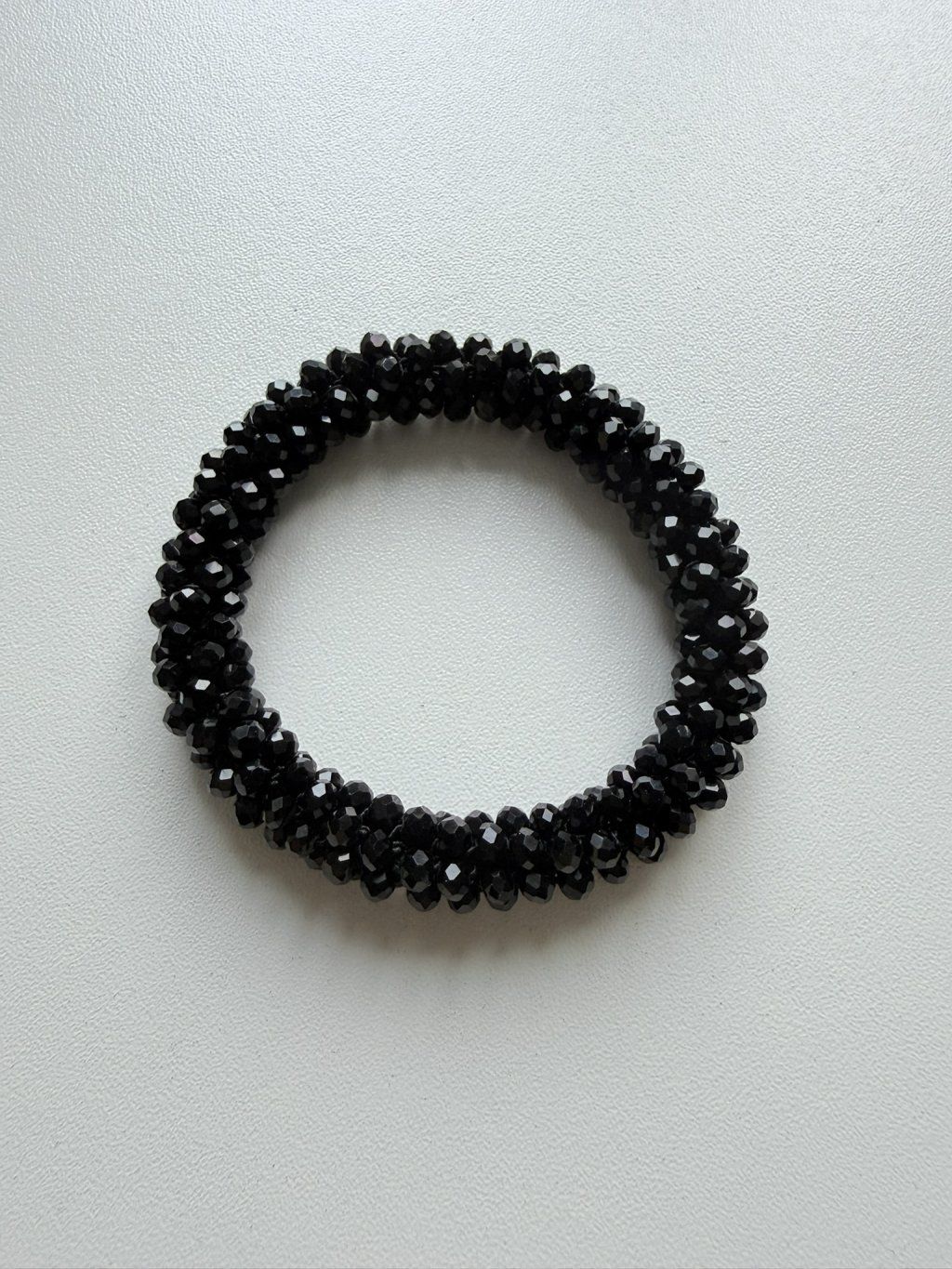 Čierny krútený náramok, ktorý možno použiť aj ako gumičku do vlasov.