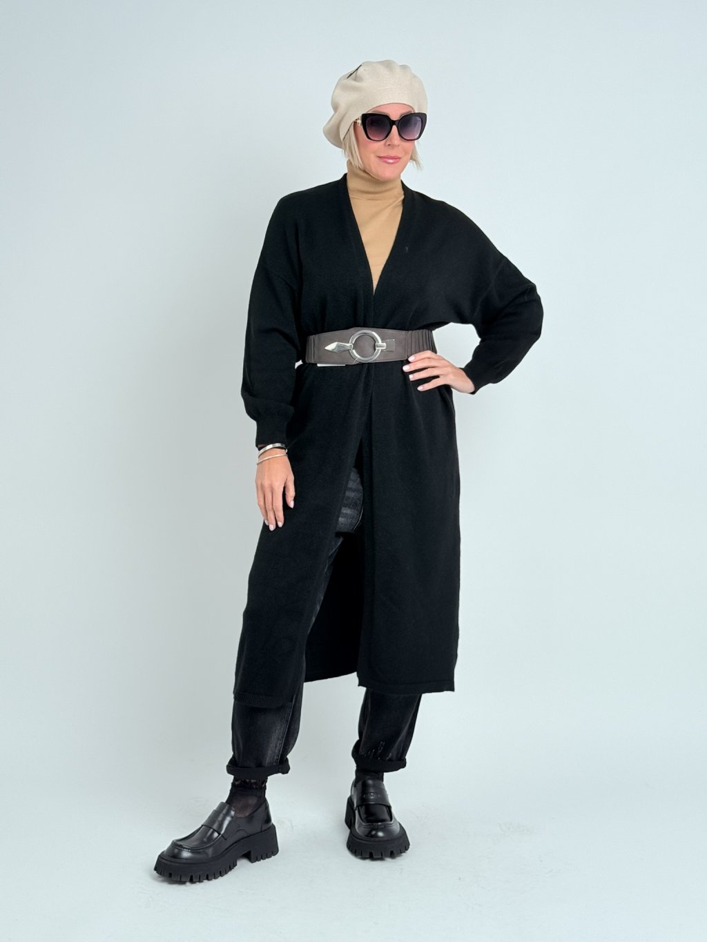 Skvelý sveter, bez zapínania, s opaskom. Skvele sa hodí k akémukoľvek outfitu a keďže je priliehavý, je ideálny pod krátku prešívanú vestu alebo koženú bundu.