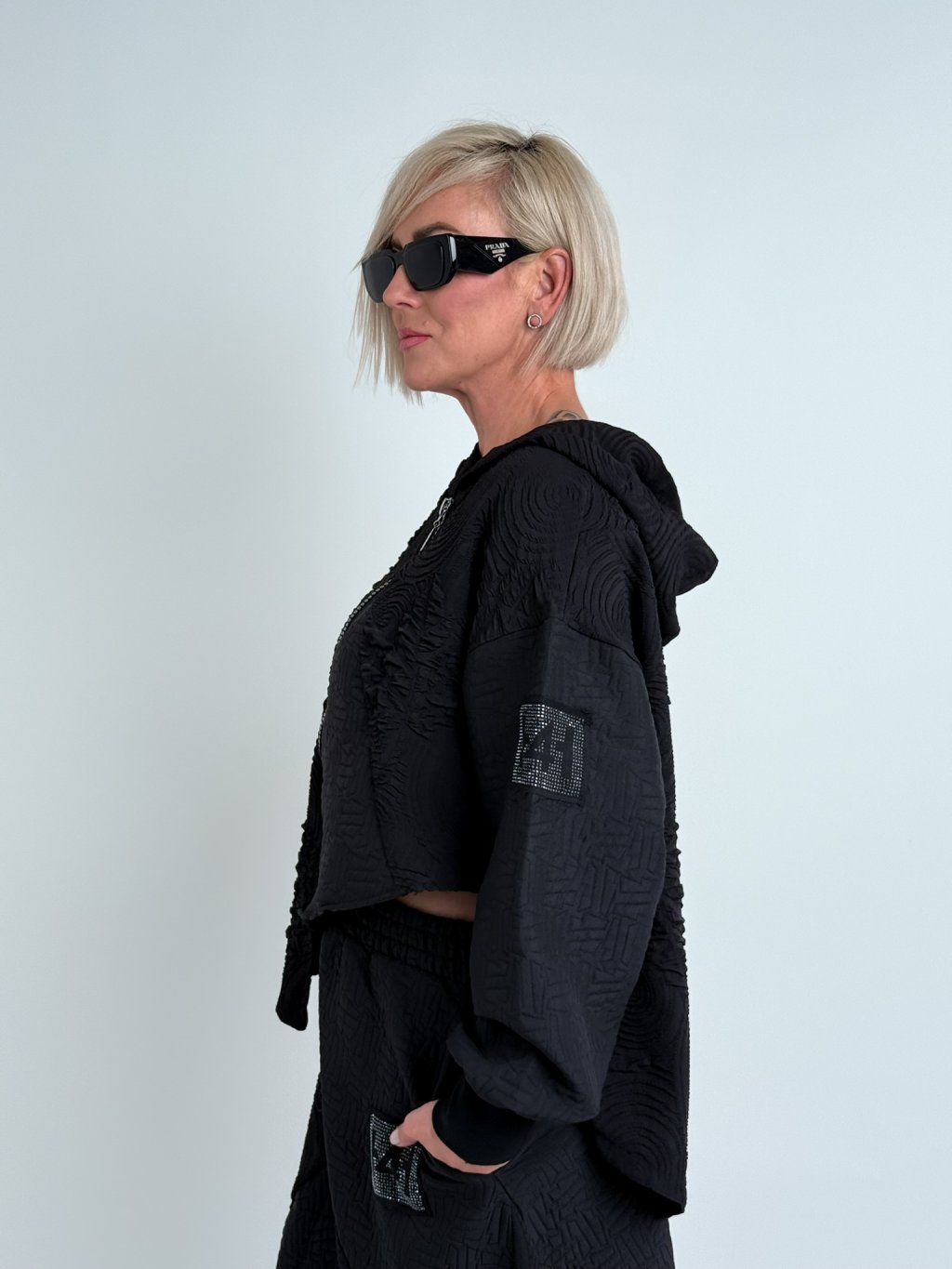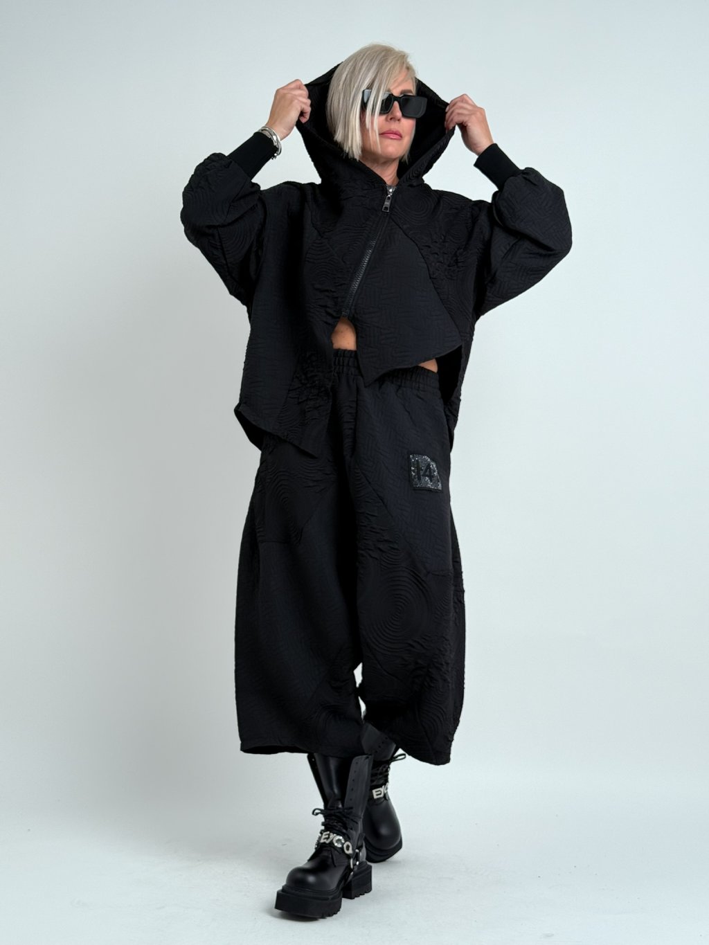 Luxusný top v zaujímavom, nadrozmernom, asymetrickom strihu, so zipsom, kapucňou a dlhými rukávmi zakončenými nášivkou.MIERKA, TOPY VHODNÉ PRE VEĽKÉ VELIČINY.