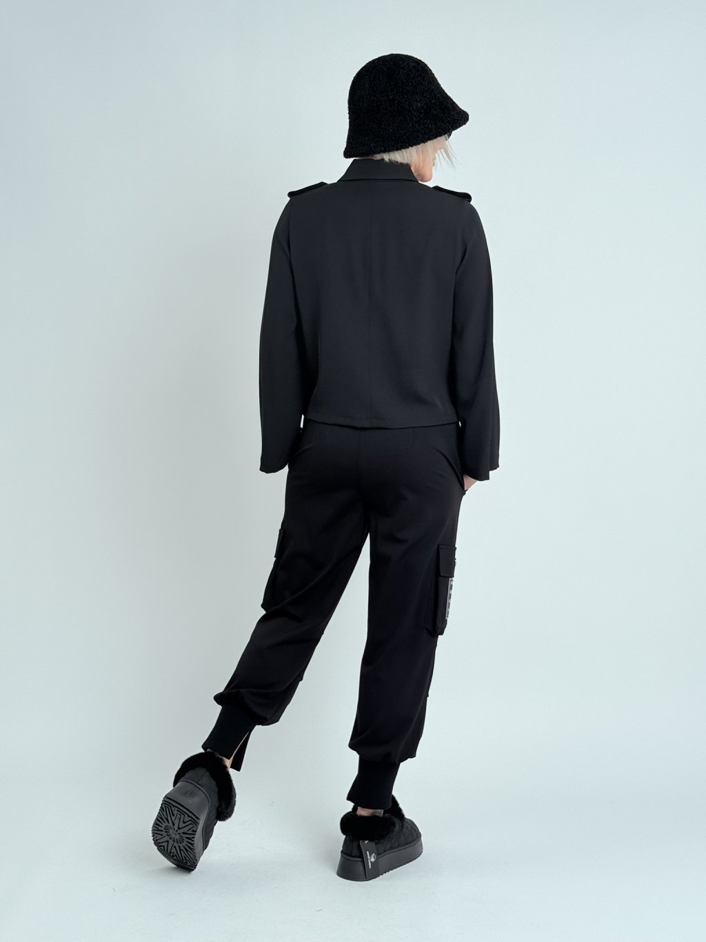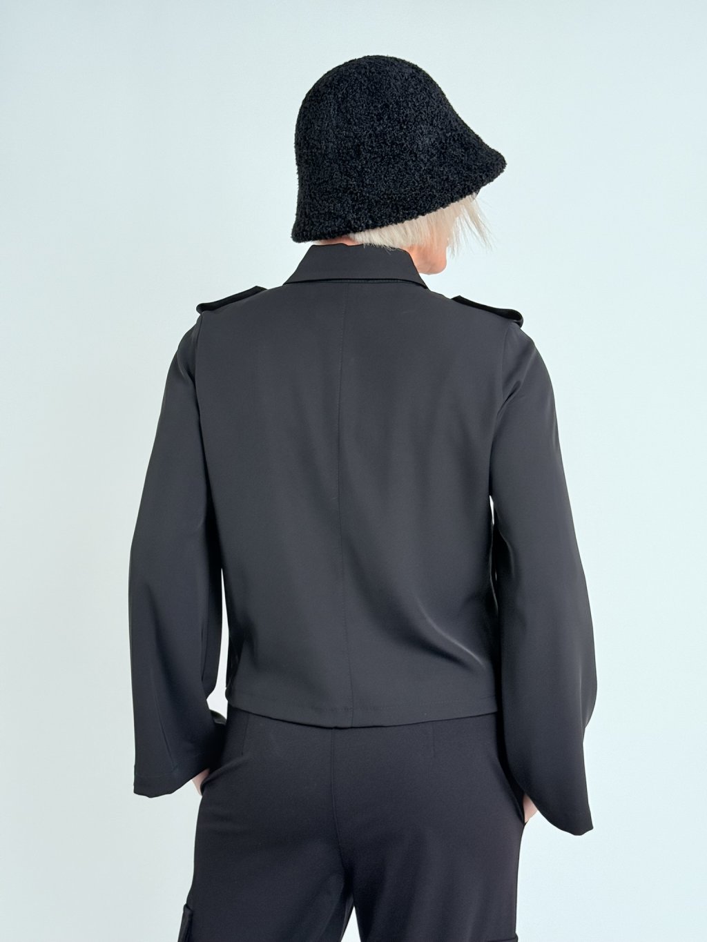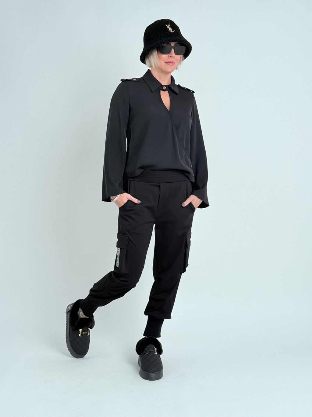 Luxusný top s golierom a prekríženými prednými dielmi, ramennými vypchávkami a rozšírenými rukávmi.