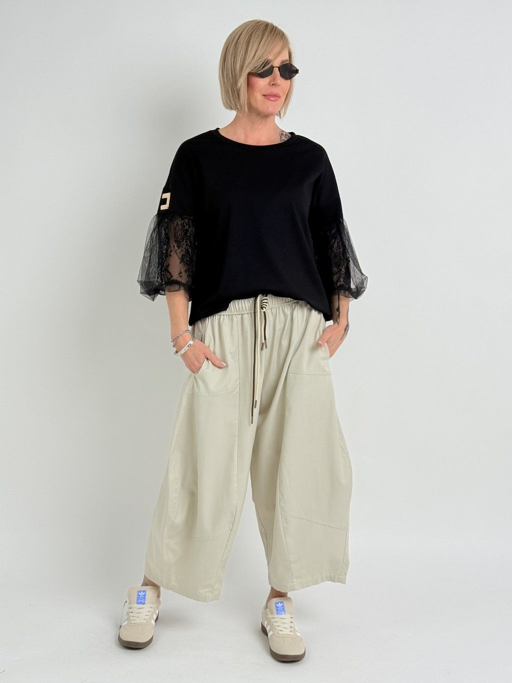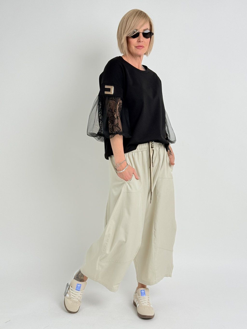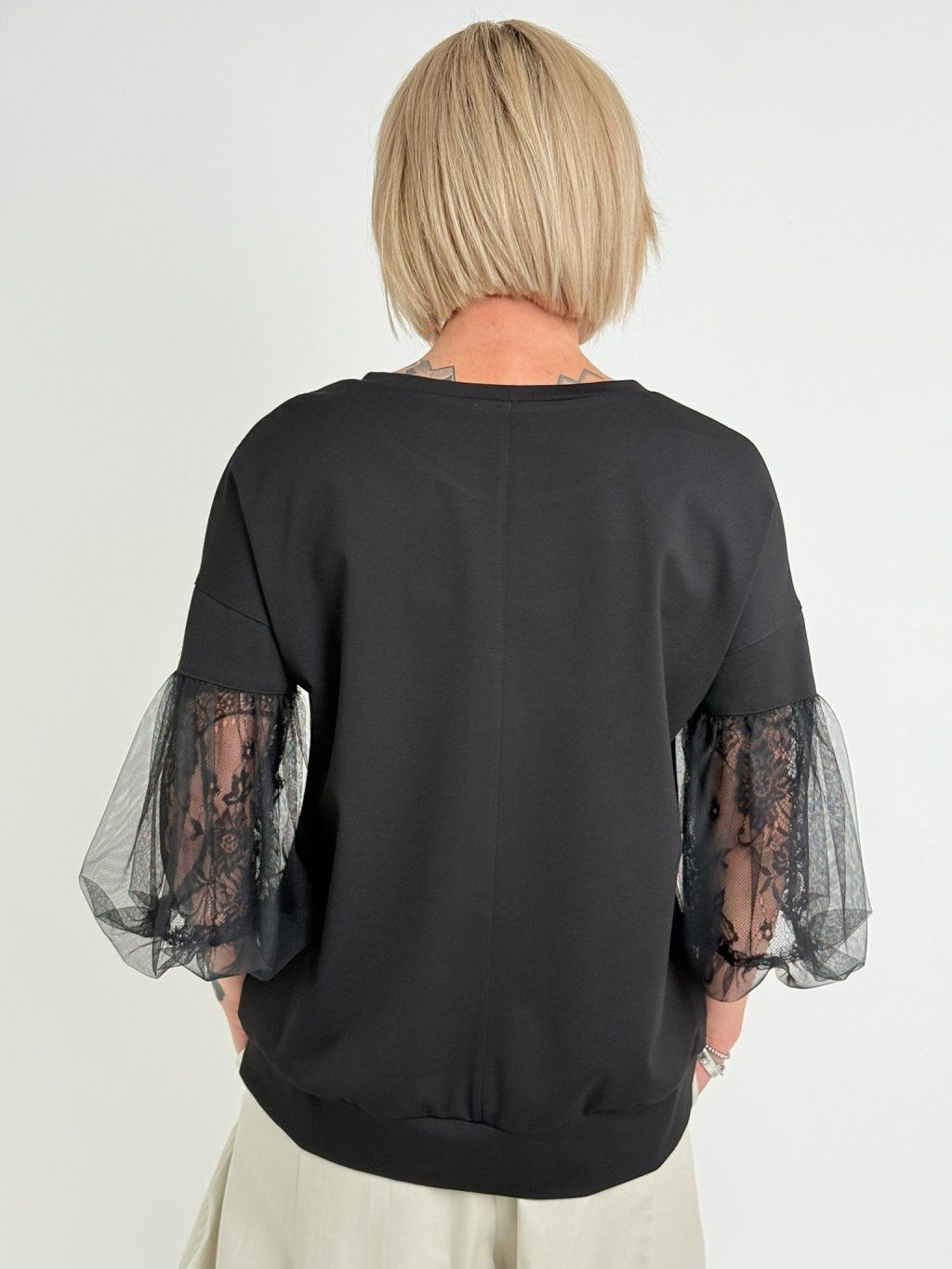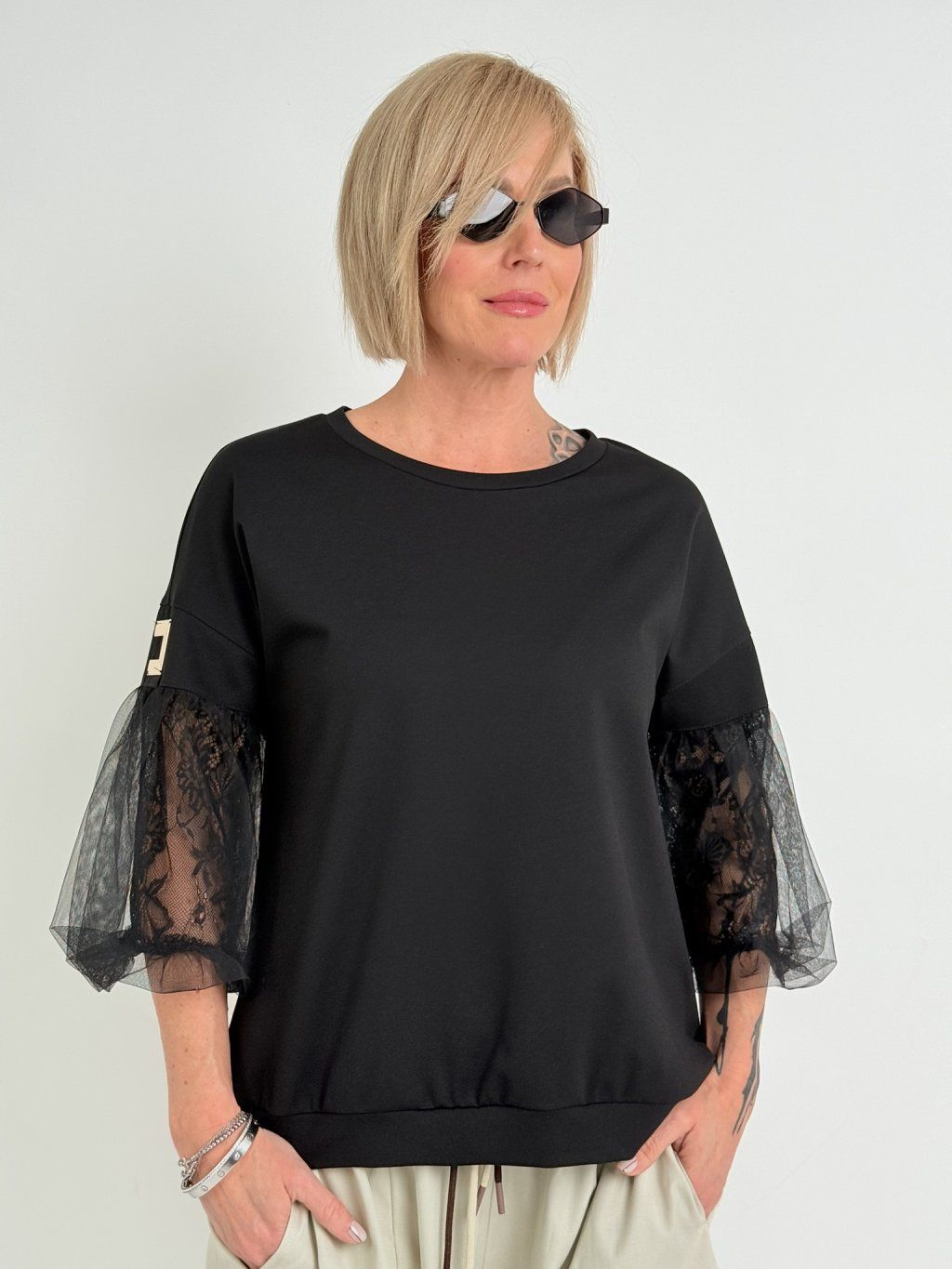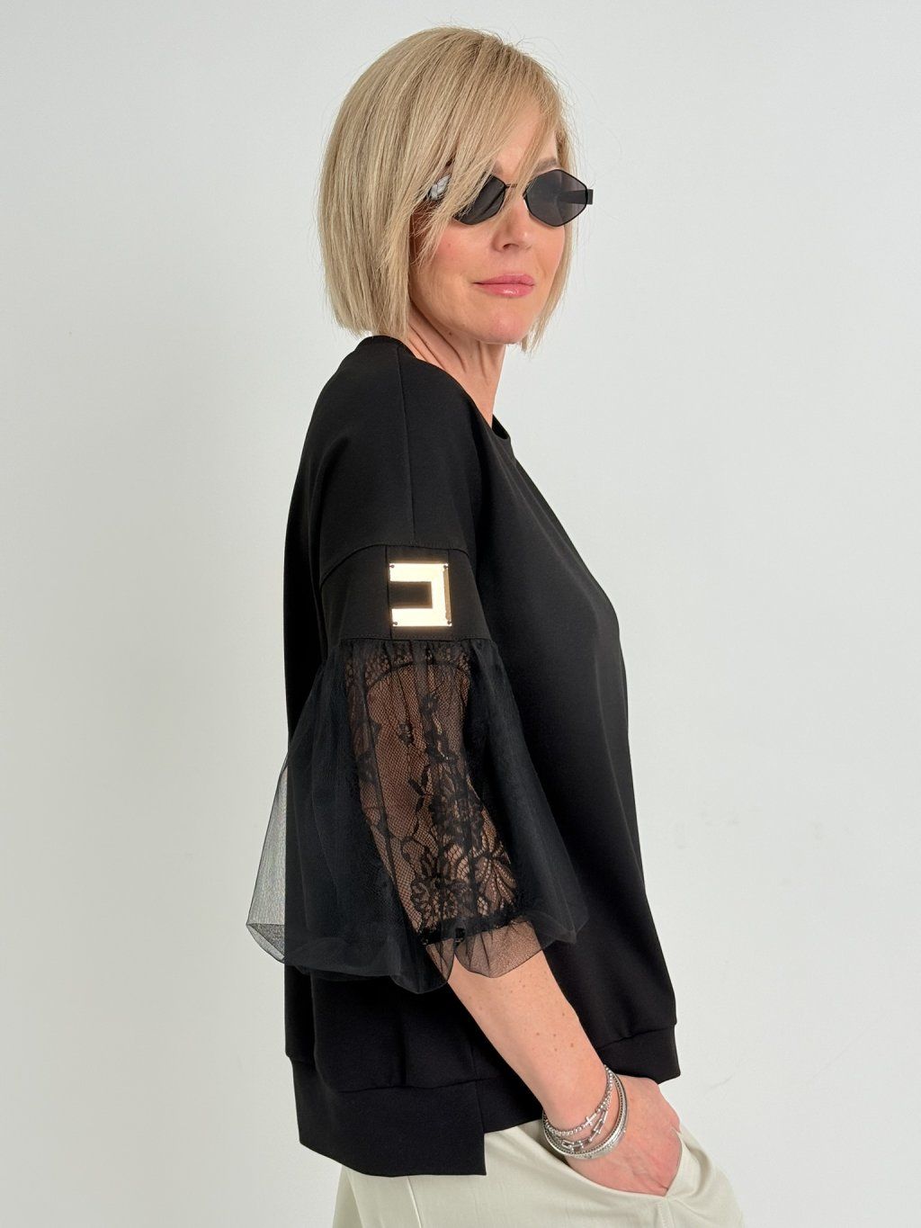 Luxusný top s mierne predĺženým zadným dielom, 3/4 tylovými balónovými rukávmi, podšitý čipkou. Predná časť je zdobená zlatom.