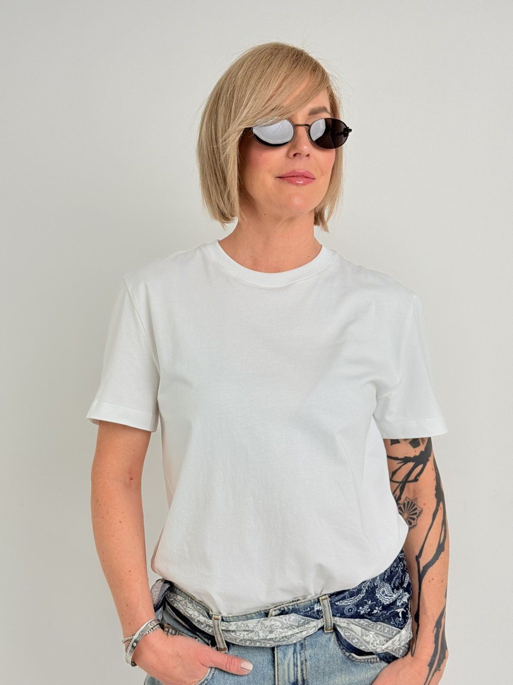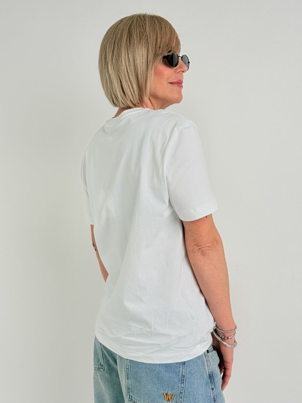 Jednoduché základné tričko s krátkymi rukávmi a okrúhlym výstrihom.