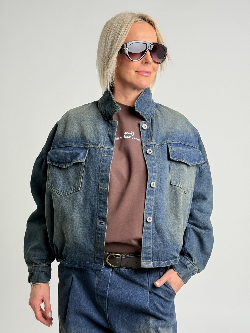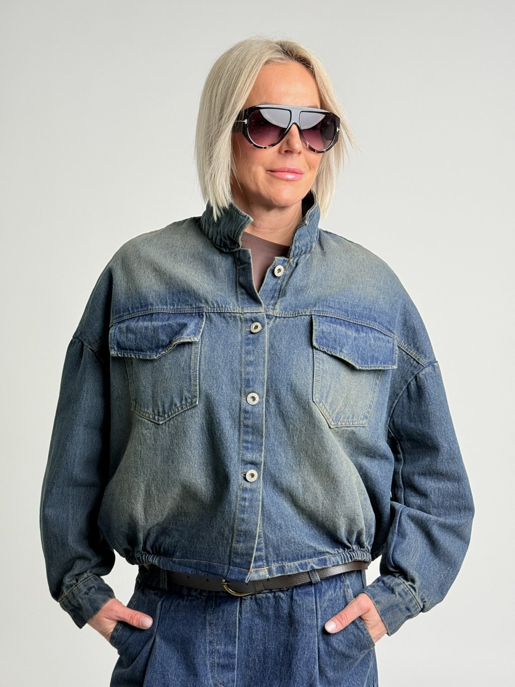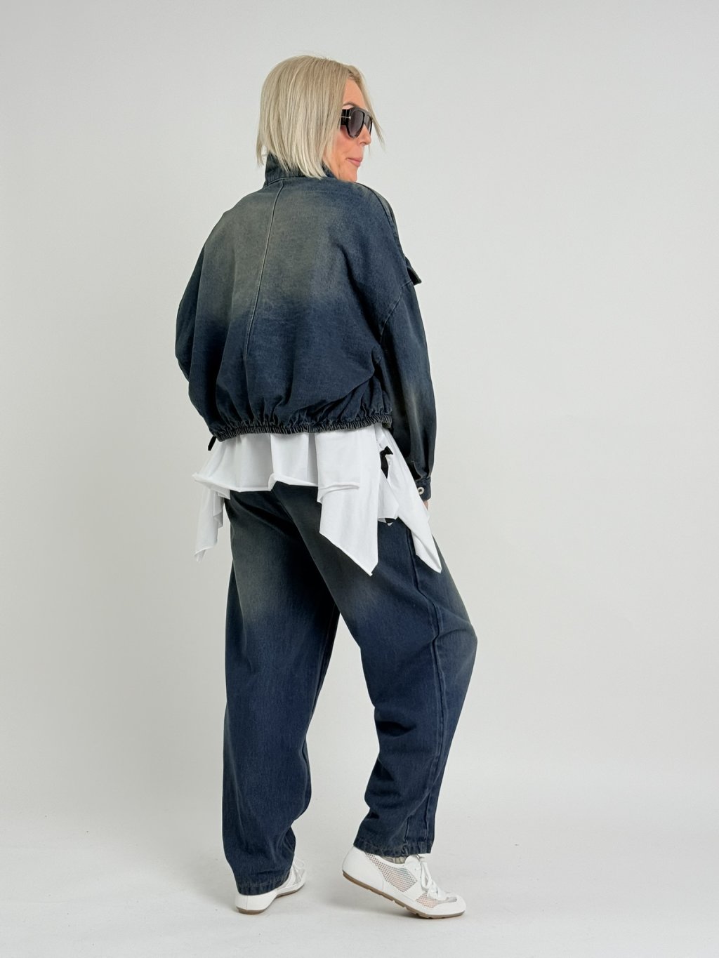 Skvelá, nadrozmerná džínsová bunda s vreckami na prednej strane, zapínanie na gombíky, elastický pás Super ku každému oblečeniu. Nepružný materiál.