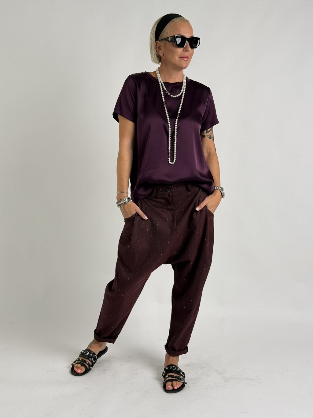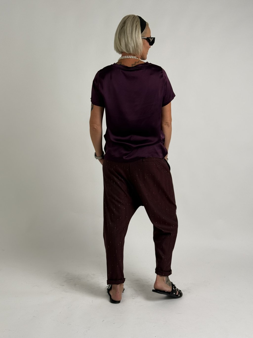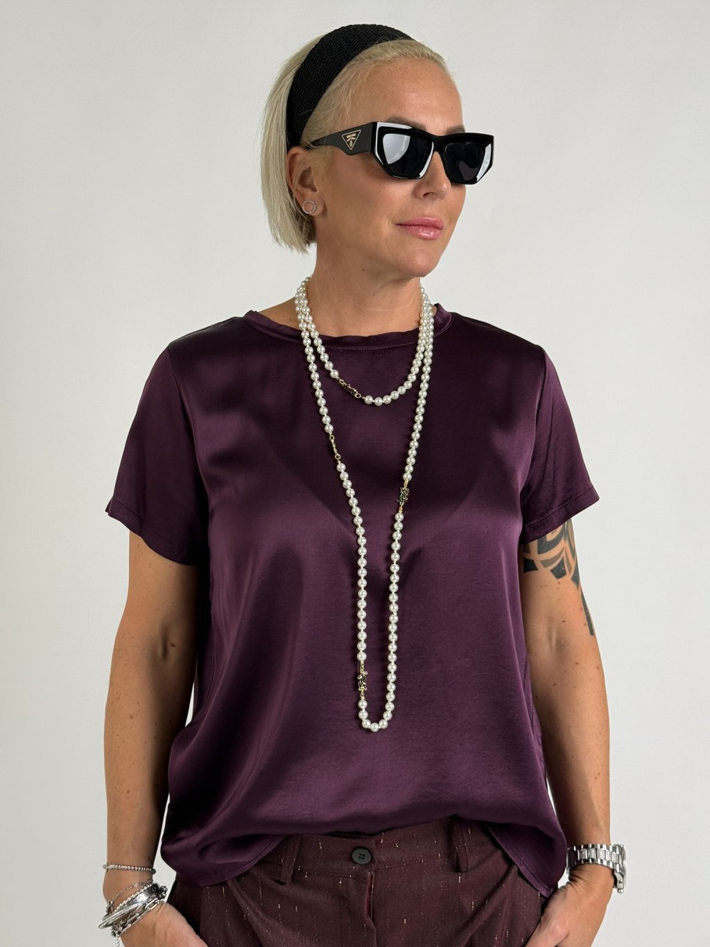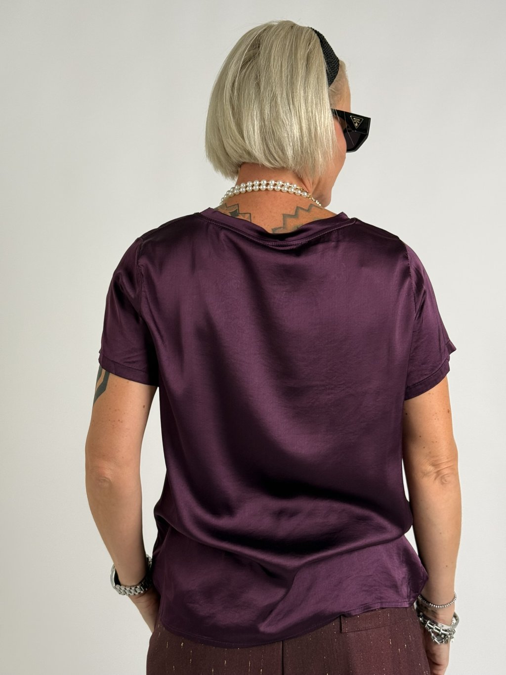 Jednoduchá, saténová, elastická blúzka s krátkymi rukávmi a okrúhlym výstrihom. Skvele sa hodí ku nohaviciam, sukniam a džínsom.