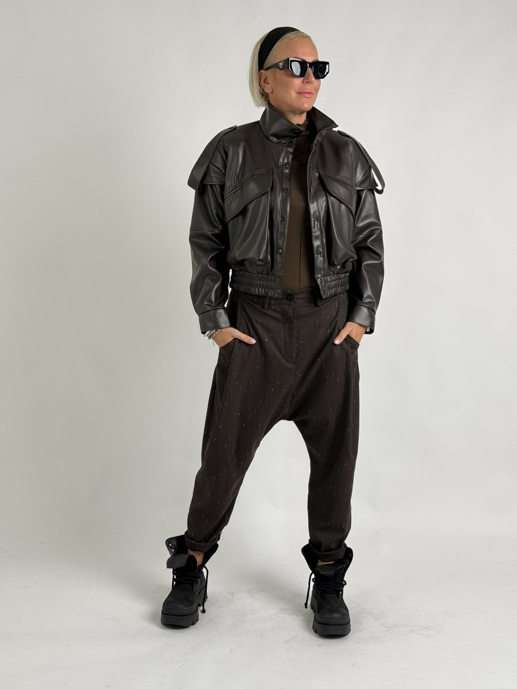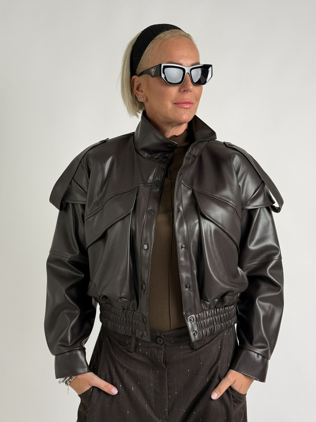 Luxusná koženková bunda nadmernej veľkosti s podšívkou, veľkými vreckami, zapínaním na zips a gumou na spodnom okraji bundy. Krásny doplnok k džínsom, nohaviciam, sukniam a šatám.