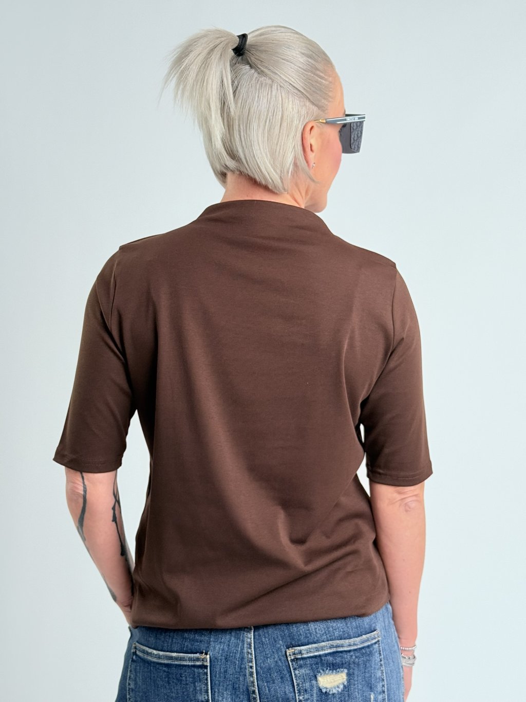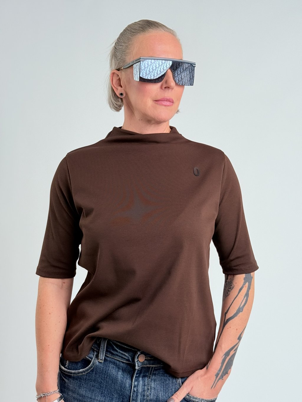 Jednoduché, pohodlné, elastické tričko s rukávmi po lakte a stojatým golierom.