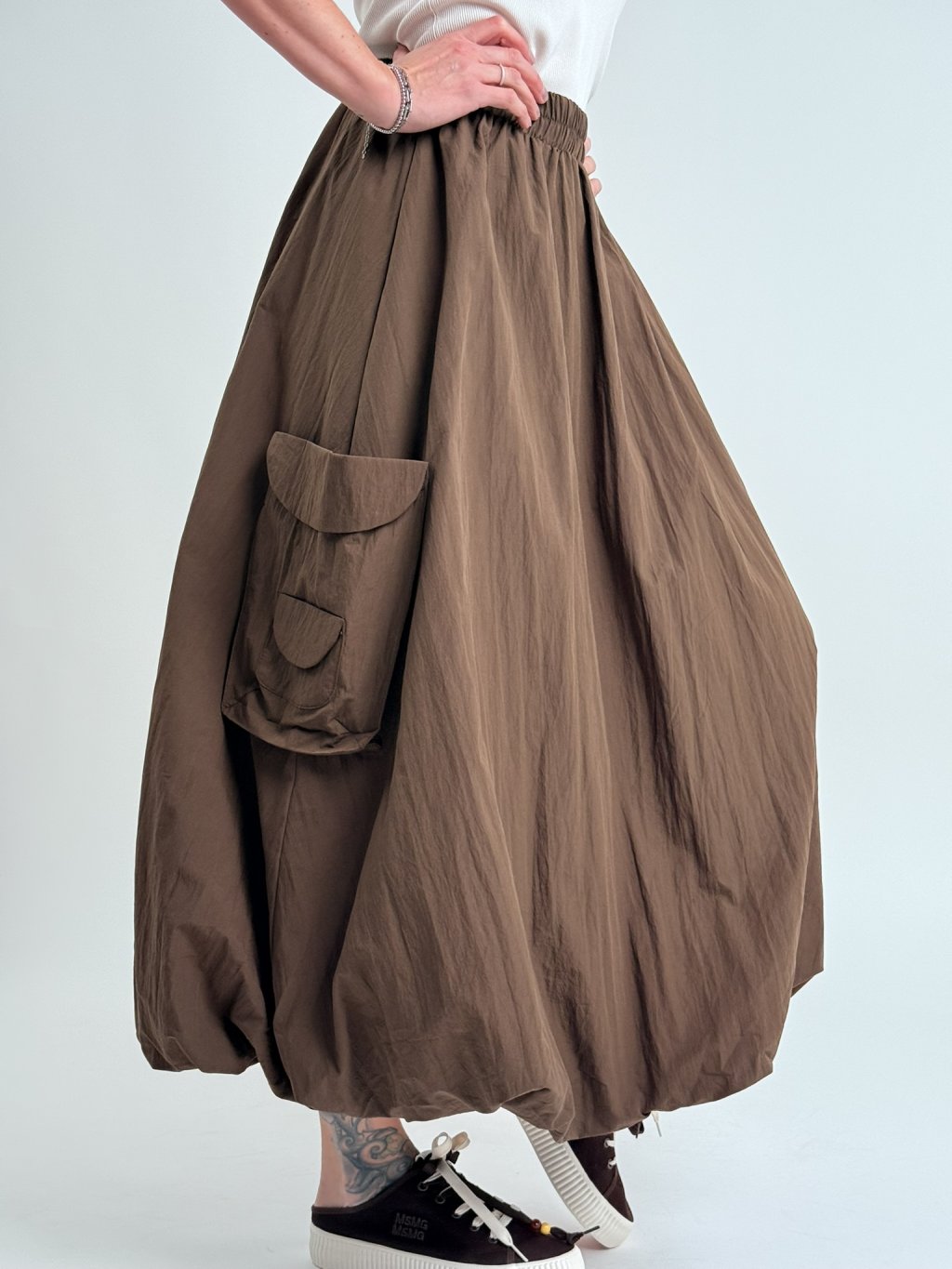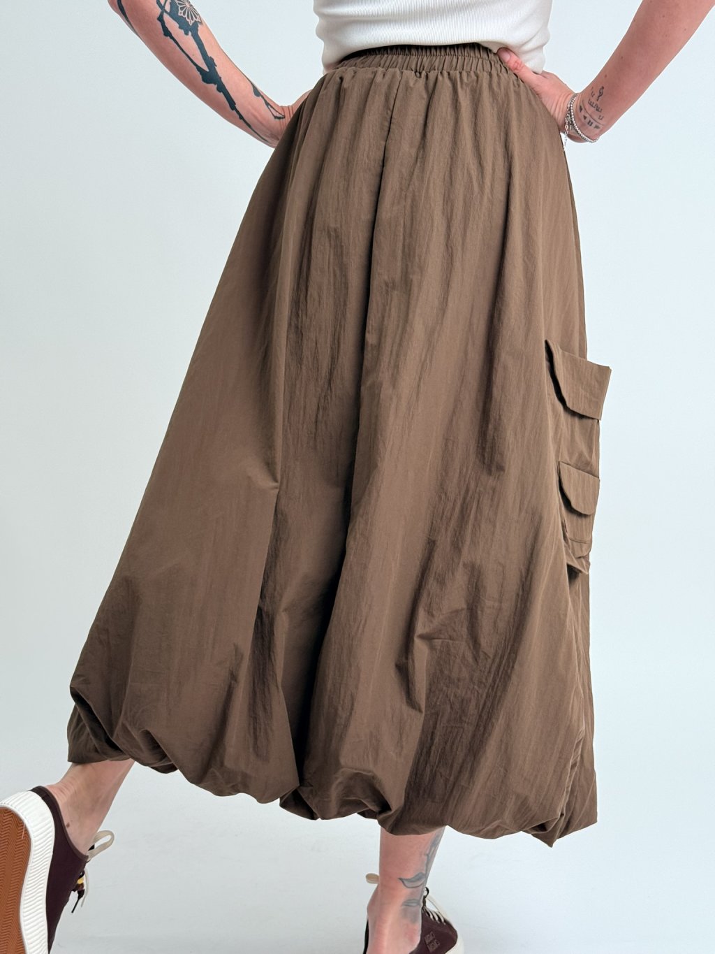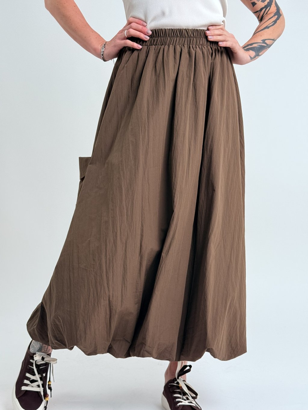 Dvojitá balónová sukňa s elastickým pásom, so všitým väčším vreckom na jednej strane.