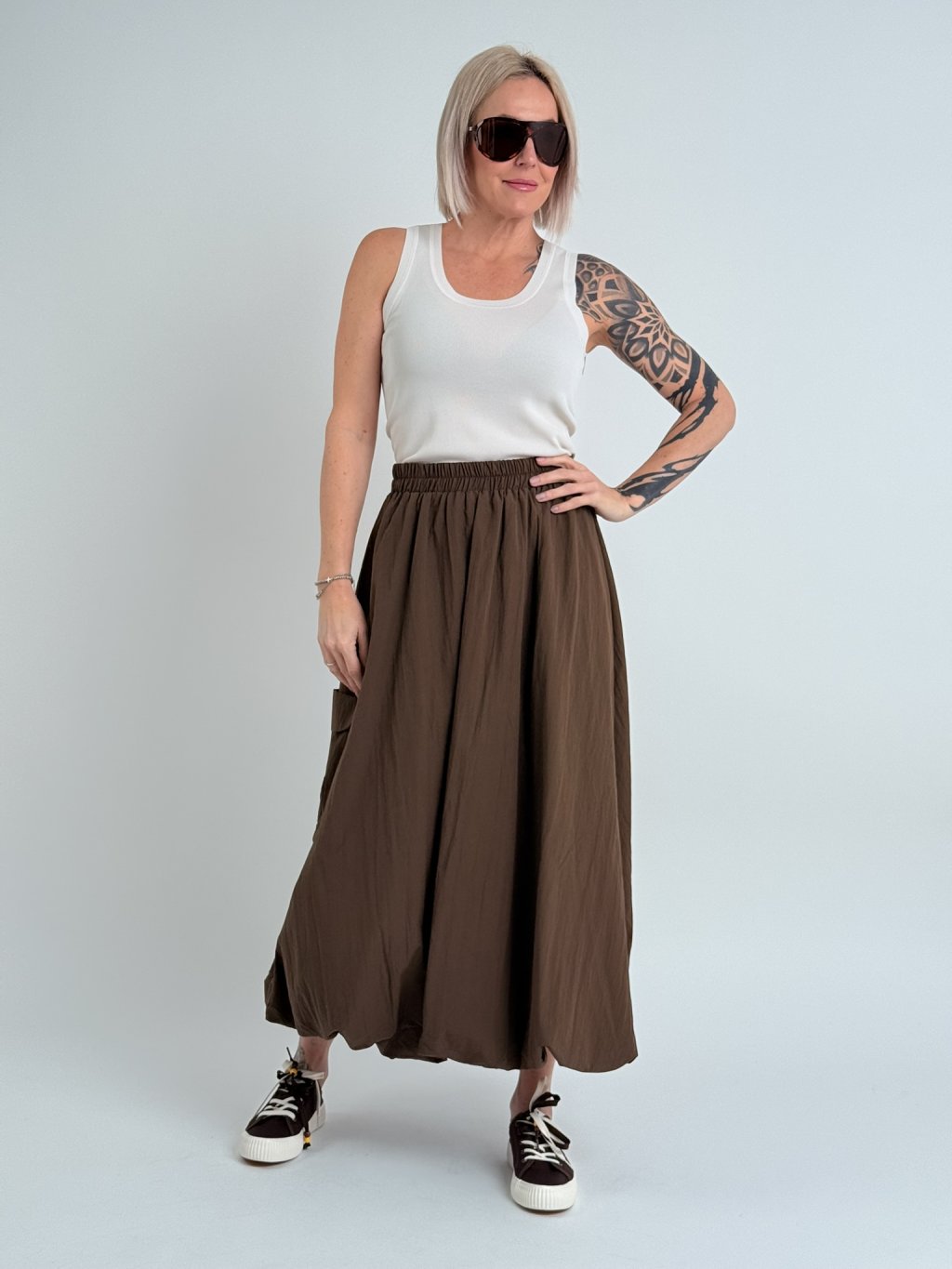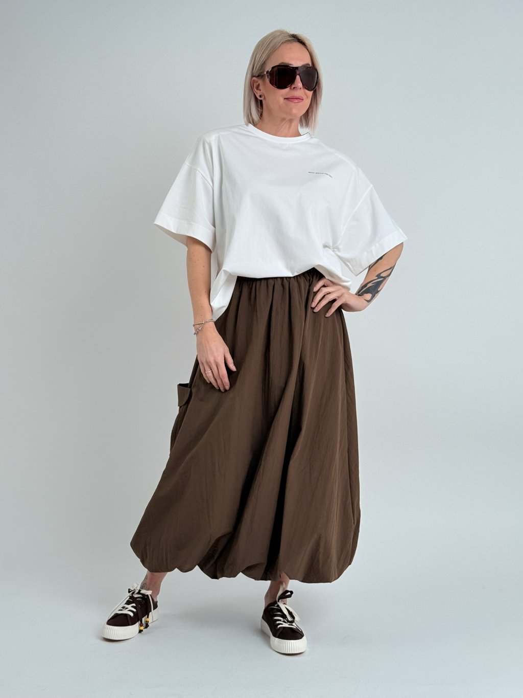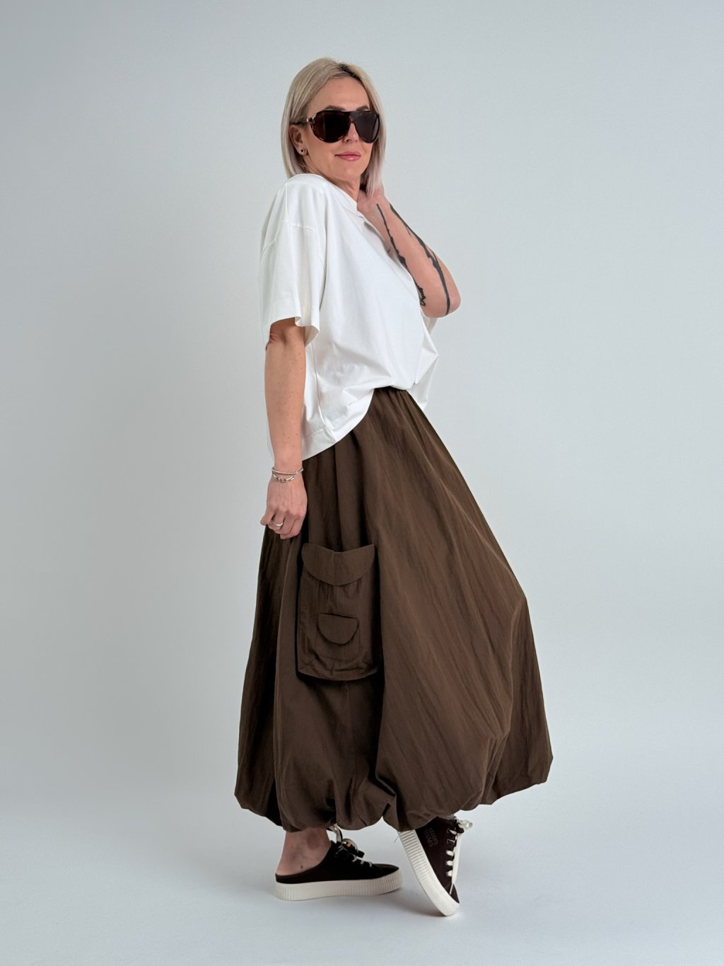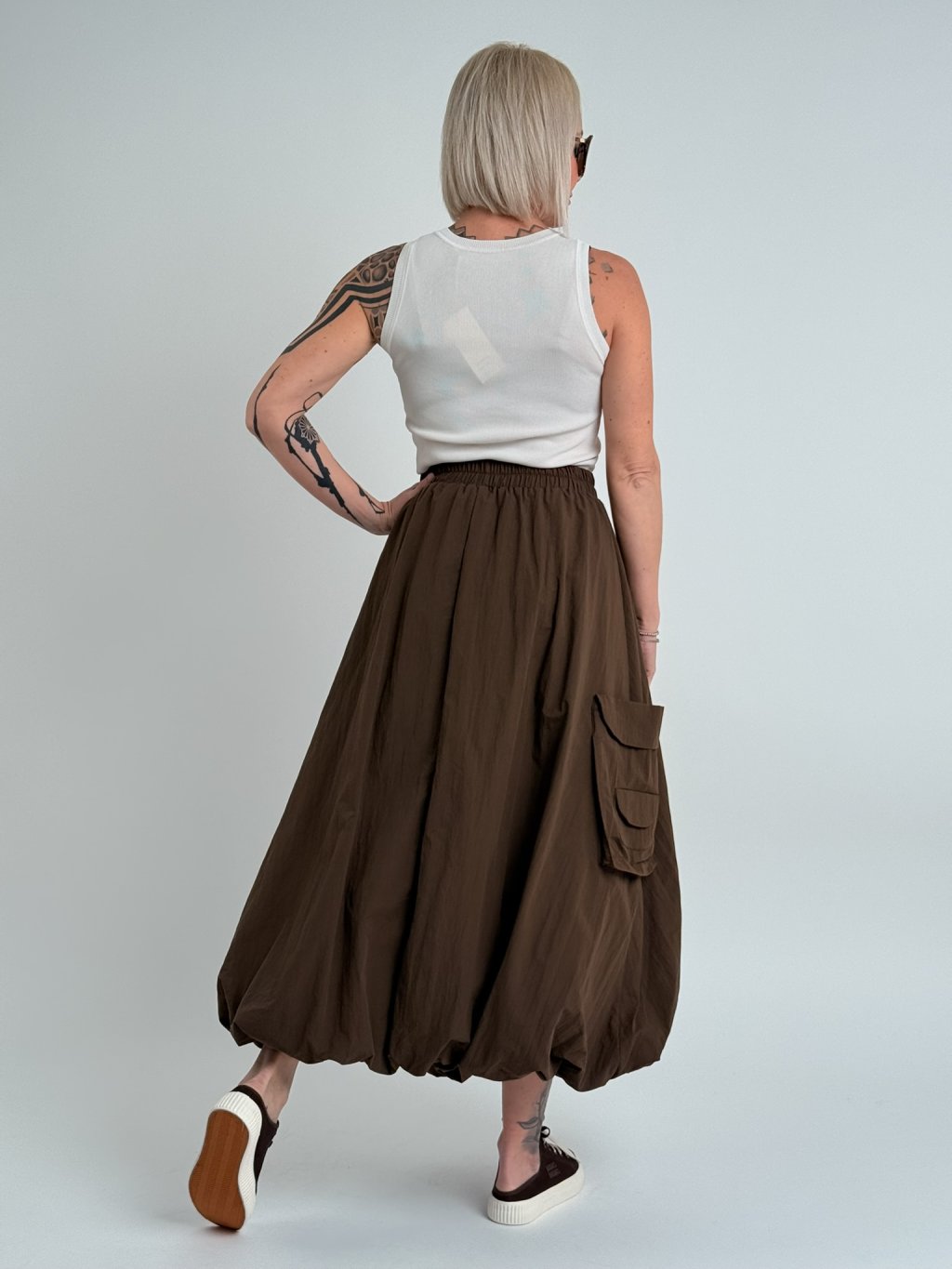 Dvojitá balónová sukňa s elastickým pásom, so všitým väčším vreckom na jednej strane.