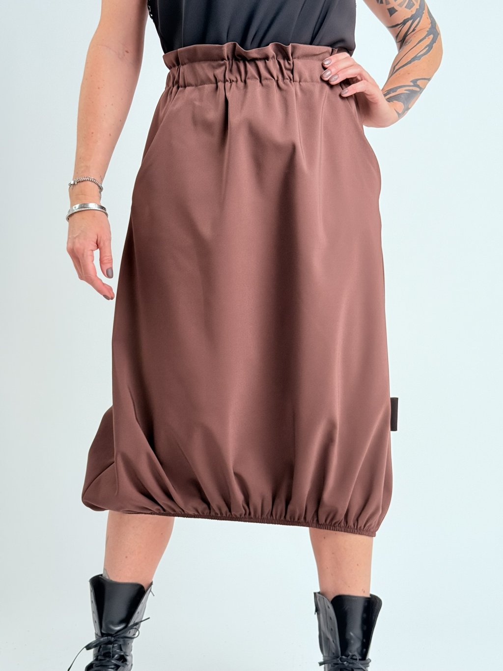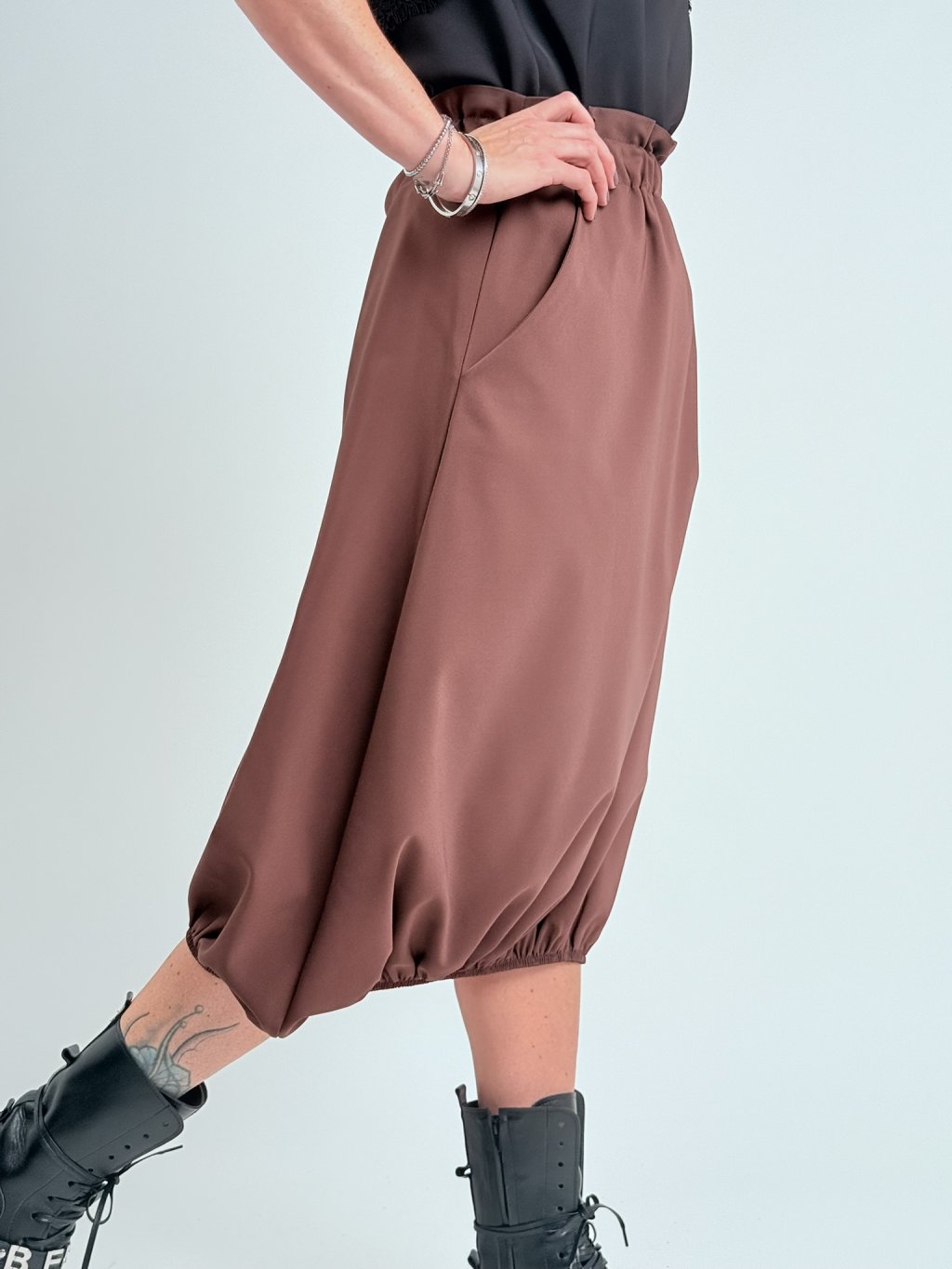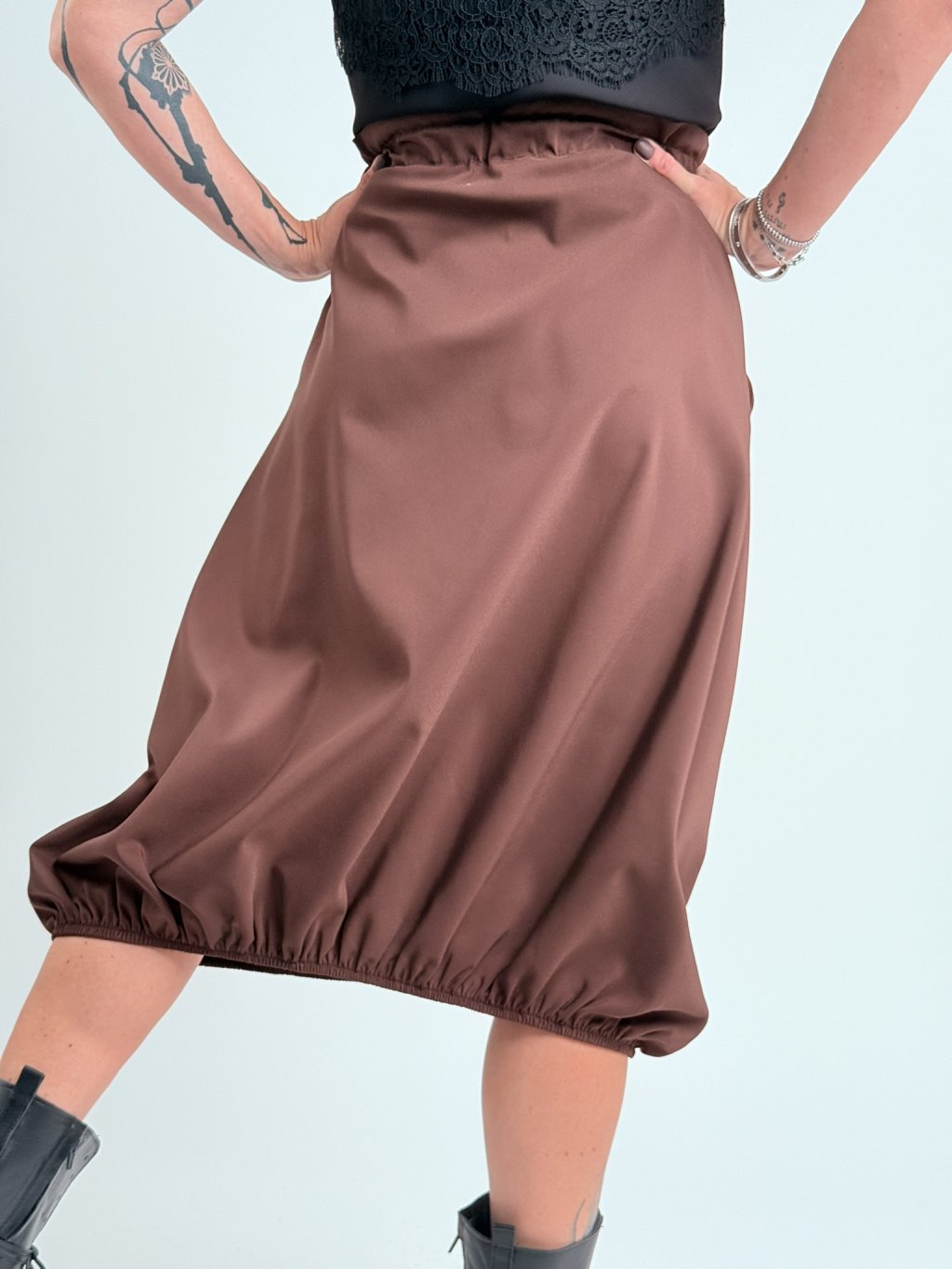 Super sukňa balónového strihu so širokým elastickým pásom a gumou na spodnom okraji.