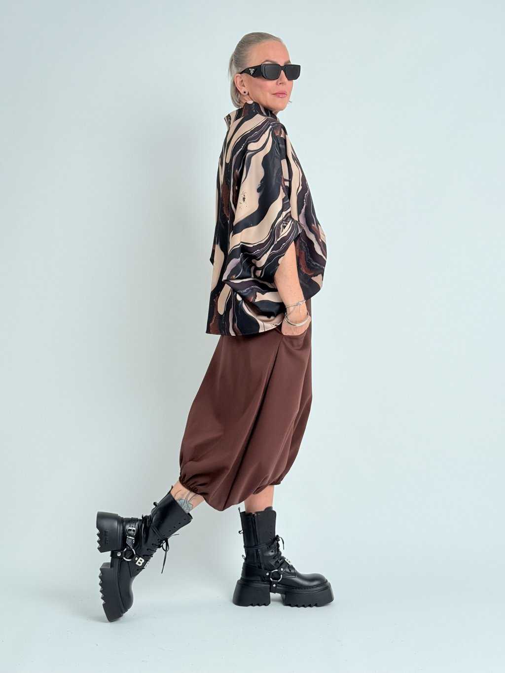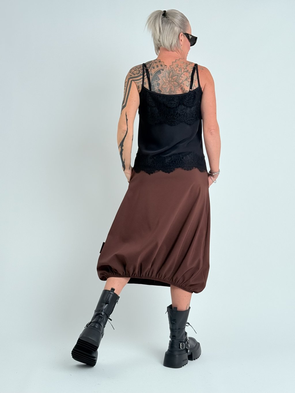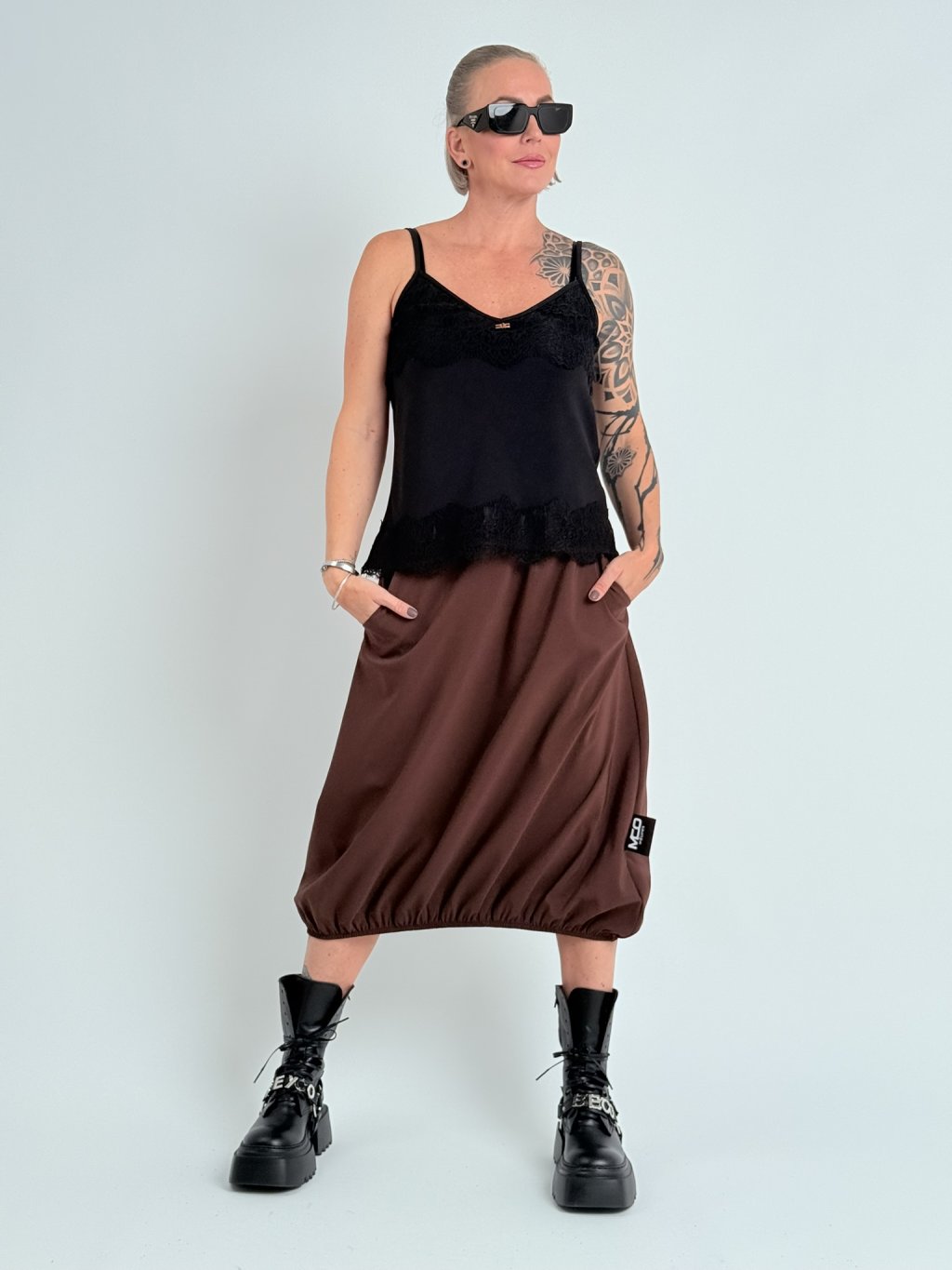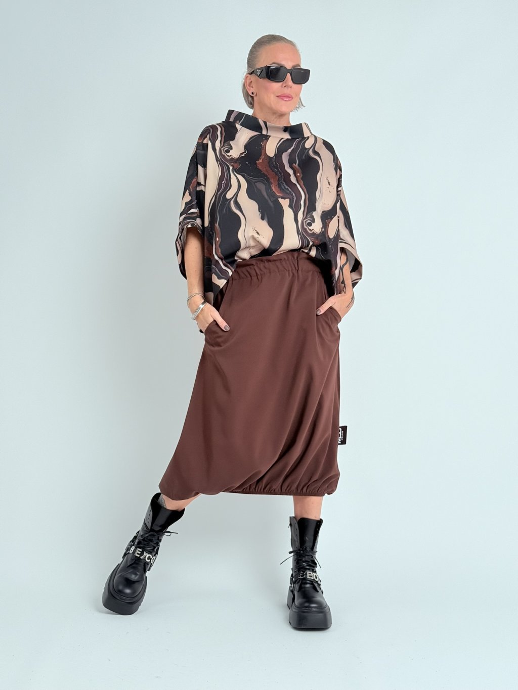 Super sukňa balónového strihu so širokým elastickým pásom a gumou na spodnom okraji.