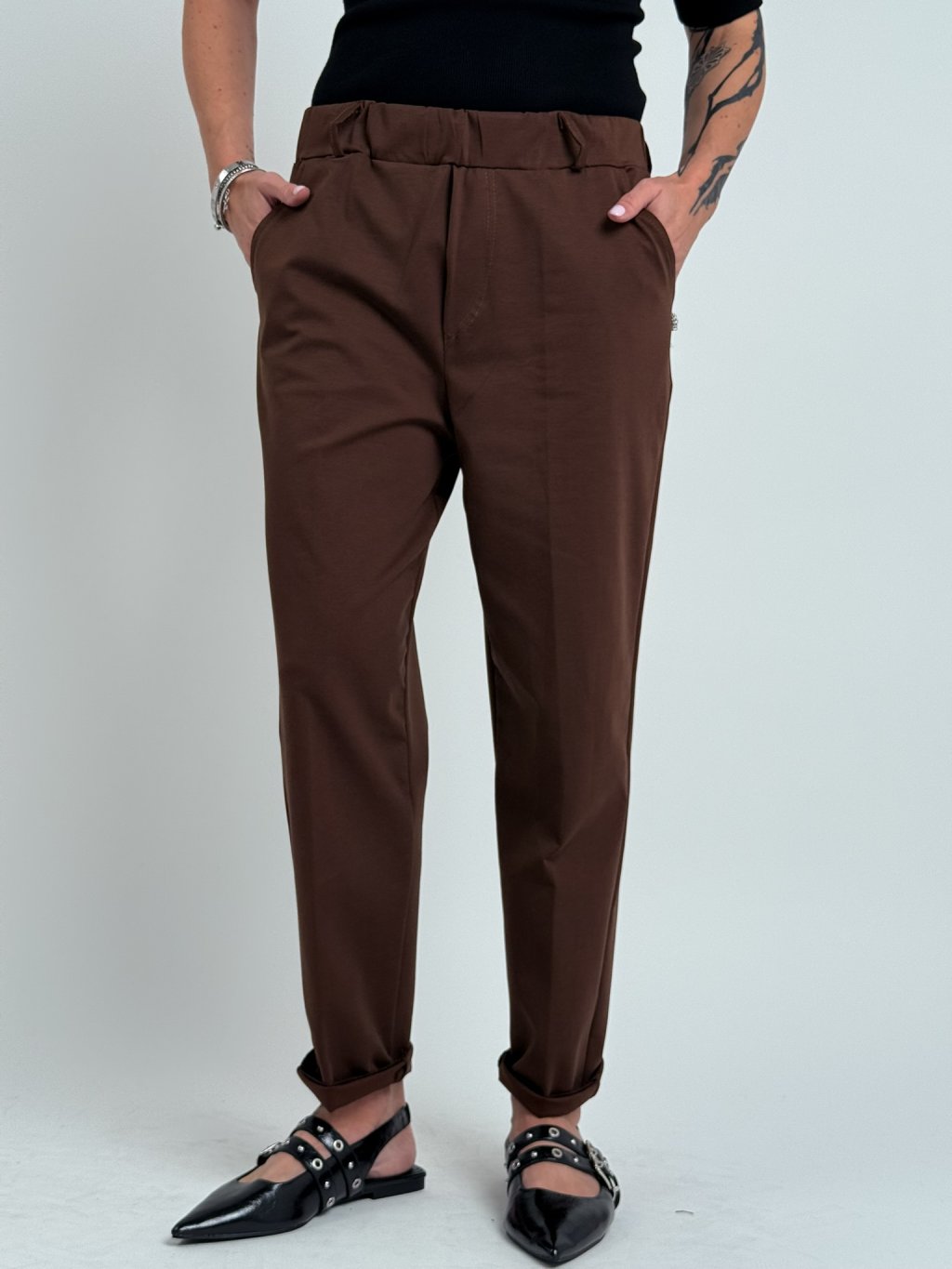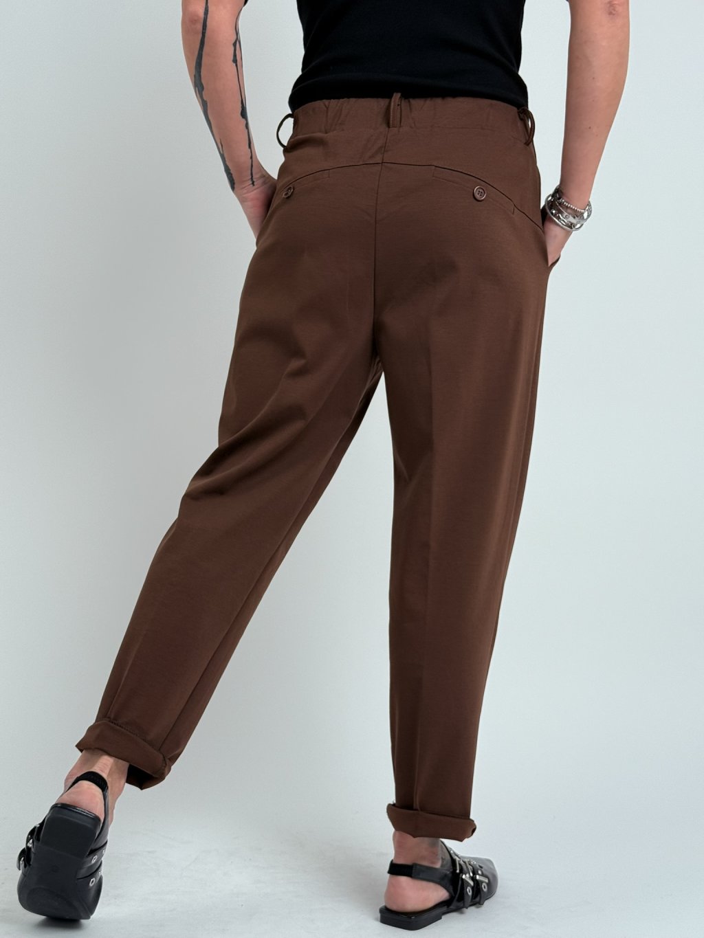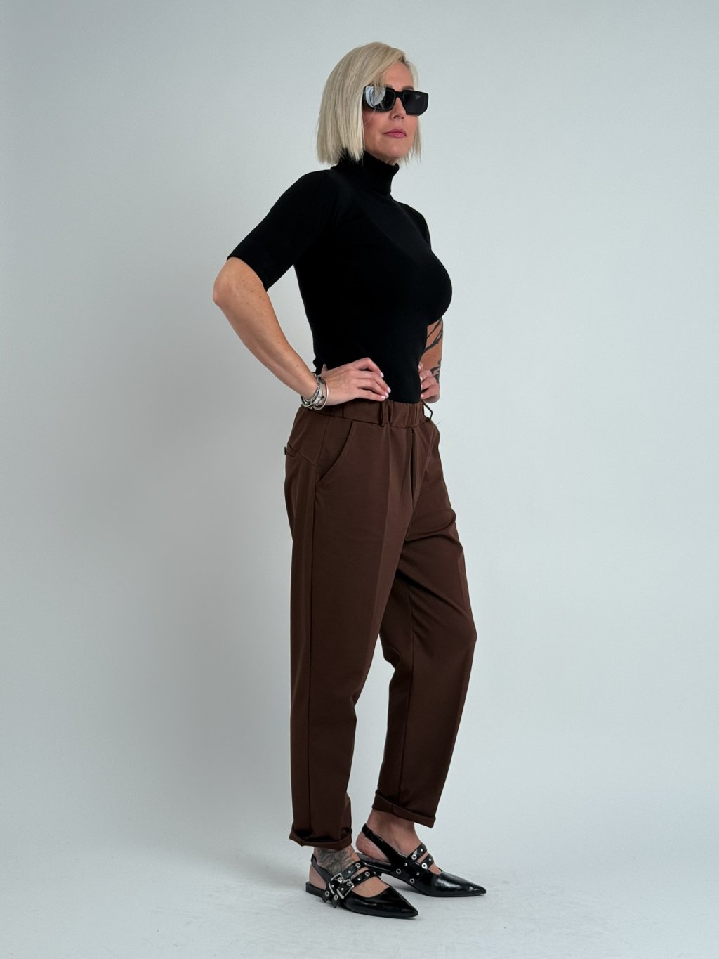 Super nohavice cigaretového strihu s bočnými vreckami, elastickým pásom a pútkami na opasok. Skvele sa hodia k sakám a dlhším svetrom.