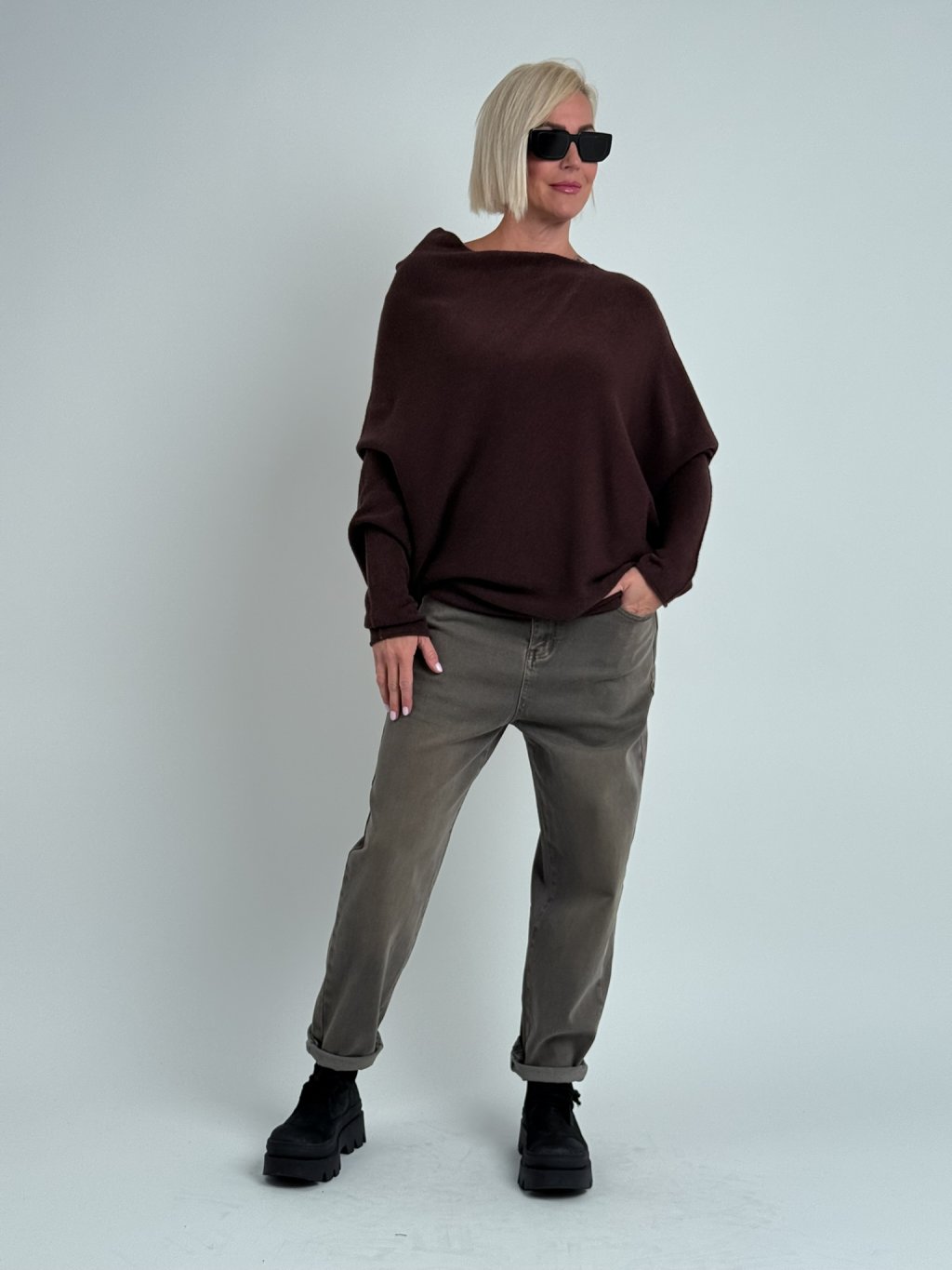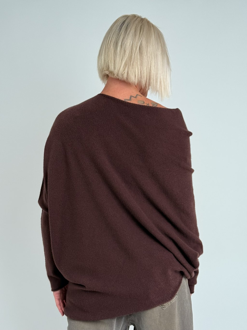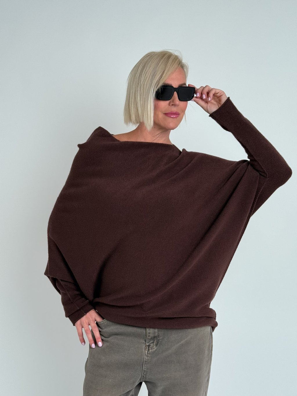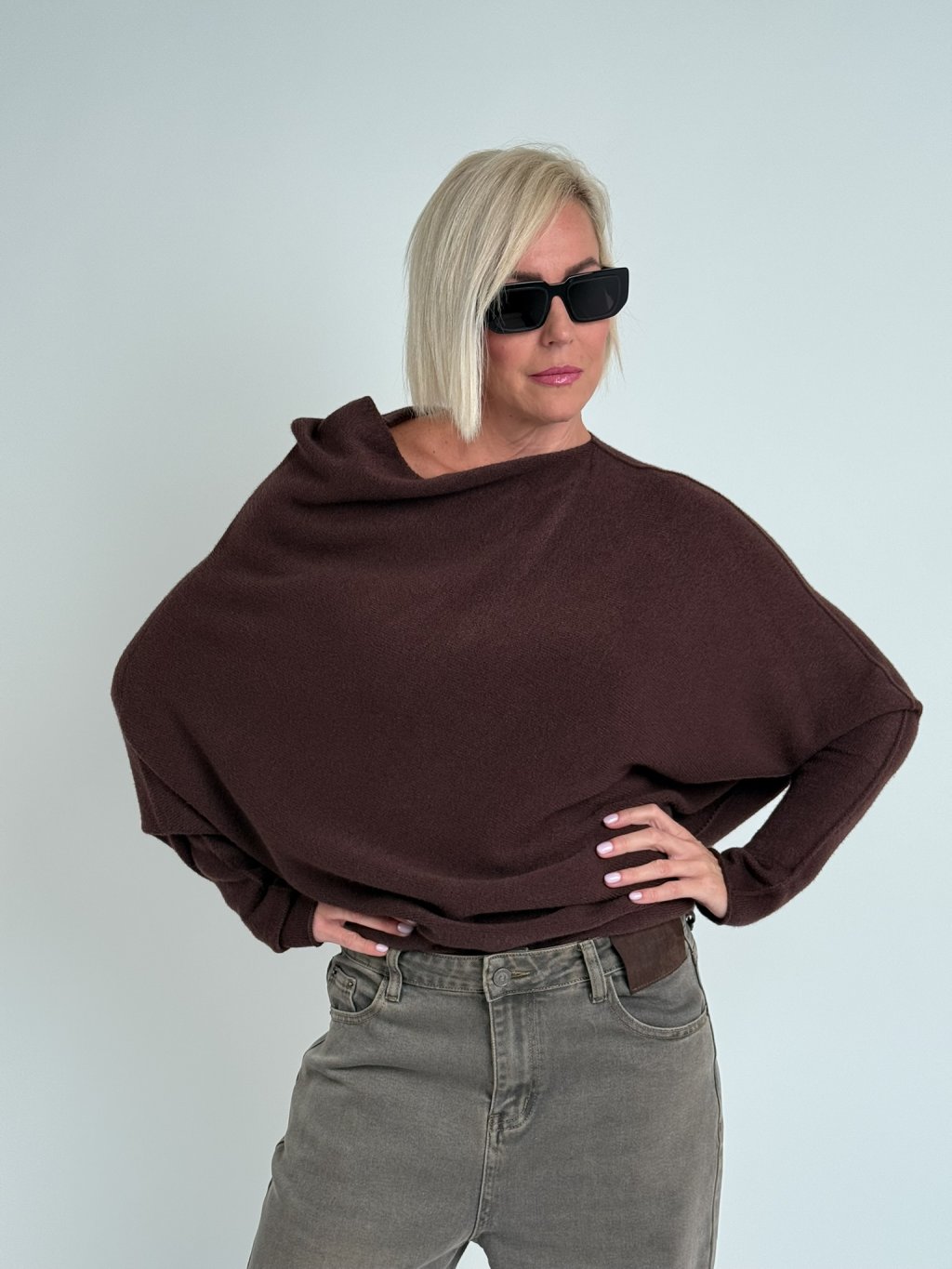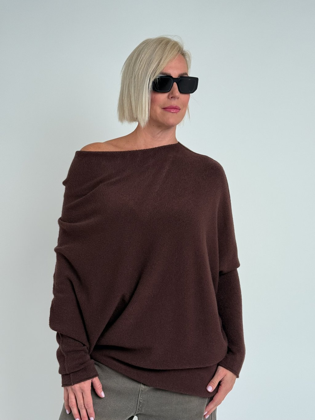 Krásny, elastický, asymetrický sveter s lodičkovým výstrihom. Mäkký a nekousavý.