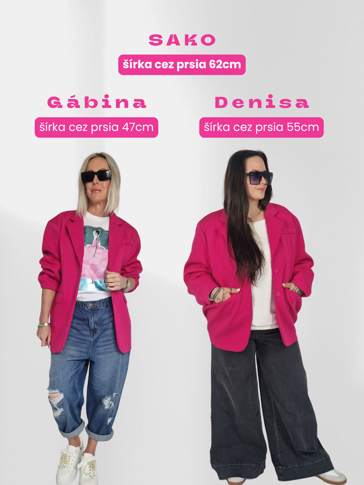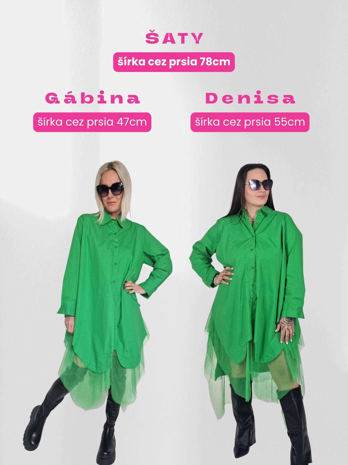 Vieme, že označenie UNI (univerzálne alebo onesize) môže vyvolávať otázky. Preto sme sa rozhodli ti to ukázať v praxi. Na fotkách vidíš úplne rovnaký kus oblečenia na dvoch rôznych ženách! Jednu s konfekčnou veľkosťou M a druhú s veľkosťou XL.