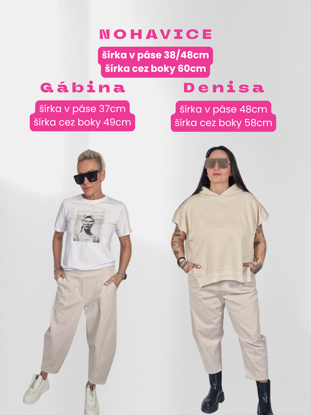 - Ak sú nohavice v páse na gumu, uvádzame šírku vo formáte: Šírka v pokojnom stave/šírka v natiahnutom stave (napr. šírka v páse 45/54 cm).
