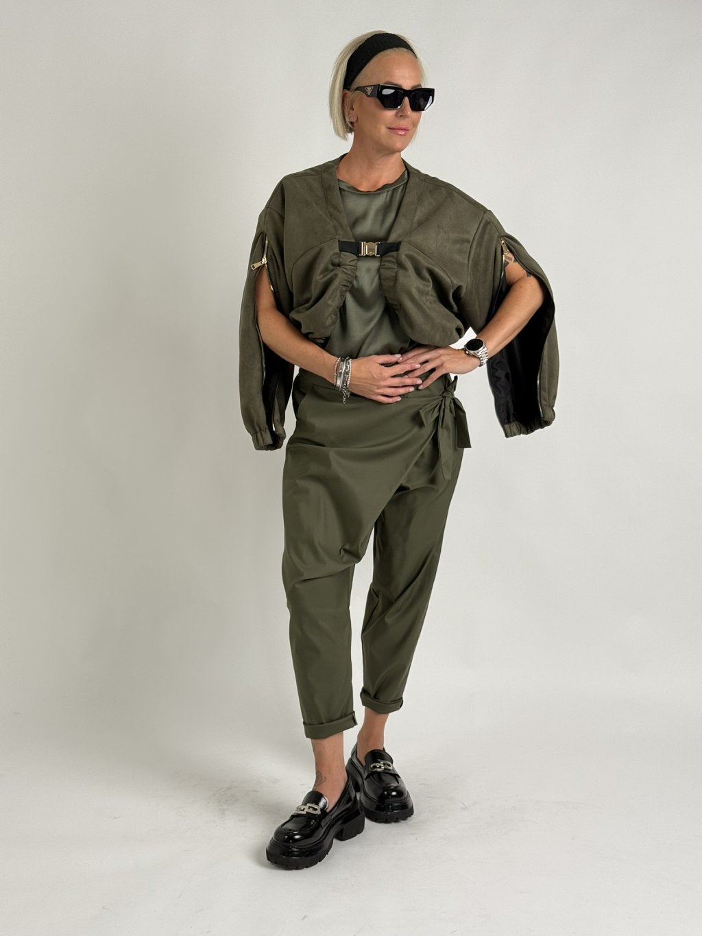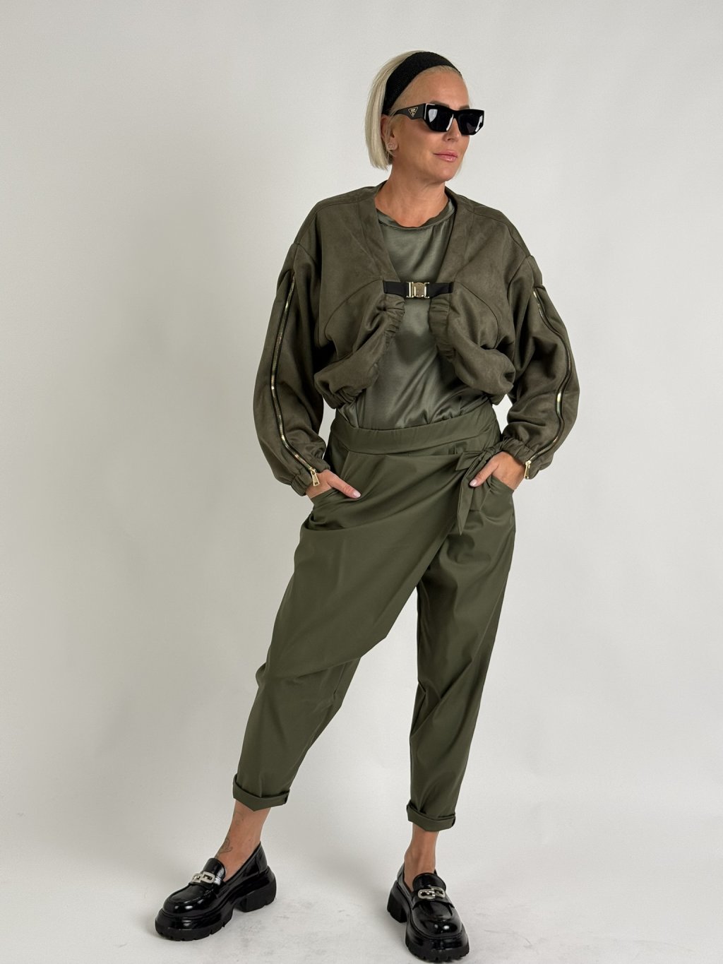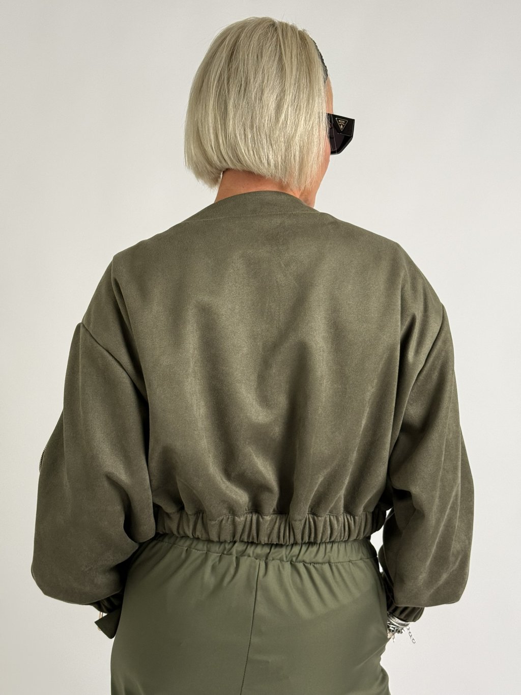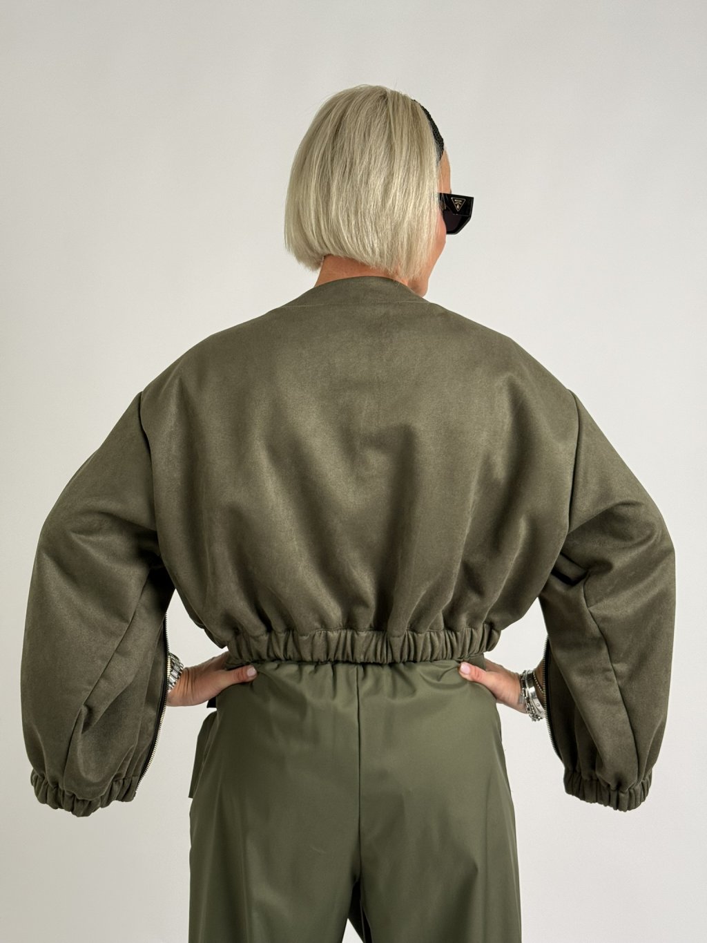 Luxusné krátke sako semišového vzhľadu s elastickým pásom, ktorý sa tiahne po celej dĺžke predného dielu, so zapínaním na zlatú pracku, s vnútornou podšívkou. Rukávy sú zdobené zlatými zipsami, ktoré sa dajú rozopnúť.