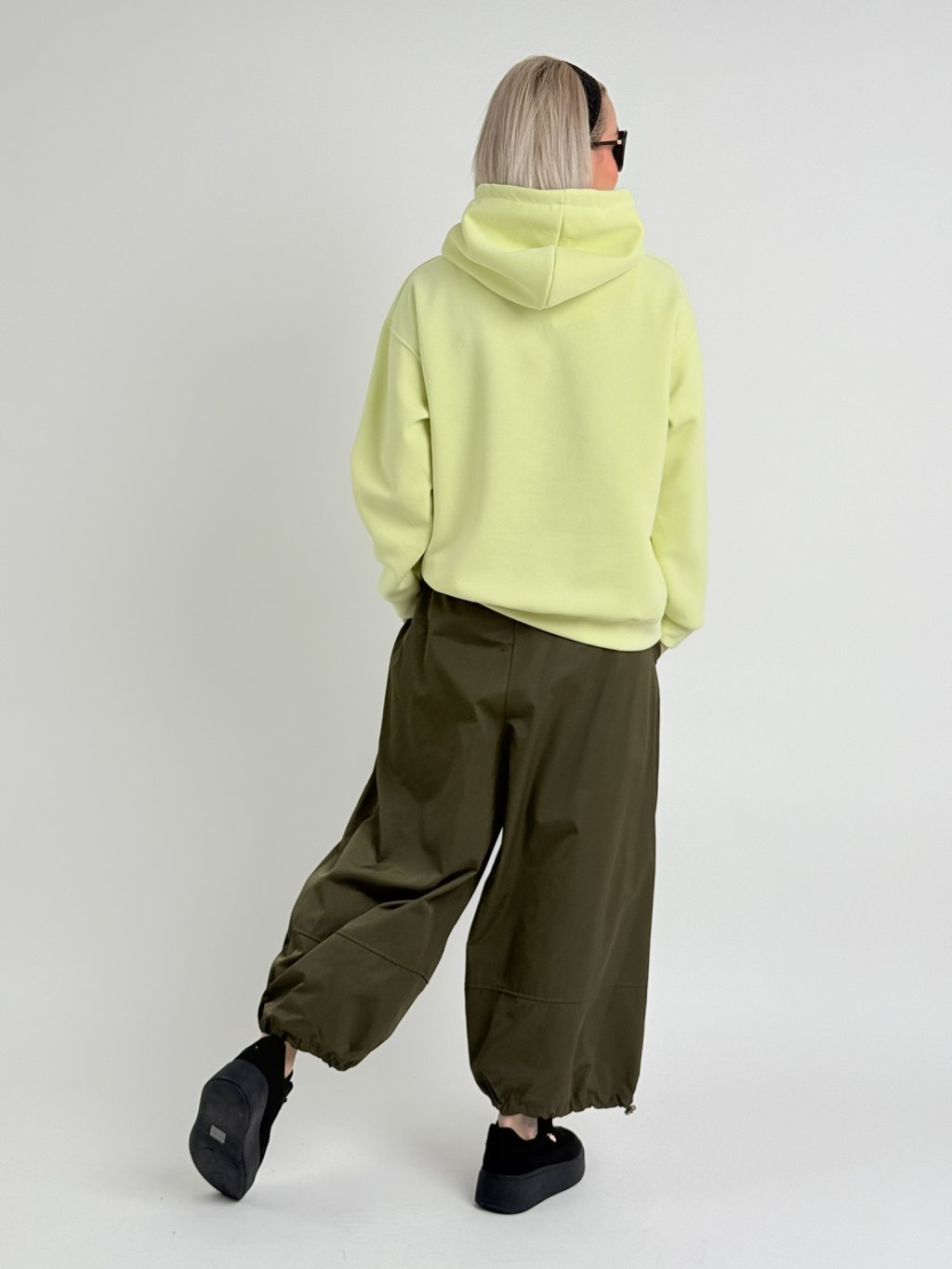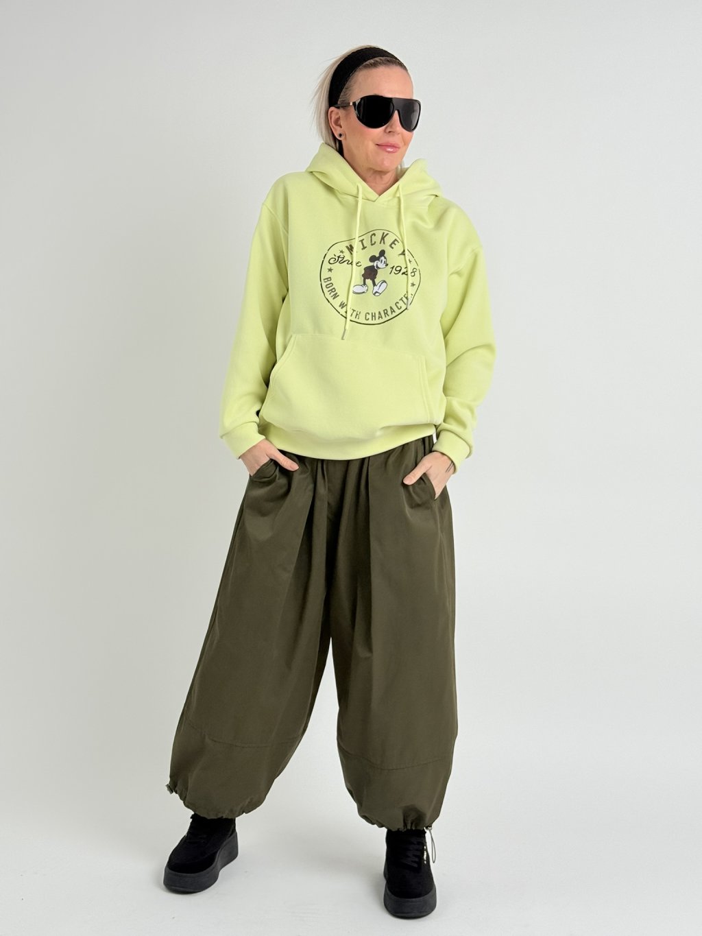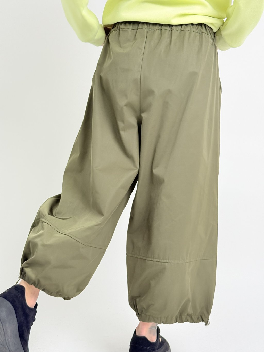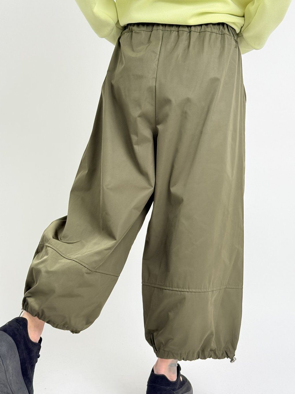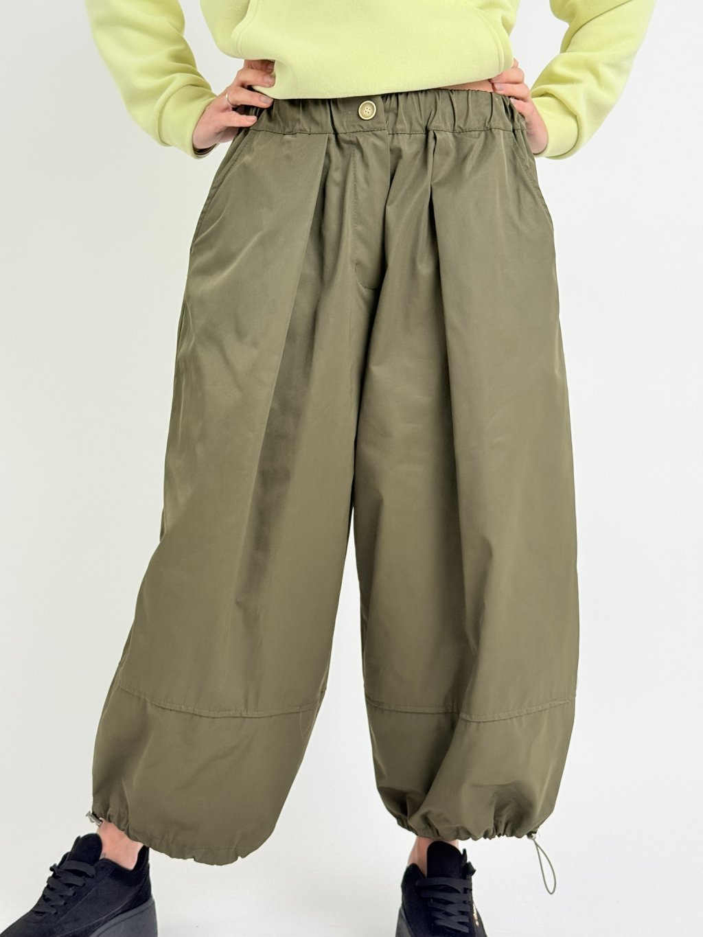 Nohavice balónového strihu s elastickým pásom, zapínaním na zips a šnúrkou na konci nohavíc. Nohavice majú bočné všité vrecká.