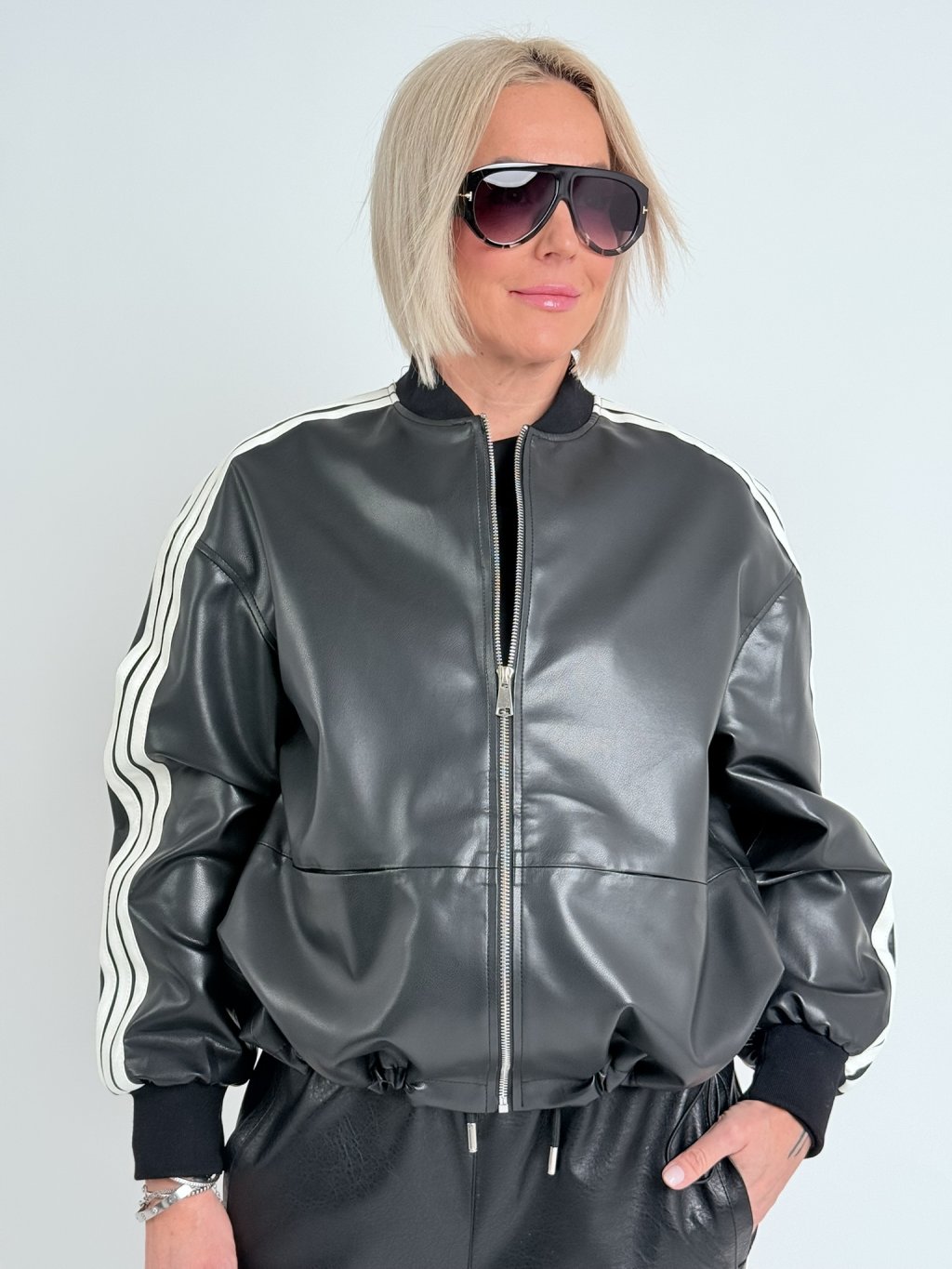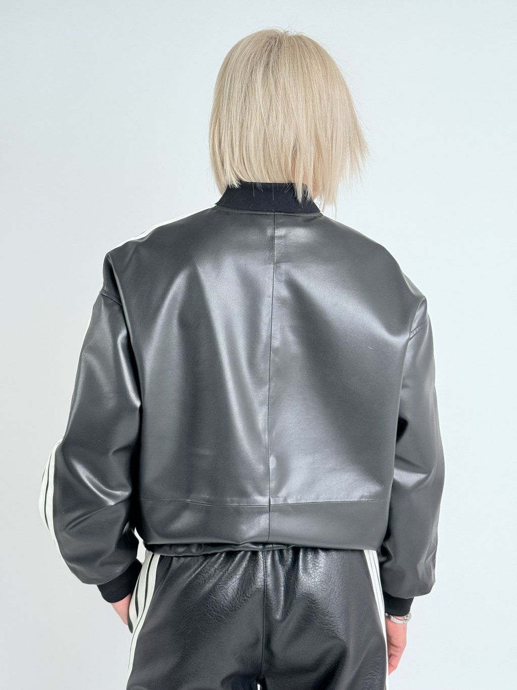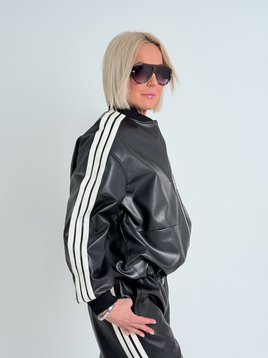 Skvelá koženková bunda s podšívkou, bielymi pruhmi na rukávoch, so zapínaním na zips, šnúrkou na stiahnutie v spodnej časti. Záplaty na krku a rukávoch.