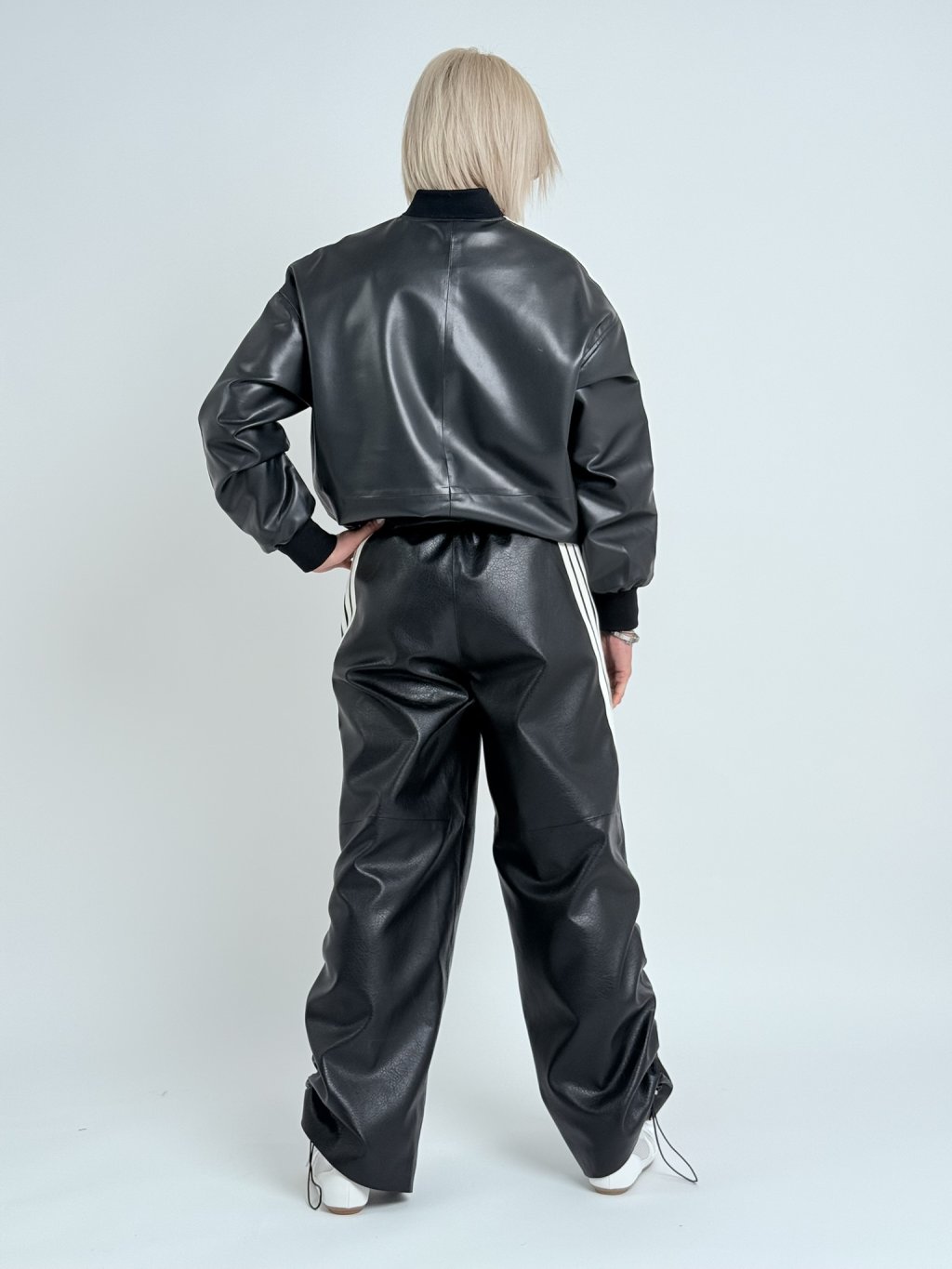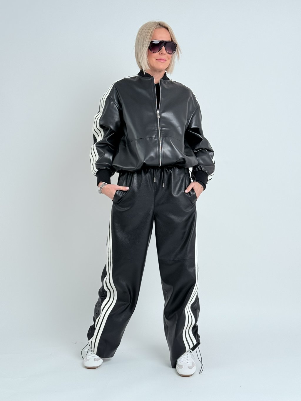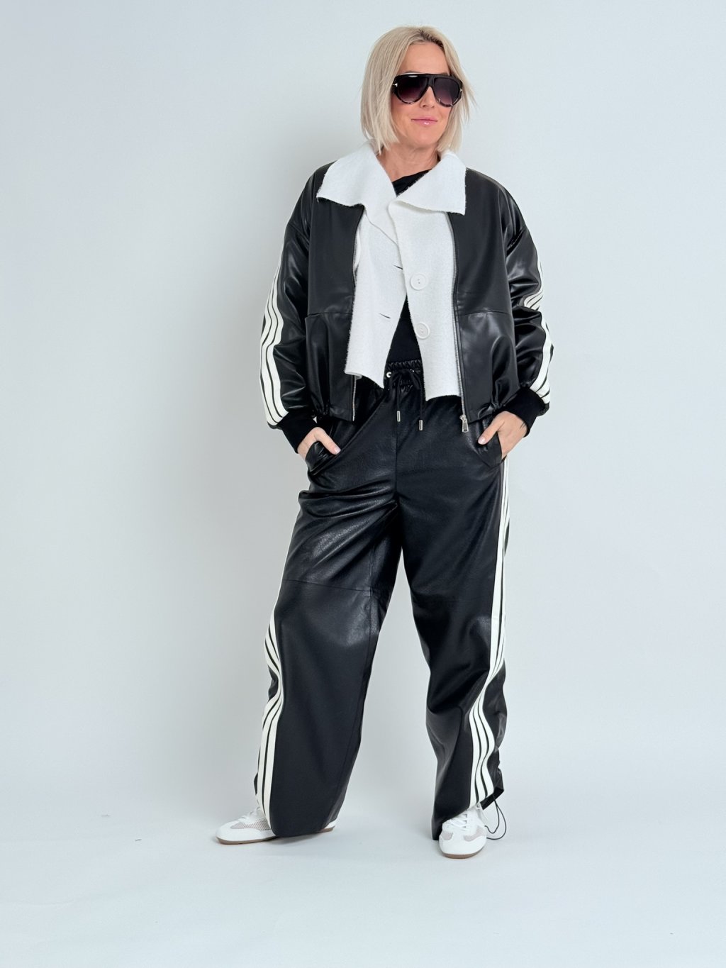 Skvelá koženková bunda s podšívkou, bielymi pruhmi na rukávoch, so zapínaním na zips, šnúrkou na stiahnutie v spodnej časti. Záplaty na krku a rukávoch.