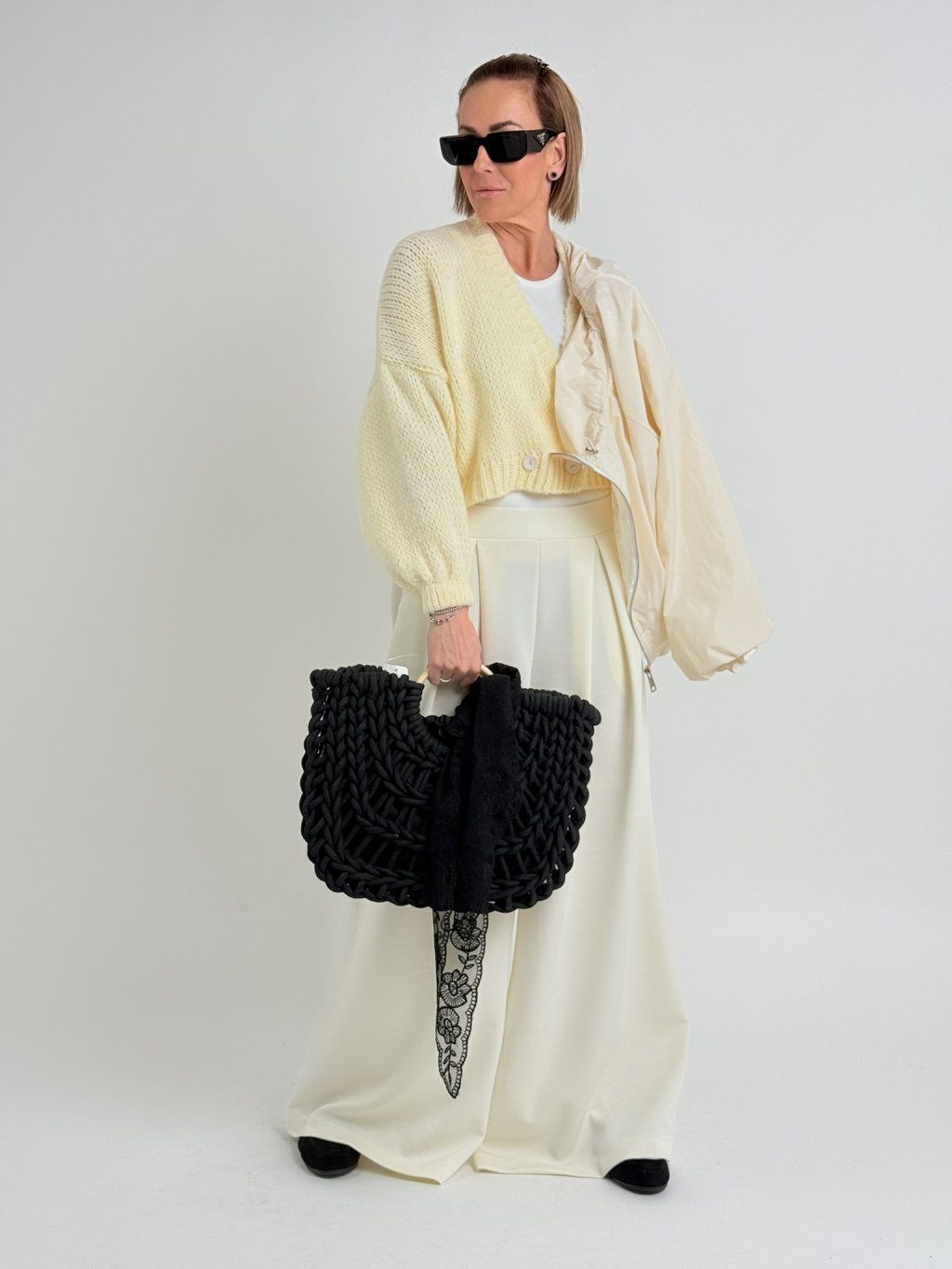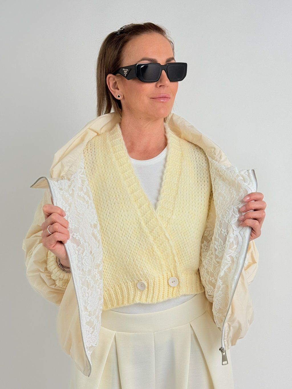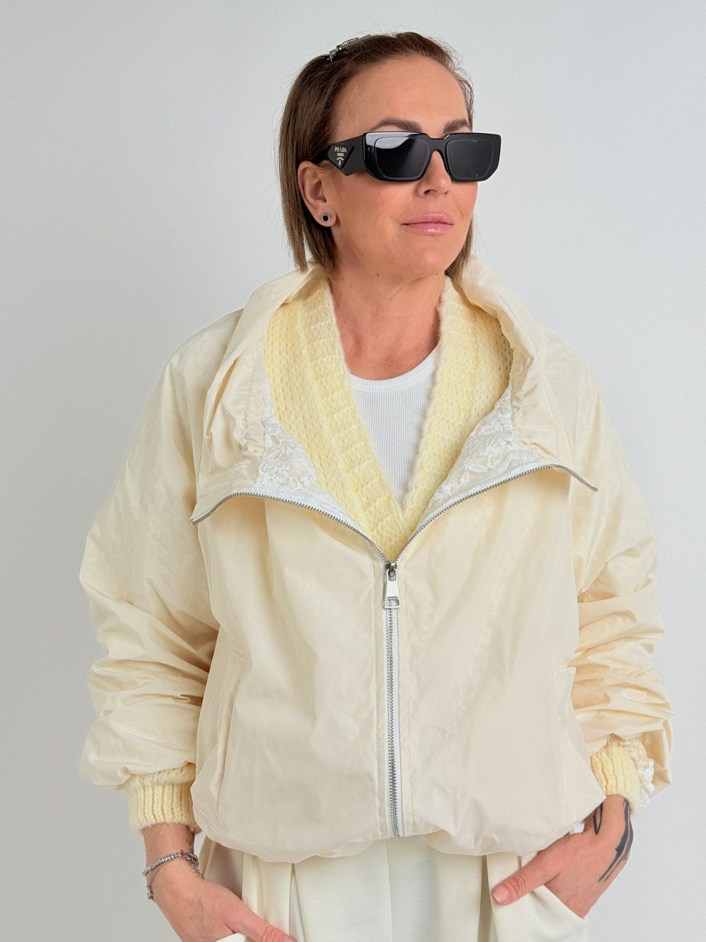 Čipkou podšitá, na zips, s golierom na šnúrku, hrubá bunda. Konce rukávov a spodný lem s elastickými manžetami