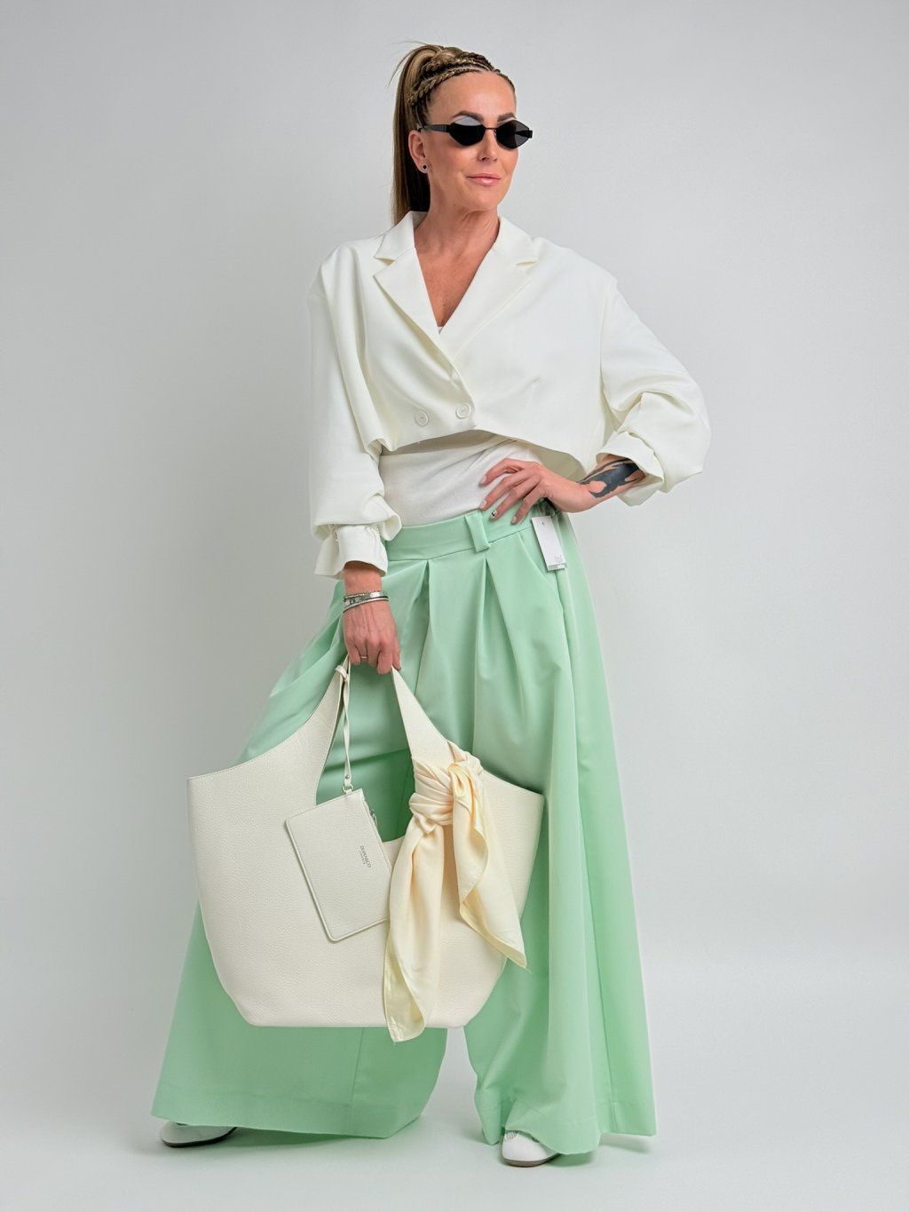 Luxusné, kratšie, oversize sako s klopami, zapínanie na 2 gombíky, ramenné vypchávky.