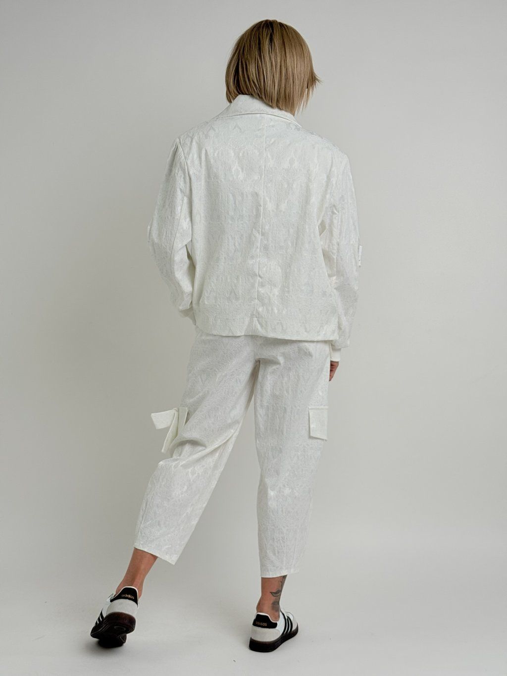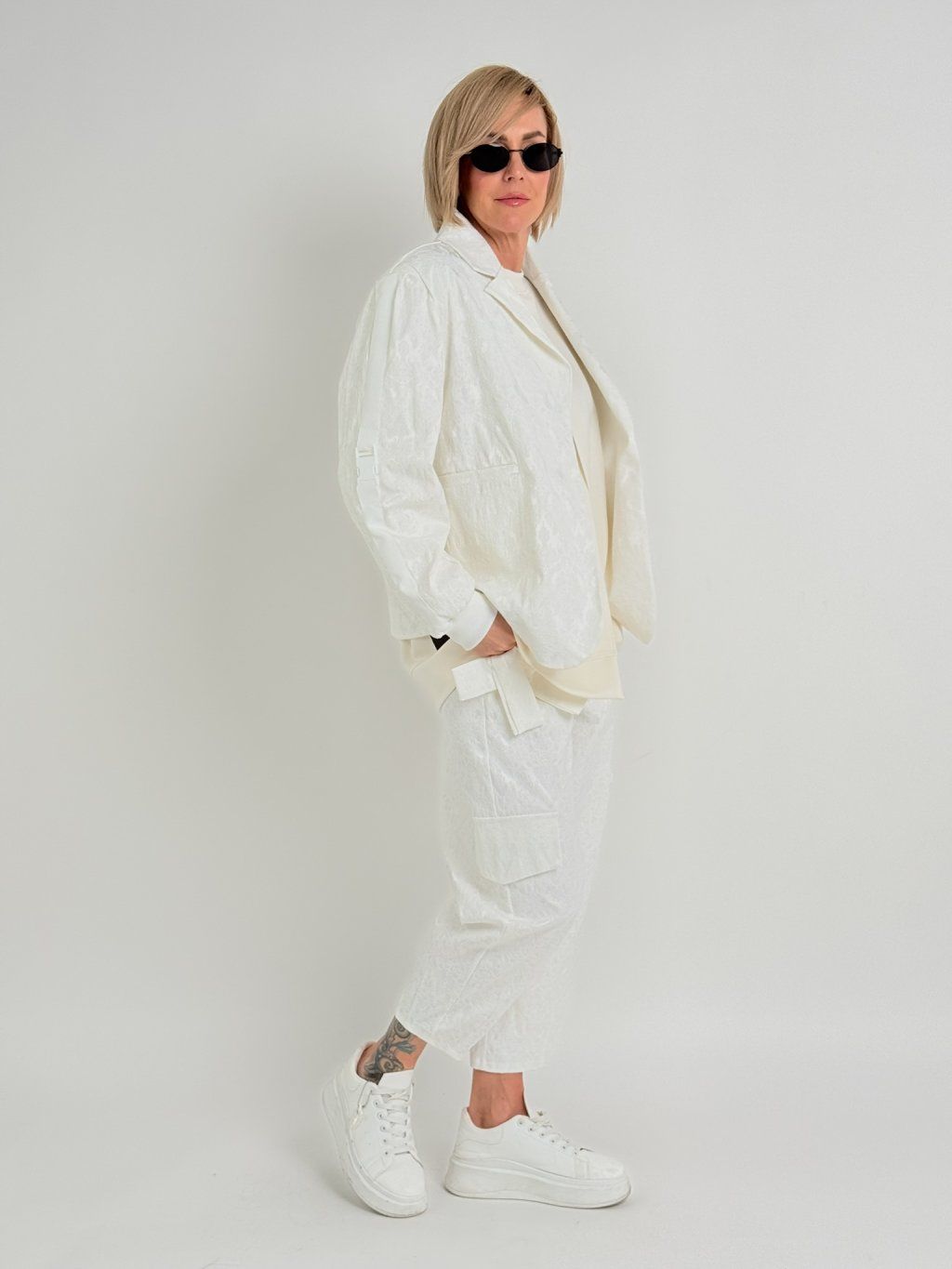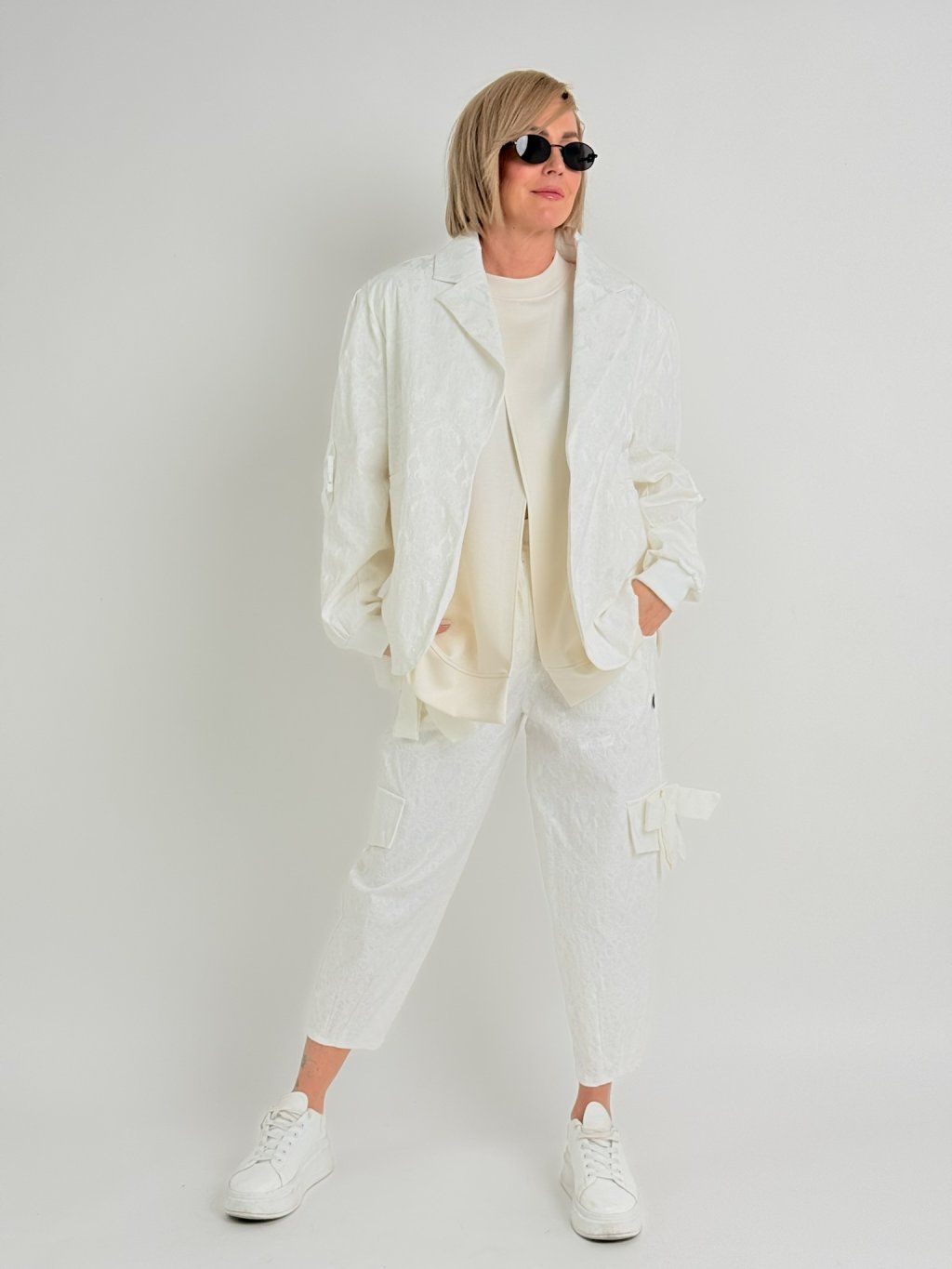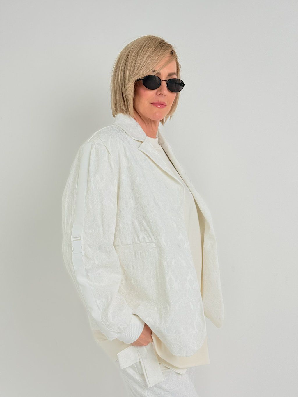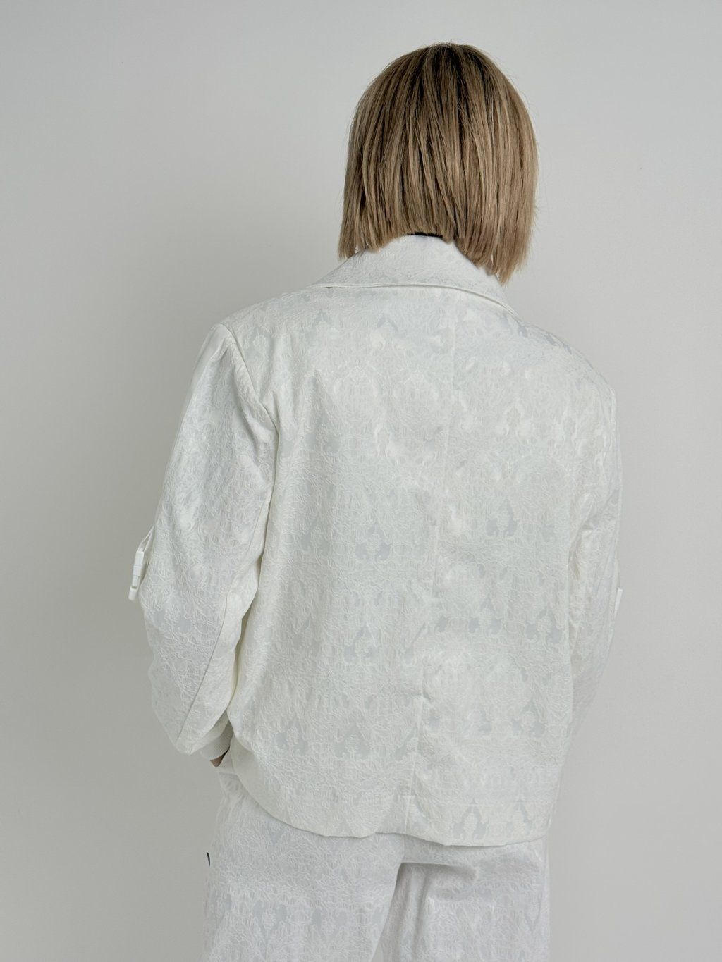 Bunda nadrozmernej veľkosti s reliéfnym vzorom, podšívkou, bez zapínania, s nášivkou a lampasmi na rukávoch.