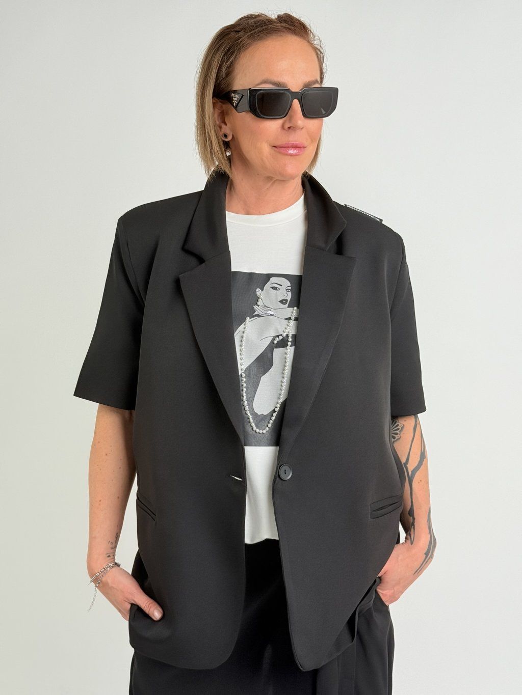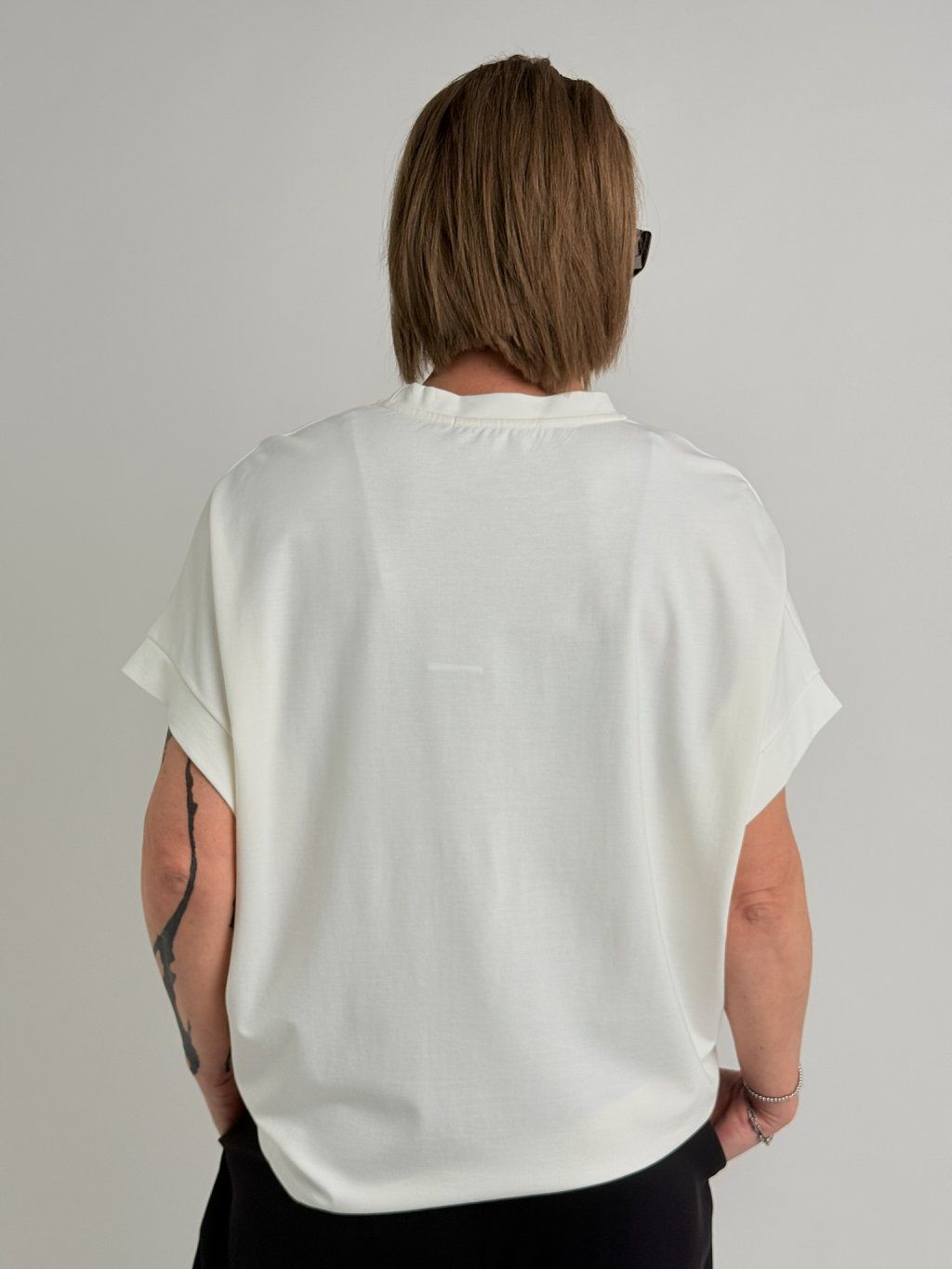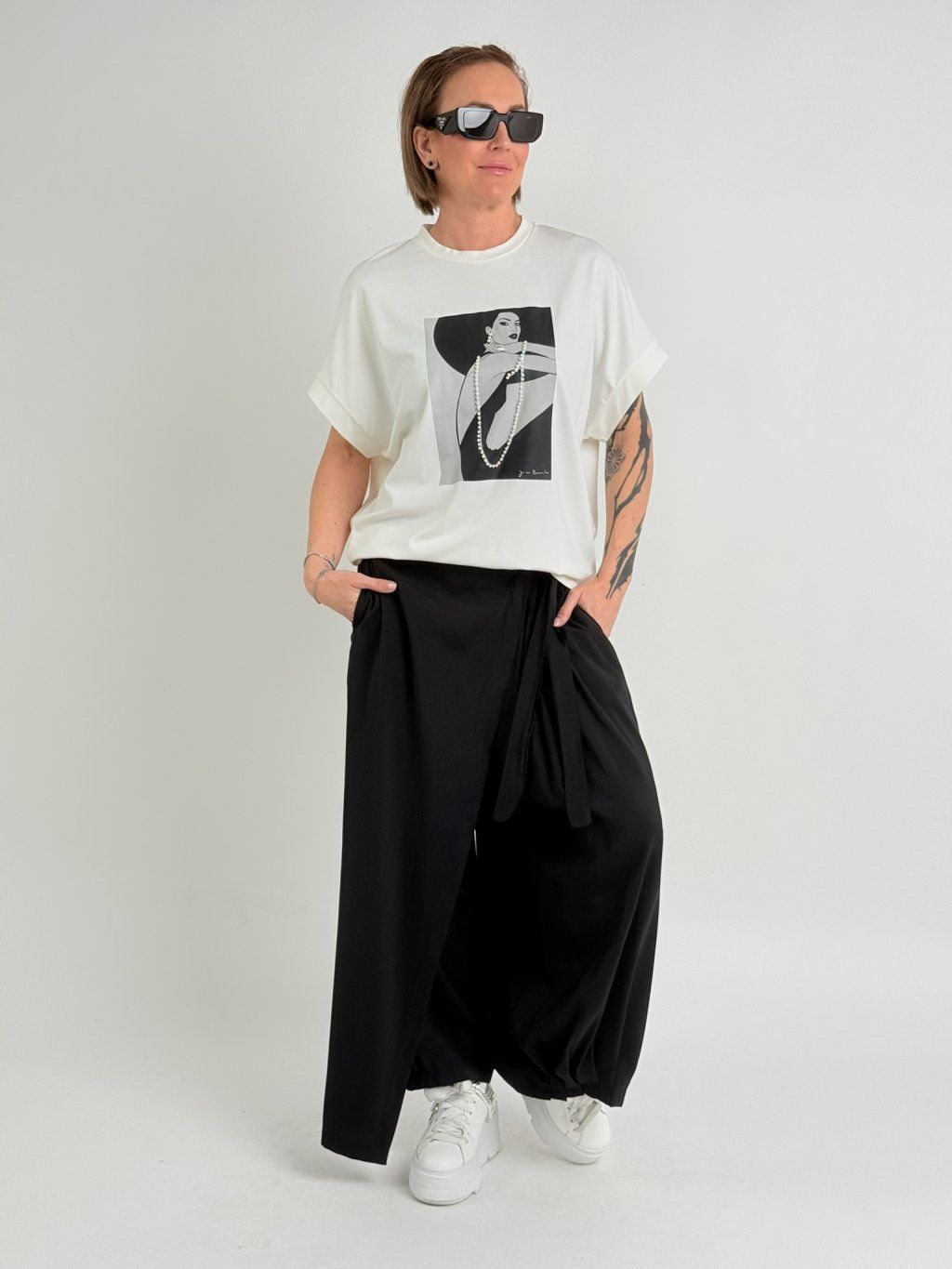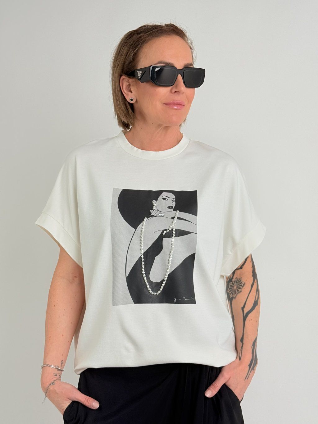 Tričko so spadnutými rukávmi a dámskou potlačou na prednej strane s našitým perlovým náhrdelníkom.