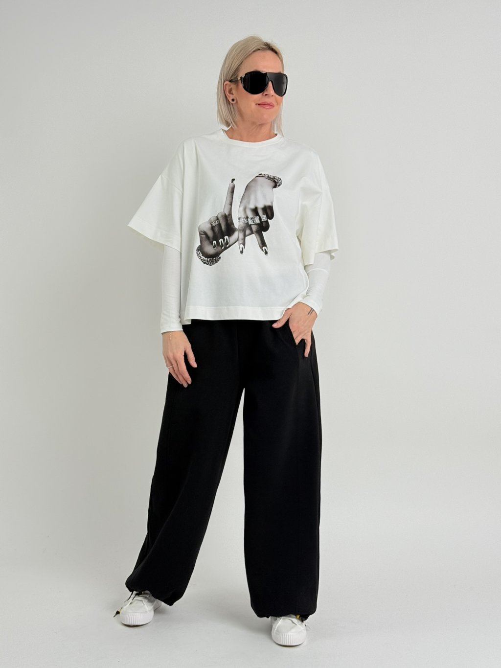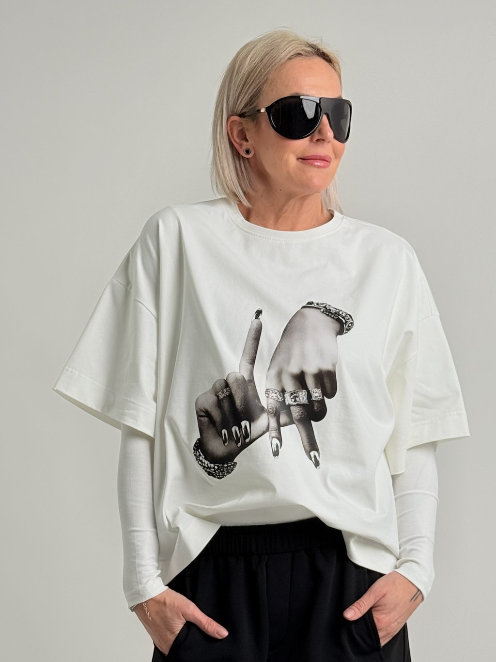 Oversize tričko s okrúhlym výstrihom, rukávmi v dĺžke po lakte a obrázkom rúk s prstencami na prednej strane a nápisom na spodnej časti chrbta.