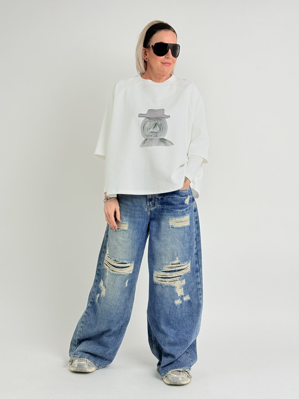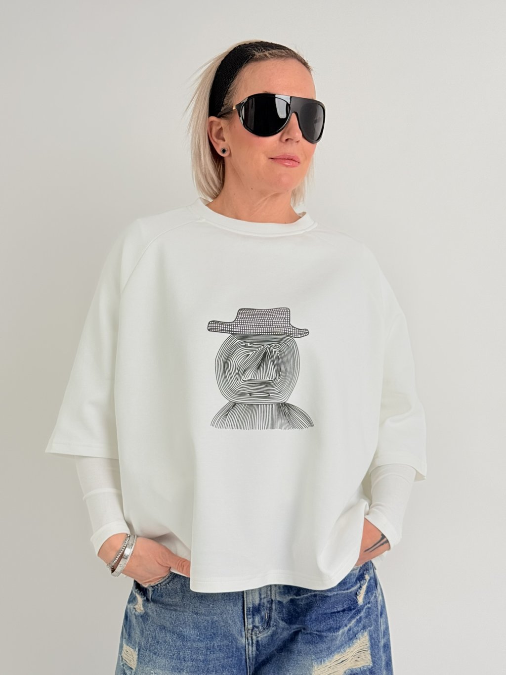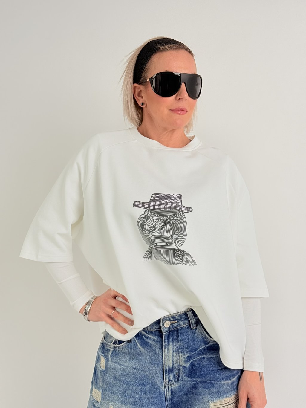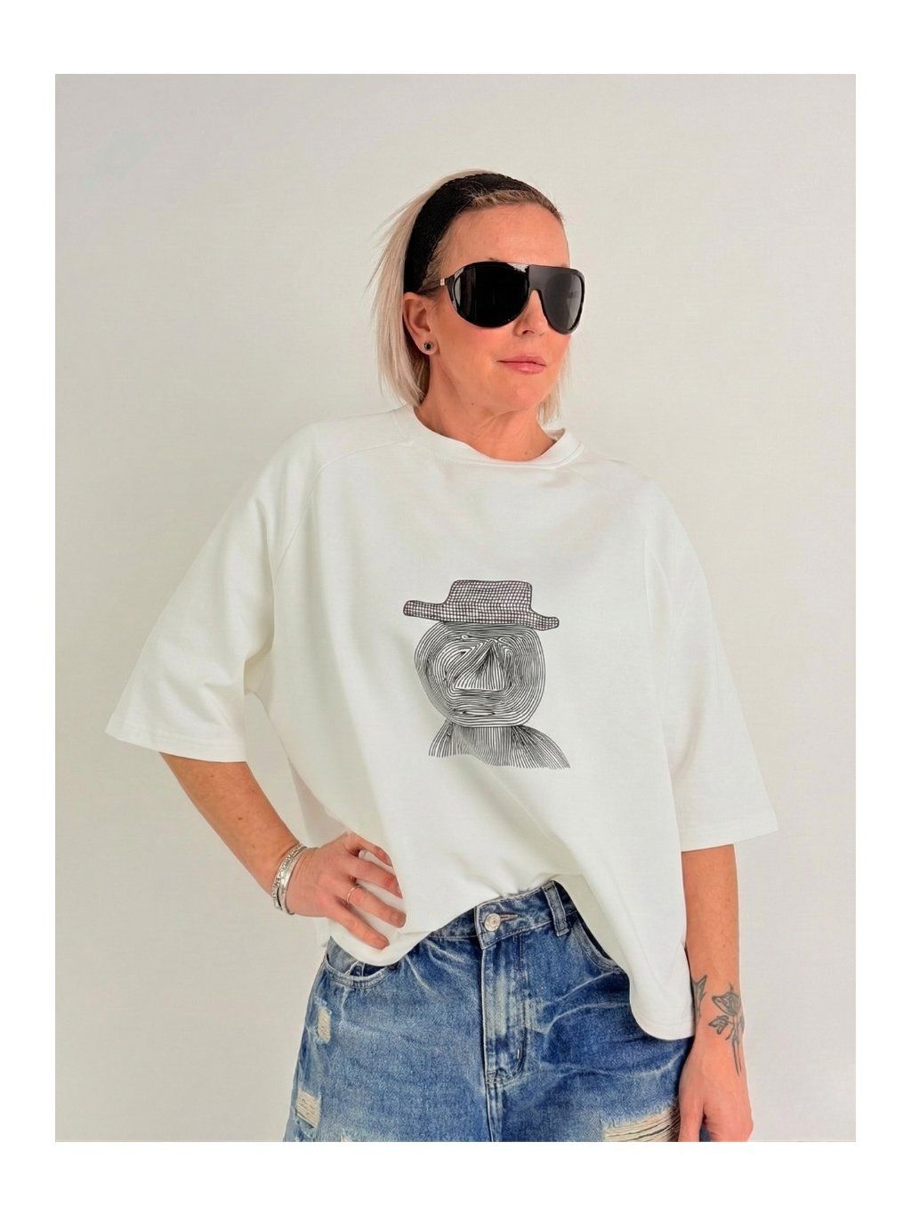 Voľnejšie, dlhšie tričko s okrúhlym výstrihom, raglánovými rukávmi po lakeť a abstraktnou potlačou na prednej strane.