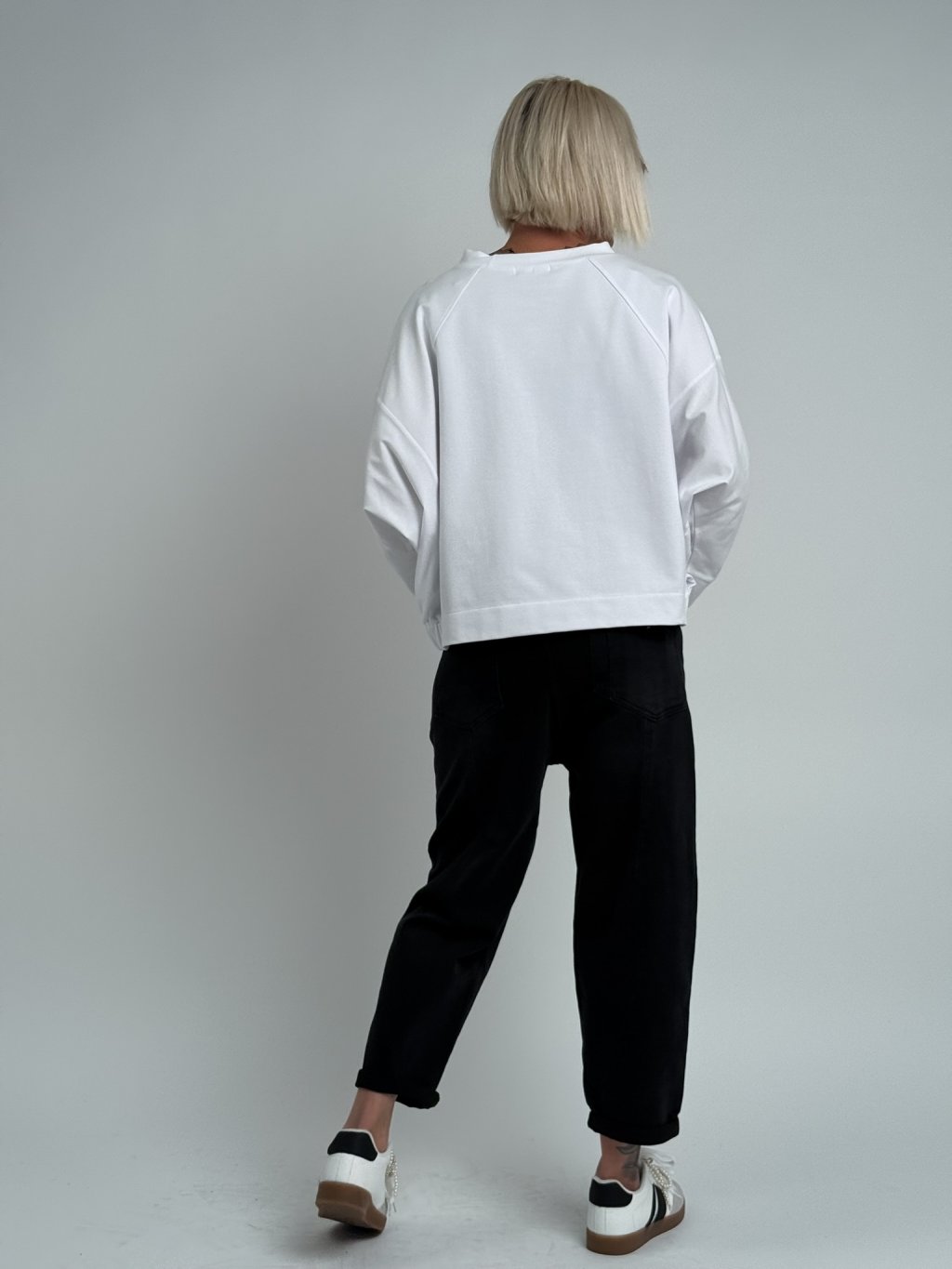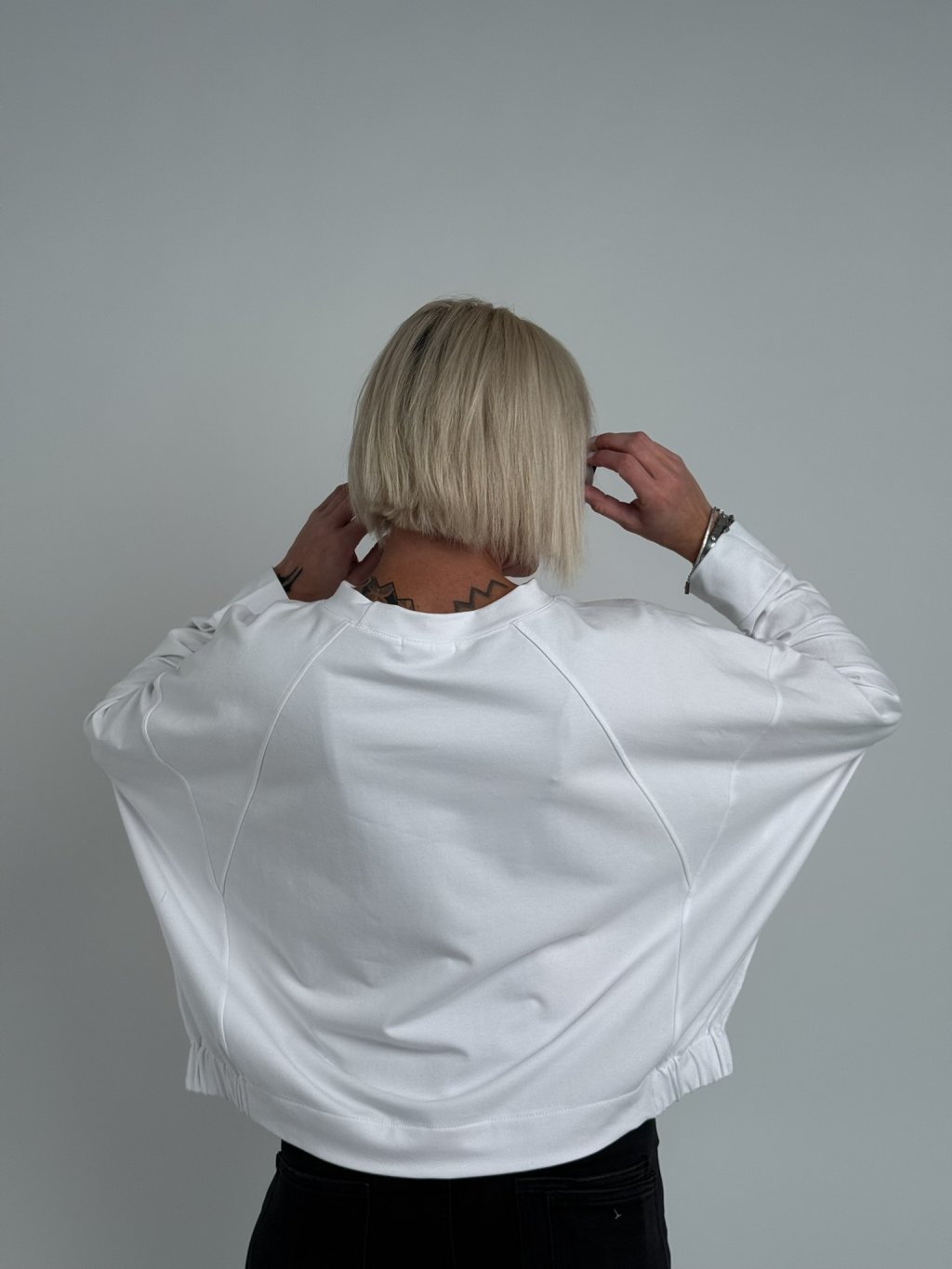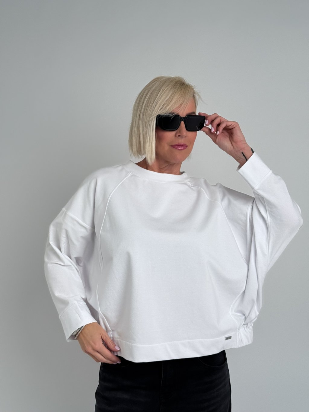 Krásna, ľahká mikina nadrozmernej veľkosti v netopierom strihu s elastickým spodným okrajom na bokoch a 7/8 dlhými rukávmi.