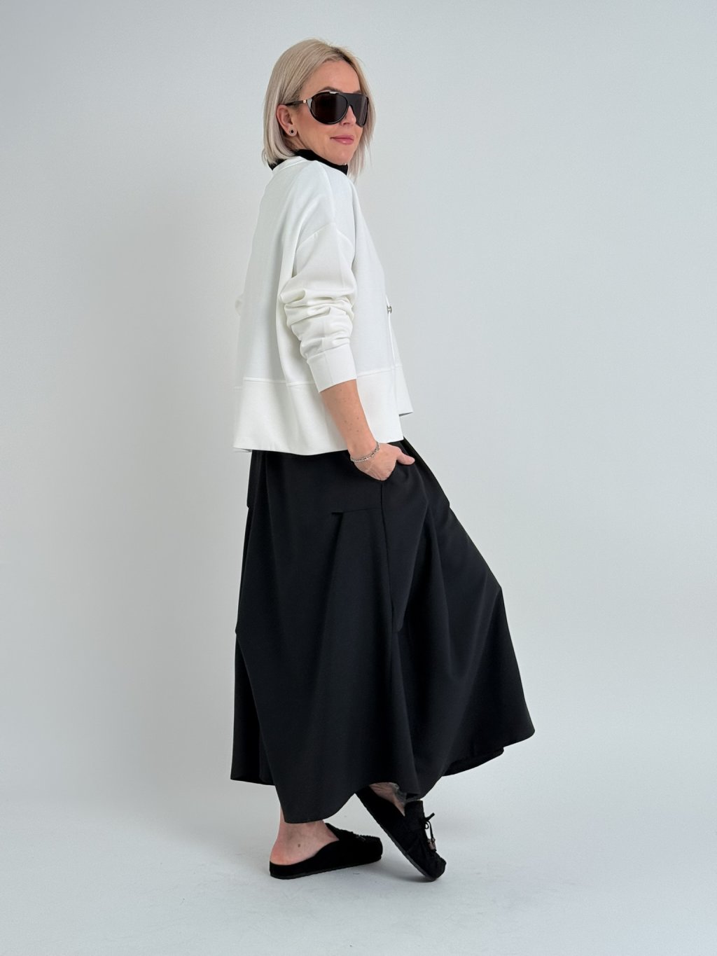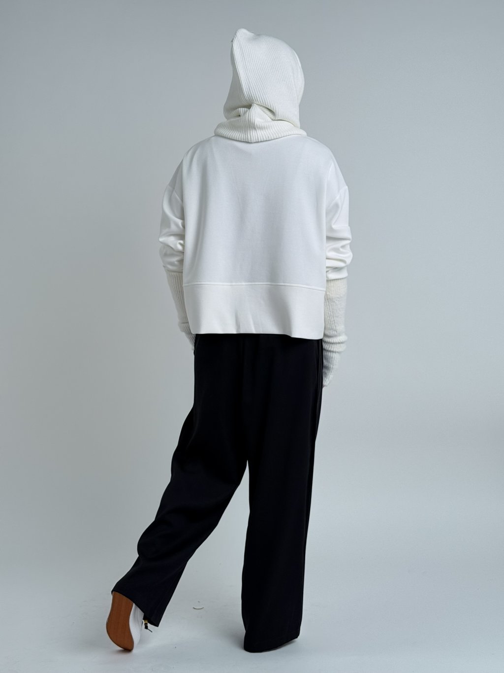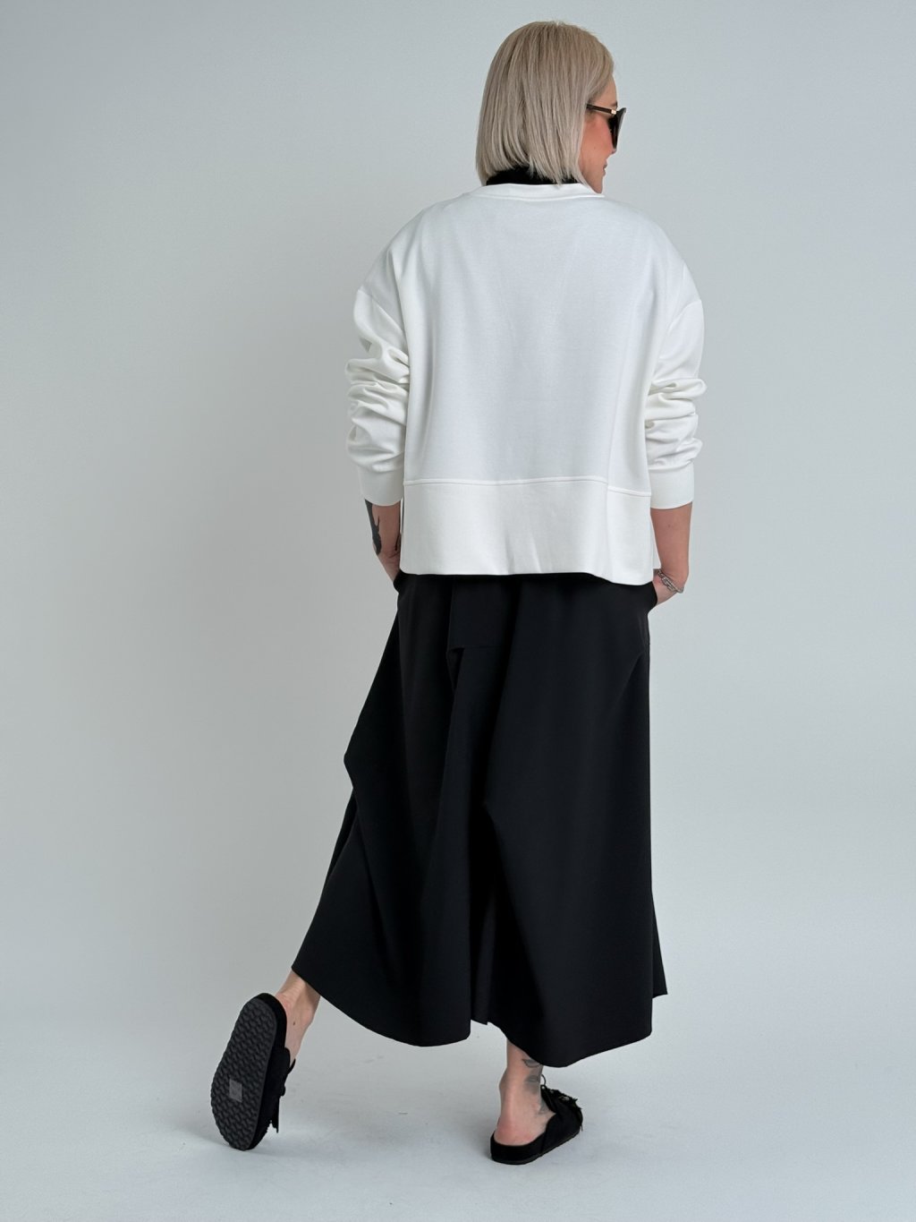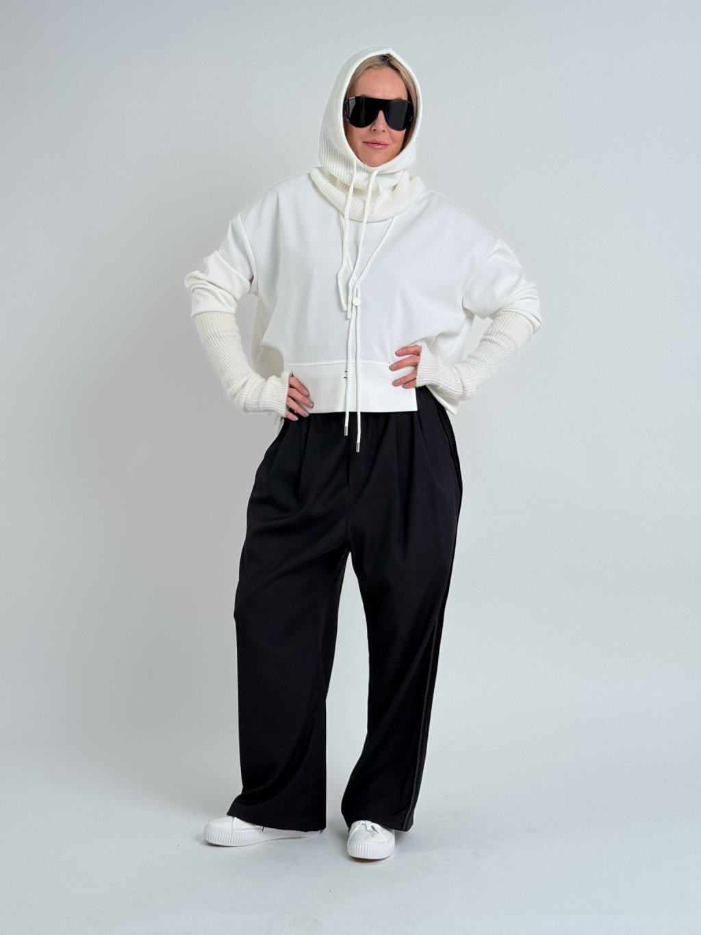 Voľne padnúca mikina s rozparky na nerovnom prednom diele, kde sú aj ozdobné šnúrky, ktoré tvoria písmeno V.