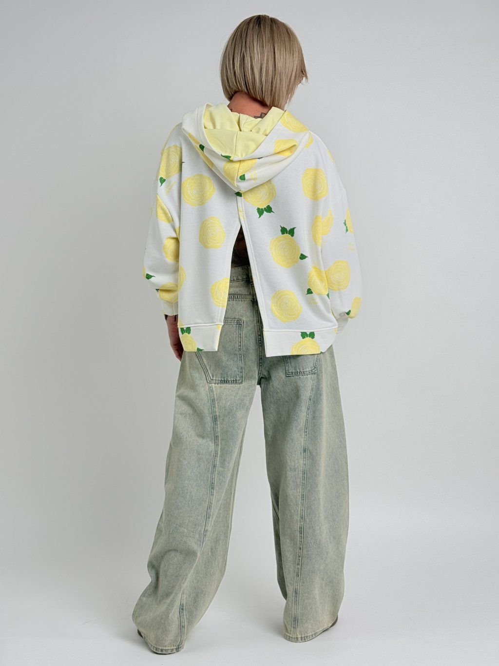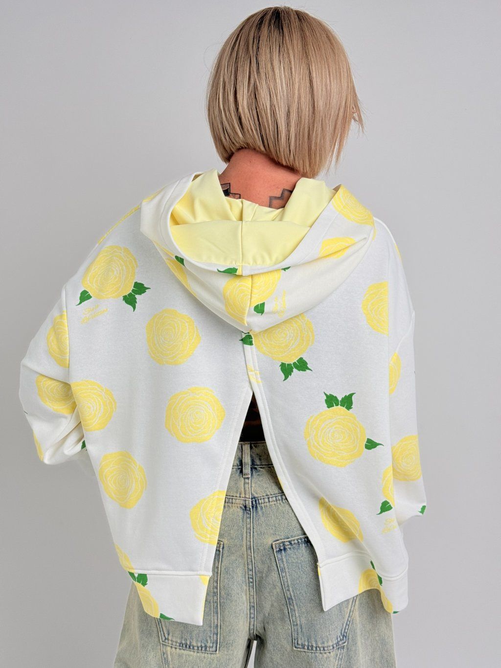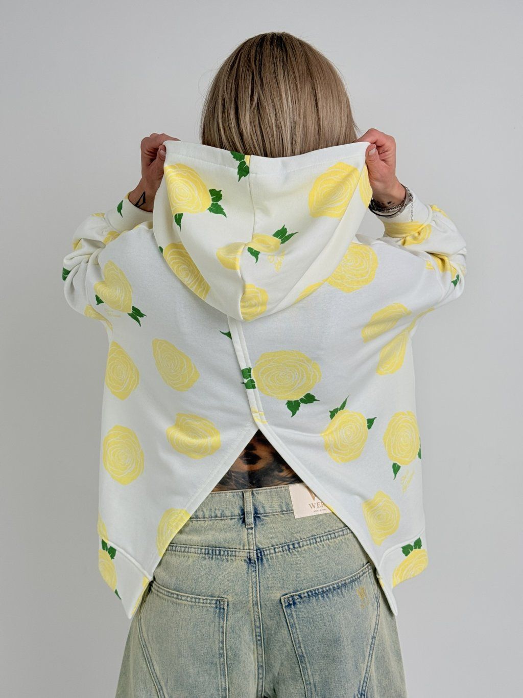Biela mikina nadrozmernej veľkosti so žltými kvetmi, dlhými rukávmi a prekríženým chrbtom.