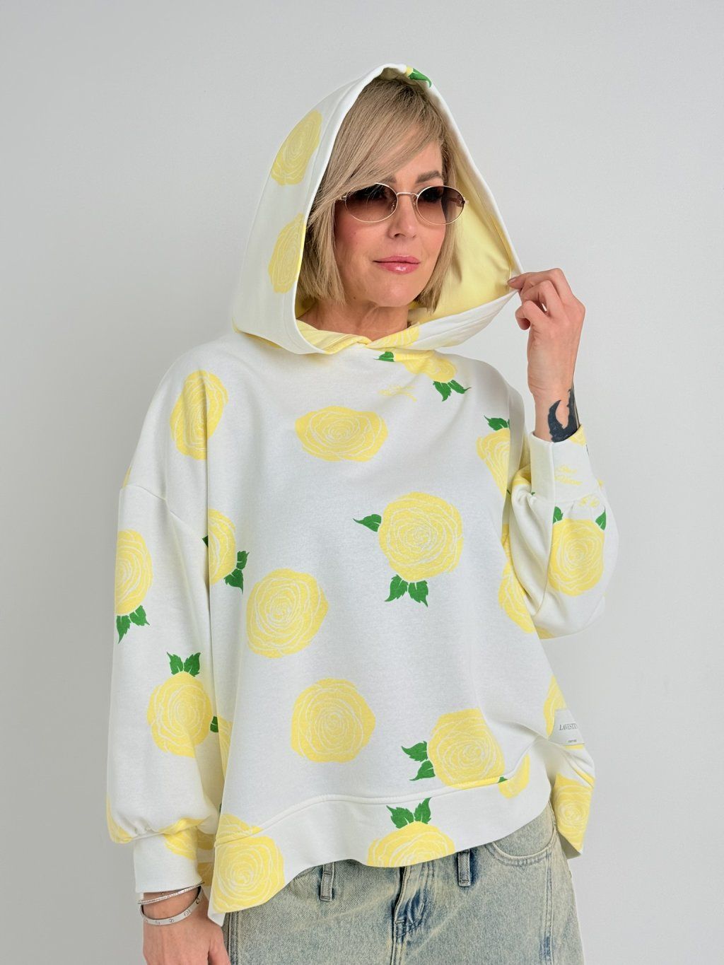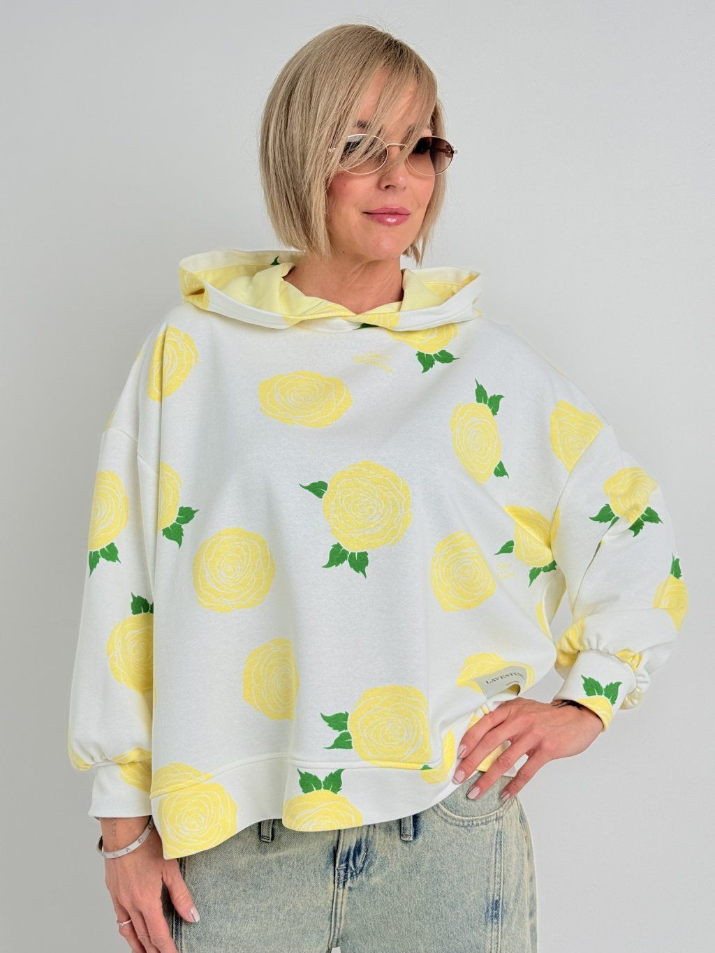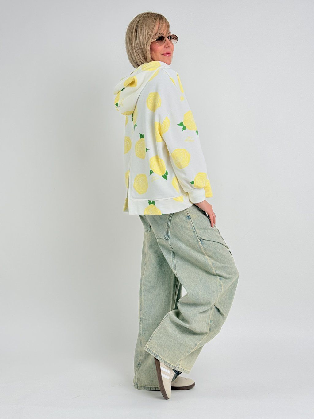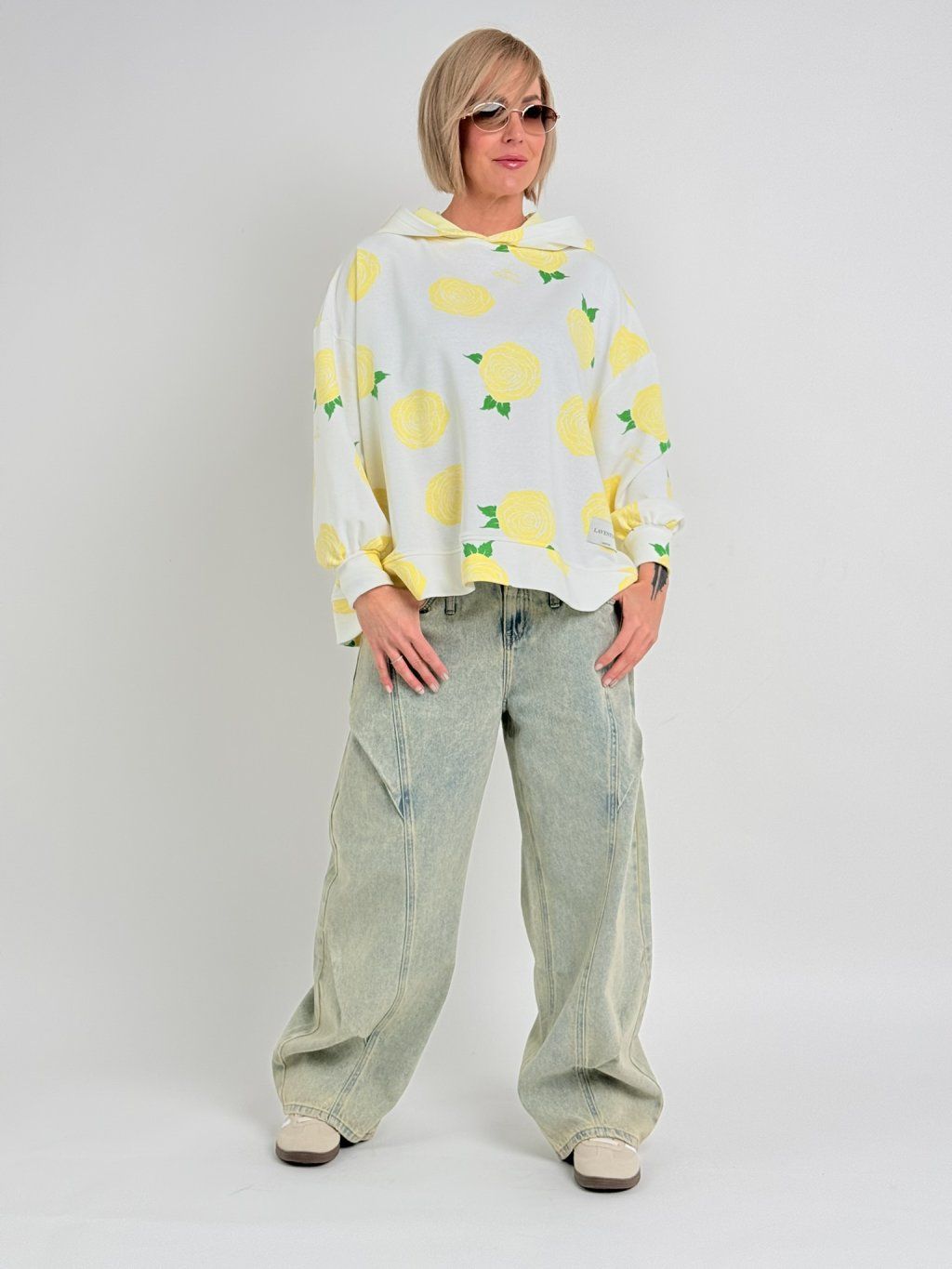 Biela mikina nadrozmernej veľkosti so žltými kvetmi, dlhými rukávmi a prekríženým chrbtom.