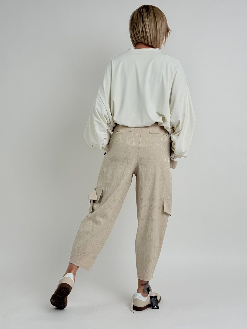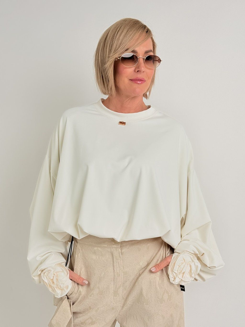 Nadrozmerná tunika netopierieho strihu s volánovými rukávmi ukončenými manžetou s kvetinovou aplikáciou a šnúrkou v páse,